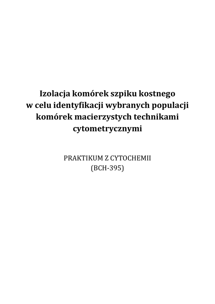Izolacja komórek szpiku kostnego w celu identyfikacji wybranych populacji komórek macierzystych technikami cytometrycznymi PRAKTIKUM Z CYTOCHEMII (BCH-395) "Izolacja komórek szpiku kostnego…" BCH-395 TEMAT ĆWICZENIA: "Izolacja komórek szpiku kostnego w celu identyfikacji wybranych populacji komórek macierzystych technikami cytometrycznymi" Szpik kostny zawiera heterogenną populację komórek macierzystych hematopoetycznych i niehematopoetycznych. Do tych drugich należą: 1) komórki progenitorowe śródbłonka naczyń (ang. Endothelial progenitor cells; EPC); 2) mezenchymalne komórki macierzyste/ multipotencjalne komórki stromalne (ang. Mesenchymal stem cells; multipotent stromal cells; MSC); 3) multipotencjalne komórki progenitorowe z dorosłych tkanek (ang. Multipotent adult progenitur cells; MAPC); 4) komórki MIAMI (ang. Marrow Isolated Adult Multilineage Inducible cells); 5) multipotencjalne komórki macierzyste z dorosłych tkanek (ang. Multipotent Adult Stem Cells; MACS); 6) bardzo małe komórki macierzyste o cechach komórek embrionalnych (ang. Very Small Embryonic-Like stem cells; VSELS). Cechami charakterystycznymi komórek macierzystych są ich zdolności do samoodnawiania (ang. self-renewal) oraz jednocześnie do różnicowania się w komórki ukierunkowane do określonych linii rozwojowych. Głównym założeniem wykonywanego ćwiczenia jest identyfikacja populacji komórek VSELs. Komórki te zostały po raz pierwszy zidentyfikowane w mysim szpiku kostnym, jako bardzo małe komórki o fenotypie Sca-1+/Lin-/CD45-. Wraz z wiekiem organizmu spada zawartość komórek VSELs w dorosłym szpiku kostnym. Opisywane komórki wykazują ekspresję licznych markerów komórek pluripotencjalnych takich jak: SSEA-1, Oct-4, Nanog, Rexo-1, Rif-1 oraz wysoką aktywność telomerazy. Wśród prymitywnych cech komórek VSELs należałoby wymienić: 1) bardzo mały rozmiar/ średnicę tych komórek (3,63±0,09µm w ISS); 2) relatywnie duże jądro komórkowe, otoczone wąskim rąbkiem cytoplazmy oraz wynikający z tego wysoki stosunek jądra do cytoplazmy; 3) jądro komórkowe wypełnione euchromatyną. Główną metodą badawczą pozwalająca fenotypować różne populacje komórek jest cytometria przepływowa. Pozwala ona na szybką analizę dużej liczby obiektów w stosunkowo krótkim czasie, uwzględniając relatywną ocenę wielkości komórek, ich ziarnistości (stopnia skomplikowania ultrastruktury) oraz fluorescencji emitowanej przez te komórki. Ogólna zasada cytometrii przepływowej polega na identyfikowaniu antygenów powierzchniowych lub wewnątrzkomórkowych przy użyciu swoistych przeciwciał monoklonalnych sprzężonych z fluorochromami. Znakowane fluorochromami komórki przepływające przez komorę pomiarową, są naświetlane wiązką światła laserowego, a następnie rozpraszają i emitują światło, powodując zmiany jego natężenia. Równocześnie mierzone jest światło rozproszone oraz światło wzbudzone emitowane przez fluorochromy. Impulsy świetlne przetwarzane są na impulsy elektryczne w systemie fotopowielaczy, a następnie analizowane za pomocą komputera. Wyniki pomiarów uzyskane w cytometrze przepływowym można przedstawić w postaci dokładnych danych liczbowych, jak również w postaci wykresów. Najczęściej wyniki są prezentowane w postaci histogramów lub cytogramów (wykres na którym komórki są odzwierciedlone w postaci kropek, których położenie w układzie 2 "Izolacja komórek szpiku kostnego…" BCH-395 współrzędnych jest proporcjonalne do wielkości mierzonego parametru). Wszystkie komórki, które mają taki sam model rozpraszania światła, ukazują się na cytogramie jako pojedyncza kropka. Jedna kropka może zatem reprezentować pojedynczą komórkę lub kilka tysięcy komórek. Jeżeli w badanej próbce oznacza się więcej niż jeden antygen, wówczas używa się dwu lub więcej przeciwciał monoklonalnych wyznakowanych różnymi barwnikami. Sygnały emitowane przez te barwniki mogą zachodzić na siebie, dlatego też należy stosować kompensację w celu prawidłowej analizy sygnałów fluorescencji. Cel doświadczenia: Celem ćwiczenia jest izolacja oraz barwienie immunofluorescencyjne komórek szpiku kostnego myszy w celu identyfikacji wybranych populacji komórek macierzystych technikami cytometrycznymi. Przebieg doświadczenia: (Praca w zespołach dwuosobowych. Na każdy zespół przypada jedna mysz.) 1. Z otrzymanej myszy wyizolować z kończyn dolnych kości udowe oraz piszczelowe. Kości umieścić na szalce (60mm) w 5 ml medium DMEM F12. 2. Po odcięciu nasad kości, za pomocą strzykawki 1ml z igłą, wypłukać szpik kostny do nowej szalki (60mm) zawierającej 5 ml medium DMEM F12. Po zakończeniu wypłukiwania szpiku z kości, rozdrobnić szpik poprzez kilkukrotne wciągnięcie i wyciągnięcie go do strzykawki. 3. Otrzymaną zawiesinę komórek przefiltrować przez filtr o średnicy porów 70 µm do probówki o objętości 15 ml. Dopełnić medium do objętości 15 ml. 4. Probówkę z komórkami zwirować (1800 rpm., 8 min., RT). 5. Zlać nadsącz, natomiast pelet rozpipetować w 1 ml Lysing Buffer (1x BD ParmLyse). Dodać w/w 1 ml Lysing Buffer. 6. Lizę erytrocytów prowadzić przez 8 min w RT. 7. Dopełnić medium do objętości 15 ml. 8. Probówkę z komórkami zwirować (1800 rpm., 8 min., RT). 9. Zlać nadsącz, pelet zawiesić w 500 µl DMEM F12 + 2% FBS. 10. Policzyć komórki w zawiesinie w komorze Burckera. 11. Komórki wybarwić immunofluorescencyjnie przeciwciałami wymienionymi w tabeli, zgodnie z poniższym schematem: 3 "Izolacja komórek szpiku kostnego…" Nazwa Próbki Próbka właściwa (PW) Objętość Próbki 200 µl (5x106 komórek) Komp./ Empty 200 µl (1x106 komórek) 200 µl (1x106 komórek) 200 µl (1x106 komórek) 200 µl (1x106 komórek) Komp./ PE Komp./ PE-Cy5 Komp./ FITC BCH-395 Przeciwciało znakowane fluorescencyjnie 1. Panel markerów linii hematopoetycznych (Lin): PE Rat