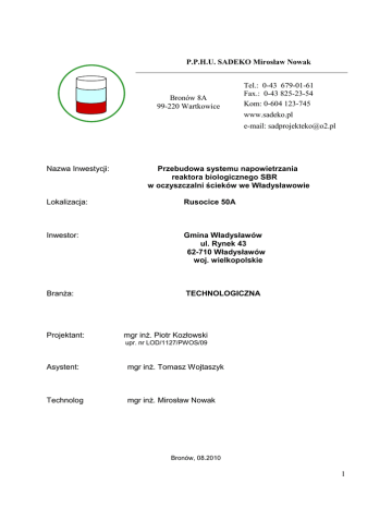 P.P.H.U. SADEKO Mirosław Nowak Bronów 8A 99-220 Wartkowice Tel.: 0-43 679-01-61 Fax.: 0-43 825-23-54 Kom: 0-604 123-745 www.sadeko.pl e-mail: [email protected] Nazwa Inwestycji: Przebudowa systemu napowietrzania reaktora biologicznego SBR w oczyszczalni ścieków we Władysławowie Lokalizacja: Rusocice 50A Inwestor: Gmina Władysławów ul. Rynek 43 62-710 Władysławów woj. wielkopolskie Branża: TECHNOLOGICZNA Projektant: mgr inż. Piotr Kozłowski upr. nr LOD/1127/PWOS/09 Asystent: mgr inż. Tomasz Wojtaszyk Technolog mgr inż. Mirosław Nowak Bronów, 08.2010 1 SPIS TREŚCI Oświadczenie projektanta...........................................................................................................4 Uprawnienia projektanta.............................................................................................................5 Zaświadczenie o przynależności do Izby....................................................................................7 1. Zakres przebudowy oczyszczalni...........................................................................................8 1.1 Roboty przygotowawcze.......................................................................................................9 1.2 Wymagania technologiczne wykonania robót......................................................................9 2. Rodzaj technologii..................................................................................................................9 3. Bilans ścieków......................................................................................................................10 4. Wymagana wydajność systemu napowietrzania...................................................................12 5. Parametry dmuchawy............................................................................................................13 6. Zasilanie i sterowanie dmuchawy.........................................................................................13 7. Ruszt napowietrzający..........................................................................................................14 8. Odpady generowane przez oczyszczalnię po rozbudowie systemu napowietrzania............15 9. Sposoby gospodarowania wytwarzanymi odpadami............................................................16 10. Wiata stacji dmuchaw ........................................................................................................17 2 SPIS RYSUNKÓW 1. Projekt zagospodarowania terenu 2. T-1 Rzut reaktora 3. T-2 Przekrój A-A 4. T-3 Elementy rusztu napowietrzającego 5. T-4 Profil kolektora powietrza 6. T-5 Rozmieszczenie betonowych podpór 7. K-1 Fundament dmuchawy 8. K-2 Rzut fundamentów 9. K-3 Rzut przyziemia 10. K-4 Rzut konstrukcji dachu 11. K-5 Rzut połaci dachu 12. K-6 Przekrój A-A 13. K-7 Elewacja frontowa 14. K-8 Elewacja tylna 15. K-9 Elewacja boczna I 16. K-10 Elewacja boczna II 3 OŚWIADCZENIE Wymagane zgodnie z art. 20 ust. 4 ustawy z dnia 7 lipca 1994r. Prawo budowlane (Tekst jednolity Dz. U. z 2006r. Nr 156, poz. 1118 z późniejszymi zmianami). Oświadczam, że dokumentacja dotycząca inwestycji obejmującej: Rozbudowę i przebudowę oczyszczalni ścieków dla gminy i miasta Stawiszyn obejmująca: Przebudowę systemu napowietrzania reaktora biologicznego SBR w oczyszczalni ścieków we Władysławowie sporządzona została zgodnie z obowiązującymi przepisami, zasadami wiedzy technicznej oraz jest kompletna z punktu widzenia celu, któremu ma służyć. Podpis projektanta Bronów, 08.2010r. 4 5 6 7 1. Zakres przebudowy oczyszczalni Przedsięwzięcie dotyczy przebudowy systemu napowietrzania reaktora biologicznego SBR w oczyszczalni ścieków we Władysławowie zlokalizowanej w Rusocicach nr 50A na działkach: 818/38 o pow. 0,0459 ha i 818/39 o pow. 0,4177 ha. Łączna powierzchnia działek przeznaczonych pod oczyszczalnię wynosi 0,4636ha. Rozbudowa systemu napowietrzania zamyka się w granicach istniejącego terenu oczyszczalni. Zadaniem rozbudowy systemu napowietrzania jest: 1. Zwiększenie wydajności napowietrzania poprzez zmianę systemu napowietrzania z dotychczasowego średniopęcherzykowego przy wykorzystaniu turbiny Crowna na system drobnopęcherzykowy 2. Zmniejszenie energochłonności systemu napowietrzania poprzez zastosowanie systemu drobnopęcherzykowego. 3. Zwiększenie przepustowości oczyszczalni z Qśrd = 250 m3/d do Qśrd = 350 m3/d poprzez modyfikację cykli pracy reaktora SBR przy wykorzystaniu innowacyjnego modułu obliczeniowego BPN–3–SAD oraz zwiększenie wydajności systemu napowietrzania. 4. Modernizację dekantacji ścieków oczyszczonych do odbiornika poprzez zastosowanie dekantera pływającego z separacją zawiesin zamiast dotychczasowego układu pompowego. Rozwiązania związane z przebudową systemu napowietrzania reaktora SBR i dekantacji ścieków oczyszczonych nie naruszają istniejącej zabudowy a także pozostają w zgodzie z krajobrazem oraz mikrorzeźbą terenu. Dobudowa stanowiska dmuchawy w obudowie dźwiękochłonnej zabudowanej wiatą nawiązuje architekturą do obiektów istniejących. W skład ogrodzonej powierzchni oczyszczalni obecnie wchodzą: - Pompownia główna - Punkt zlewny ścieków dowożonych - Reaktor biologiczny SBR - Zbiornik retencyjny ścieków dowożonych - Beztlenowa komora stabilizacji osadów nadmiernych - Budynek administracyjny z pomieszczeniem sterowni - Warsztat i garaż Po zakończeniu przebudowy systemu napowietrzania powstaną nowe obiekty technologiczne: - stanowisko dmuchawy nr 1 z rezerwą terenu na dmuchawę nr 2 – pow. ok. 9,0m2. 8 1.1 Roboty przygotowawcze Wykonanie przebudowy systemu napowietrzania wymaga wykonania n/w robót przygotowawczych: 1. Przepompowywania ścieków surowych do zbiornika retencyjnego ścieków oczyszczonych w celu ich retencjonowania a w przypadku przekroczenia pojemności zbiornika wywozu ścieków taborem asenizacyjnym do innej oczyszczalni. 2. Wyczyszczenia r