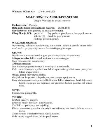 Wzorzec FCI nr 325 /28.04.1997/GB MAŁY GOŃCZY ANGLO-FRANCUSKI (Anglo-Français de petite vénerie) Pochodzenie: Francja. Data publikacji oryginalnego wzorca: 26.01.1983 Użytkowość: Pies gończy na małą zwierzynę. Klasyfikacja FCI: grupa 6 Psy gończe, posokowce i rasy pokrewne. sekcja 1.2. Średnie psy gończe. Podlega próbom pracy. WRAŻENIE OGÓLNE: Wyważony, solidnie zbudowany, nie ciężki. Zarys z profilu musi skłaniać się ku przyjętej sylwetce francuskiego gończego. GŁOWA: Wydłużona, nie za szeroka, guz potyliczny słabo zaznaczony. Mózgoczaszka: lekko wysklepiona, ale nie okrągła. Stop nieznacznie zaznaczony. Trzewioczaszka: Nos dobrze pigmentowany, o otwartych nozdrzach. Kufa umiarkowanie wydłużona, lekko spiczasta; grzbiet nosa prosty lub lekko wygarbiony. Wargi: górna przykrywa dolną. Oczy duże, brązowe, o łagodnym, ale żywym spojrzeniu. Uszy dobrze osadzone poniżej linii oczu, lekko skręcone, średniej szerokości, sięgające co najmniej na grubość dwóch palców od końca nosa. SZYJA: Sucha, bez podgardla. TUŁÓW: Grzbiet prosty i mocny. Lędźwie raczej krótkie i umięśnione. Zad lekko opadający, raczej długi. Klatka piersiowa głęboka, sięgająca co najmniej do łokci, dobrze rozwinięta. Żebra długie i umiarkowanie wysklepione. Boki raczej wypełnione, lekko podkasane. 1 OGON: Średniej długości, raczej cienki, dobrze osadzony na przedłużeniu linii lędźwi, z gęstym włosem, ale bez dłuższych, kręconych, lekko odstających włosów na jego końcu. KOŃCZYNY: Kończyny przednie dostatecznie mocne, szerokie i proste. Łopatki długie, płaskie, skośne, dobrze związane z klatką piersiową. Kończyny tylne: Uda długie i muskularne. Stawy skokowe lekko kątowane, nisko osadzone. Łapy szczupłe i zwarte. SKÓRA: Delikatna, bez fałd i zgrubień. OKRYWA WŁOSOWA: Sierść krótka, gęsta, gładka. Umaszczenie tricolor - biały i czarny z jasnobrązowymi znaczeniami, czarny nos; bicolor: biały i pomarańczowy, nos brązowy. WYMIARY: Wysokość w kłębie: 48 - 56 cm z tolerancją 2 cm w górę i w dół w wyjątkowych przypadkach. WADY: Wszelkie odstępstwa od powyższego wzorca powinny być traktowane jako wady i oceniane w zależności od stopnia ich nasilenia. - głowa zbyt krótka lub zbyt duża, - okrągła mózgoczaszka, - nozdrza zbyt rozwarte, - kufa kwadratowa, - oczy wyłupiaste, jasne, - uszy osadzone wysoko, szerokie, krótkie lub zbyt płaskie, - szyja zbyt krótka; obecność podgardla, - tułów walcowaty, - przeładowane łopatki, - ogon kosmaty, krótki; z szorstkimi, dłuższymi, lekko odstającymi włosami na jego końcu, - luźne fałdy skóry, - generalnie każda wada typowa dla psów gończych. UWAGA: Samce muszą mieć dwa, prawidłowo wykształcone jądra, całkowicie umieszczone w mosznie. 2