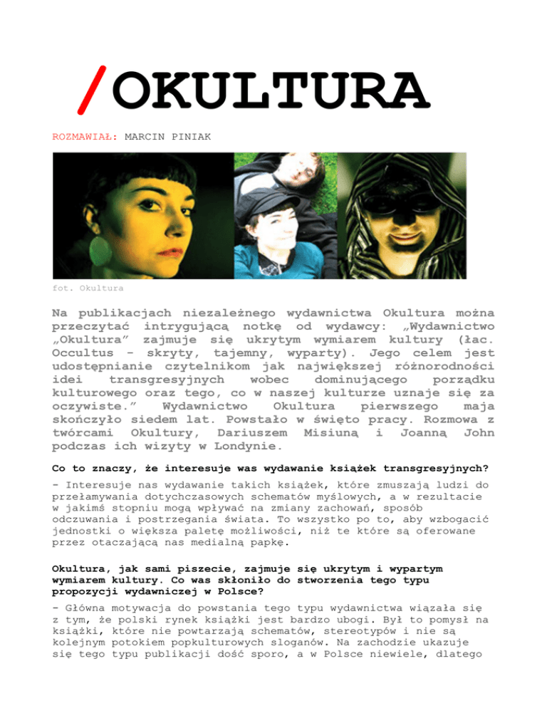 /OKULTURA ROZMAWIAŁ: MARCIN PINIAK fot. Okultura Na publikacjach niezależnego wydawnictwa Okultura można przeczytać intrygującą notkę od wydawcy: „Wydawnictwo „Okultura” zajmuje się ukrytym wymiarem kultury (łac. Occultus - skryty, tajemny, wyparty). Jego celem jest udostępnianie czytelnikom jak największej różnorodności idei transgresyjnych wobec dominującego porządku kulturowego oraz tego, co w naszej kulturze uznaje się za oczywiste.” Wydawnictwo Okultura pierwszego maja skończyło siedem lat. Powstało w święto pracy. Rozmowa z twórcami Okultury, Dariuszem Misiuną i Joanną John podczas ich wizyty w Londynie. Co to znaczy, że interesuje was wydawanie książek transgresyjnych? - Interesuje nas wydawanie takich książek, które zmuszają ludzi do przełamywania dotychczasowych schematów myślowych, a w rezultacie w jakimś stopniu mogą wpływać na zmiany zachowań, sposób odczuwania i postrzegania świata. To wszystko po to, aby wzbogacić jednostki o większa paletę możliwości, niż te które są oferowane przez otaczającą nas medialną papkę. Okultura, jak sami piszecie, zajmuje się ukrytym i wypartym wymiarem kultury. Co was skłoniło do stworzenia tego typu propozycji wydawniczej w Polsce? - Główna motywacja do powstania tego typu wydawnictwa wiązała się z tym, że polski rynek książki jest bardzo ubogi. Był to pomysł na książki, które nie powtarzają schematów, stereotypów i nie są kolejnym potokiem popkulturowych sloganów. Na zachodzie ukazuje się tego typu publikacji dość sporo, a w Polsce niewiele, dlatego uznałem, że trzeba wypełnić tę lukę materiałami źródłowymi. Ta podstawa w późniejszym czasie zachęci ludzi do publikowania własnych dzieł, do tworzenia obiektów sztuki i własnych „stref autonomicznych”. Macie poczucie, że wasza praca w Polsce trafia na podatny grunt? - Przede wszystkim czuję, że istnieje coś takiego jak „wkurw pierworodny”, czyli poczucie niezadowolenia z tego co się dzieje, a jeżeli to już ma miejsce, to ludzie po pierwsze szukają racjonalizacji dla swoich tęsknot i niespełnień i być może znajdują to w tych książkach, po drugie zaś czerpią z nich inspiracje. Nasza praca to nadrabianie kilkudziesięcioletniej luki. W pewnym sensie w kulturę polską została rzucona „bomba atomowa” - komunizm. W peerelowskiej rzeczywistości z jednej strony mieliśmy do czynienia z presją ze strony systemu, który wszystkich ujednolicał, z drugiej zaś z presją opozycji, która była solidnie związana z jedną opcją ideową - kościołem katolickim. Znalezienie jakiegoś „powietrza” pomiędzy tymi dwoma dusznymi środowiskami było dość trudne. Okultura wywodzi się z takich prób znalezienia trzeciej drogi poza represyjnym państwem i kościołem. Obecnie przejawia się to raczej w poszukiwaniu przestrzeni pomiędzy tradycjonalizmem a popkulturą. Mamy potężne zaplecze na świecie, ponieważ mądrych autorów i ciekawych książek jest moc. Co decyduje o waszej ofercie wydawniczej, jakiego rodzaju impuls powoduje decyzję o wydaniu konkretnej książki? - Podstawowym kluczem wydawniczym Okultury była chęć wydawania książek, które po prostu nam się podobają. Kiedyś, posiadając przywilej znajomości języka angielskiego, mogłem samemu czytać ciekawe rzeczy, ale jednocześnie nie widziałem niczego podobnego na polskim rynku. Pracując jako tłumacz i dziennikarz zauważyłem, że niektóre tematy są niechętnie przyjmowane i puszczane w obieg. Miast tego drukuje się opracowania na temat opracowań i tak dalej - trzeciorzędne źródła. Moim zdaniem jest to efekt lenistwa mentalnego, które z kolei bywa wspierane poprzez tabu. Pewne tematy są niewygodne. Większości ludzi jest dobrze wtedy, gdy mogą poczuć się w grupie. Pozwolę sobie teraz na powiedzenie czegoś niepopularnego, ale większość ludzi jest powierzchowna i nie poszukuje większych doznań poza czystą wegetacją - jest to rodzaj samonapędzającego się marazmu i apatii. Łatwo jest powtarzać coś za kimś - stwarza to poczucie bezpieczeństwa, zachowania tak zwanego rytmu życia. Nasze książki mają wybijać z tego rytmu. Mają być niewygodne i nie miłe, a dzięki temu na swój sposób fascynujące. Komu przeszkadza niewygoda tych książek, czy istnieje jakikolwiek rodzaj opozycji wobec waszych propozycji wydawniczych? - Opozycja ma przede wszystkim naturę strukturalną. Największy problem tak naprawdę stanowi struktura polskiego rynku księgarskiego. No właśnie. W jednym z wywiadów wspomniałeś o korporacyjno towarzyskich układach w środowisku wydawniczym. Jak to wygląda? - W praktyce sprowadza się to do prostej zasady kapitalizmu, że ten, kto większy, jest silniejszy. Będąc małym wydawcą i nie mając dużych obrotów nie jesteś traktowany na tych samych prawach co wielcy wydawcy. Polski rynek wydawniczy funkcjonuje na zasadzie odwlekania spłaty. Oznacza to, że nie ma bezpośredniego obiegu gotówki. Księgarze i hurtownicy biorą książki w zastaw. Trwa to tygodnie, a nawet miesiące, zanim pieniądze dotrą do wydawcy. W międzyczasie tworzy się zator. Większy wydawca uzyskuje wpływy od razu. Poza tym publikacje „dużych graczy” są wykładane na widoczne miejsca w księgarniach, stosuje się profity dla dystrybutorów i tak dalej. Rynek księgarniany w Polsce ulega korporatyzacji. Zmniejsza się ilość małych księgarń, duże firmy przejmują ich potencjał. To sprawia, że korporacje księgarskie mogą narzucać reguły gry. Trudno z nimi negocjować. To jest taki łańcuch trawienny na końcu którego jest biedny drukarz, zmuszony do funkcjonowania na zasadzie odwleczonej spłaty, co często jest powodem bankructwa drukarni. Stanowicie raczej mały zespół „multiinstrumentalistów”. Jak wygląda wydawnictwo Okultura od środka? - Żeby utrzymać się w tych realiach, trzeba być bardzo mobilnym, skłonnym do innowacji i do