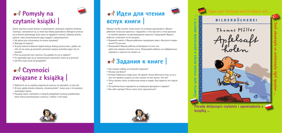 Zanim zaczniesz czytać dziecku to opowiadanie, obejrzyjcie wspólnie tytułową ilustrację i zastanówcie się, co może być fabułą opowiadania. Następnie przeczytaj je dziecku poświęcając dużo czasu na oglądanie ilustracji. Zadawaj dziecku pytania i okaż zainteresowanie jego uwagami i spostrzeżeniami: • Jak patrzy pies zilustrowany na stronie tytułowej? • Dlaczego on biegnie? • W psiej rodzinie niebawem będzie kolacja. Brakuje jeszcze soku z jabłek, ale nikt nie ma czasu go przynieść, ponieważ wszyscy są bardzo zajęci. Czy to prawda? • Pitzi ma przynieść sok z piwnicy. Czy podoba mu się to zadanie? • Co naprawdę kryje się za niesamowitymi postaciami, które są w piwnicy? • Jak Pitzi czuje się po tej przygodzie? Прежде чем Вы начнете читать вслух эту историю, рассмотрите с Вашим ребенком титульную картинку и подумайте, о чем идет речь в этом рассказе – не жалейте времени на рассматривание картинок. Спрашивайте Вашего ребенка и отвечайте на его вопросы. Bücher sind für die Entwicklung von Kindern so wichtig • Издавайте вместе с Вашим ребенком подходящие звуки: «Как рычит медвеwie Bewegung und gesunde Ernährung … жонок? Ры-ры-ры» • Показывайте Вашему ребенку иллюстрации из wecken книг или … und Eltern die Begeisterung dafür! дайте ему самому полистать»Lesestart книги. Показывайте ребенку на изображенные – Drei Meilensteine für das Lesen« schenkt Kindern im предметы и просите его назвать их. einem Jahr, drei Jahren und zum Schulanfang ein Buch. Alter von Czynności związane z książką | • Wybierzcie się na wspólną wyprawę do piwnicy, by sprawdzić, co tam jest • W razie, gdyby dziecko ciekawiły „niesamowitości“, maluj wraz z nim postacie wywołujące zgrozę. • Poszukaj razem z dzieckiem w różnych prospektach ilustracji przedmiotów, które można przechowywać w piwnicy i zróbcie z nich kolaż. Die Eltern erhalten kostenlos Vorlesetipps und Buchempfehlungen. Veranstaltungen vor Ort machen aus »Lesestart« eine gemeinsame Bewegung für das Vorlesen und Lesen. Задания к книге | Das Programm wird vom Bundesministerium für Bildung und Forschung finanziert und von der Stiftung Lesen durchgeführt. • Как смотрит собака на титульной странице? • Почему она бежит? • В семье Собакиных скоро ужин. Не хватает только яблочного сока, но ни у кого нет времени сходить за ним, потому что все заняты. Это так? • Питци должен пойти за яблочным соком в подвал. Ему нравится это поручение? • Что действительно скрывается за зловещими фигурами в подвале? • Как себя чувствует Питци после этого приключения? OD_9783848910144_Apfelsaft-holen_StiftungLesen_Cov_A01_V02.indd 1 Tipps zum Vorlesen und Erzählen mit … Советы для чтения вслух и рассказов вместе с ... Thomas Müller · Apfelsaft holen Идеи для чтения вслух книги | Porady dotyczące czytania i opowiadania z książką ... Sesli okumayla ve anlatmayla ilgili ipuçları ... Pomysły na czytanie książki | 03.07.13 15:21 … und Eltern wecken die Begeisterung dafür! Buchinhalt | Das Programm wird vom Bundesministerium für Bildung und Forschung finanziert und von der Stiftung Lesen durchgeführt. Thomas Müller · Apfelsaft holen Bücher sind für die Entwicklung von Kindern so wichtig wie Bewegung und gesunde Ernährung … »Lesestart – Drei Meilensteine für das Lesen« schenkt Kindern im Alter von einem Jahr, drei Jahren und zum Schulanfang ein Buch. Die Eltern erhalten kostenlos Vorlesetipps und Buchempfehlungen. Veranstaltungen vor Ort machen aus »Lesestart« eine gemeinsame Bewegung für das Vorlesen und Lesen. OD_9783848910144_Apfelsaft-holen_StiftungLesen_Cov_A01_V02.indd 1 03.07.13 15:21 Pitzi und seine Familie bereiten zusammen das Abendessen vor. Etwas zu trinken fehlt noch. Eine Flasche Apfelsaft muss her! Doch dafür muss jemand in den Keller gehen. Alle sind beschäft igt. Mama kocht Nudeln, Papa macht Salat, Billi muss den Tisch decken und Lilli den Käse reiben … nur Pitzi hat eigentlich nichts zu tun. Aber so ganz allein in den Keller? Kitap içeriği | Pitzi ve ailesi birlikte akşam yemeğini hazırlıyor. Ancak masada içecek eksik. Bir şişe elma suyu lazım! Ama bunun için birinin bodruma inmesi gerekir. Herkes meşgul. Anne makarna haşlıyor, baba salata yapıyor, Billi masayı hazırlarken Lilli de peyniri rendeliyor … Aslında sadece Pitzi meşgul değil. Peki, ama yalnız başına bodruma nasıl gitsin? Treść książki | Pitzi i jego rodzina przygotowują razem kolację. Brakuje jeszcze czegoś do picia. Trzeba koniecznie przynieść butelkę soku z jabłek! Ktoś jednak musi po nią pójść do piwnicy. Tymczasem wszyscy są zajęci. Mama gotuje makaron, tata robi sałatkę, Billi musi nakryć do stołu, a Lilli – utrzeć ser … tylko Pitzi nie ma właściwie nic do zrobienia. Ale tak całkiem samemu do piwnicy? Содержаниекниги | Питци и его семья вместе готовят обед. Но еще не хватает напитков. Нужна бутылка яблочного сока! За ним кто-то должен сходить в подвал. Все заняты. Мама готовит макароны, па
