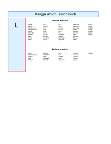 Księga imion islandzkich L Imiona żeńskie Laila Laufey Laufhildur Laugheiður Lára Láretta Lárey Lea Lena Lilja Lilla Lillian Lilly Lillý Lily Lind Linda Lisbet Lisebet Lissý Liv Lína Líndís Líneik Líney Lísa Lísabet Lísbet Ljósbjörg Ljósbrá Ljótunn Loftveig Loreley Lotta Louisa Lovísa Lóa Lórelei Lórey Lórý Lucia Lúcía Lukka Lúlla Lúvísa Lydía Lýdía Louise Lúðvíg Lúðvík Lúther Lydia Lýður Imiona męskie Lars Lárentsínus Lárus Leif Leifur Leiknir Leonard Leó Leópold Linnet Liss Líni Loftur Logi Loryane