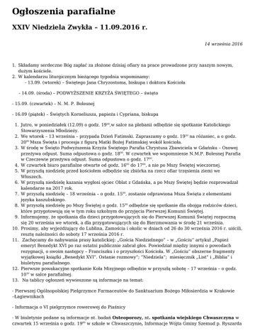 Ogłoszenia parafialne XXIV Niedziela Zwykła – 11.09.2016 r. 14 września 2016 1. Składamy serdeczne Bóg zapłać za złożone dzisiaj ofiary na prace prowadzone przy naszym nowym, dużym kościele. 2. W kalendarzu liturgicznym bieżącego tygodnia wspominamy: - 13.09. (wtorek) – Świętego Jana Chryzostoma, biskupa i doktora Kościoła - 14.09. (środa) – PODWYŻSZENIE KRZYŻA ŚWIĘTEGO – święto - 15.09. (czwartek) – N. M. P. Bolesnej - 16.09 (piątek) – Świętych Korneliusza, papieża i Cypriana, biskupa 1. Jutro, w poniedziałek (12.09) o godz. 1900,w salce na plebanii odbędzie się spotkanie Katolickiego Stowarzyszenia Młodzieży. 2. We wtorek – 13 września – przypada Dzień Fatimski. Zapraszamy o godz. 1930 na różaniec, a o godz. 2000 Msza Święta i procesja z figurą Matki Bożej Fatimskiej wokół kościoła. 3. W środę w Święto Podwyższenia Krzyża Świętego Parafia Chrystusa Zbawiciela w Gdańsku – Osowej przeżywa odpust. Suma odpustowa o godz. 1800. W czwartek we wspomnienie N.M.P. Bolesnej Parafia w Czeczewie przeżywa odpust. Suma odpustowa o godz. 1700. 4. W czwartek biuro parafialne otwarte od godz. 1600 do 1700, a nie po Mszy Świętej wieczornej. 5. W przyszłą niedzielę przed kościołem odbędzie się zbiórka na rzecz ofiar trzęsienia ziemi we Włoszech. 6. W przyszłą niedzielę kazania wygłosi ojciec Oblat z Gdańska, a po Mszy Świętej będzie rozprowadzał kalendarze na 2017 rok. 7. W przyszłą niedzielę – 18 września – o godz. 1500, zostanie odprawiona Msza Święta z elementami języka kaszubskiego. 8. W przyszłą niedzielę po Mszy Świętej o godz. 1500 odbędzie się spotkanie dla obojga rodziców dzieci, które przygotowują się w tym roku szkolnym do przyjęcia Pierwszej Komunii Świętej. 9. Informujemy, że spotkania dla dzieci przygotowujących się do Pierwszej Komunii Świętej rozpoczną się 20 września we wtorek, a dla przygotowujących się do Bierzmowania w środę 21 września. 10. Prosimy, aby wyjeżdżający do Lublina, Zamościa i okolic w dniach od 26 do 30 września 2016 r. uiścili, resztę należności do soboty 17 września 2016 r. 11. Zachęcamy do nabywania prasy katolickiej: „Gościa Niedzielnego” – w „Gościu” artykuł „Papież emeryt Benedykt XVI po raz ostatni publicznie zabrał głos. Powiedział między innymi o powodach rezygnacji, o swoim następcy – Franciszku i o przyszłości Kościoła. W „Gościu” obszerne fragmenty wyjątkowej książki „Benedykt XVI”. Ostanie rozmowy”; ”Niedziela”; miesięcznik „List” i „Biblia” i biuletynu parafialnego. 12. Pierwsze powakacyjne spotkanie Koła Misyjnego odbędzie w przyszłą sobotę – 17 września – o godz. 1030 w salce parafialnej. 13. Na tablicy ogłoszeń wywieszone są informacje na temat: - Pierwszej Ogólnopolskiej Pielgrzymce Farmaceutów do Sanktuarium Bożego Miłosierdzia w Krakowie –Łagiewnikach - Informacja o VI pielgrzymce rowerowej do Piaśnicy - W biuletynie podane są informacje nt. badań Osteoporozy, nt. spotkania wiejskiego Chwaszczyna w czwartek 15 września o godz. 1900 w szkole w Chwaszczynie, Informacje Wójta Gminy Szemud p. Ryszarda Kalkowskiego 1. W dniu dzisiejszym w Kościele w Polsce rozpoczyna się Tydzień Wychowania pod hasłem „Miłosierni jak Ojciec”. Chciejmy swoją modlitwą w tym czasie otoczyć dzieci, młodzież, nauczycieli i duszpasterzy i z pełną odpowiedzialnością za młode pokolenie Polaków, włączajmy się w dzieło jego wychowywania. 2. W minionym tygodniu odbył się śp. Franciszka Makurat z ul. Polnej 1 z Chwaszczyna. Przeżył lat 84. Dobry Jezu… Osteoporoza W dniu 15.09.2016 r. (czwartek) w godz. 1600 – 1800 (zapisy w rejestracji lub tel. 58 552-80-80) w Ośrodku Zdrowia w Chwaszczynie przy ul. Żeromskiego 7 odbędą się badania w kierunku osteoporozy – koszt 35zł wykonywane przez firmę Osteomedik. Sołtys Sołectwa Chwaszczyno W czwartek 15 września 2016 godz. 1900 na terenie szkoły w Chwaszczynie odbędzie się Zebranie Wiejskie. Tematem zebrania będzie podział środków funduszu sołeckiego. ZEBRANIE WIEJSKIE które odbędzie się w dniu 15 września 2016r. (czwartek) o godz. 19.00 w Zespole Szkół w Chwaszczynie w sprawie podziału środków funduszu sołeckiego. Porządek zebrania: Otwarcie zebrania; Stwierdzenie liczby mieszkańców uczestniczących w Zebraniu Wiejskim na podstawie listy obecności; Wybór protokolanta; Przedstawienie proponowanego porządku obrad przez Sołtysa; Ustalenie i przyjęcie porządku obrad przez Zebranie Wiejskie; Przedstawienie propozycji wniosków o zmianę uchwały dotyczącej podziału środków funduszu sołeckiego na 2016 rok; Dyskusja nad wnioskami w sprawie zmiany podziału środków z funduszu sołeckiego na 2016 rok; Głosowanie nad wnioskami w sprawie podziału środków z funduszu sołeckiego na 2016 rok; Podjęcie uchwały w sprawie uchwalenia wniosku o zmianę podziału przyznanych środków z funduszu sołeckiego na 2016 rok; Przedstawienie propozycji wniosków w sprawie podziału środków z funduszu sołeckiego na 2017 rok; Dyskusja nad wnioskami w sprawie podziału środków z funduszu sołeckiego na 2017 rok; Głosowanie nad wnioskami w sprawie podziału środków z funduszu sołeckiego na 2017 rok; Podjęcie uchwały w sprawie uchwalenia wniosku o przyznanie środków z funduszu sołeckiego na 2017 rok; Sprawy różne, w tym przedstawienie wizualizacji projektu ronda w Chwaszczynie; Zakończenie obrad. Wójt Gminy Szemud Będzie możliwość dofinansowania do instalacji fotowoltaicznych dla mieszkańców… Urząd Marszałkowski Województwa Pomorskiego planuje w IV kwartale br ogłosić nabór wniosków na wsparcie dotacyjne dla odnawialnych źródeł energii tj. paneli fotowoltaicznych. W związku z zaobserwowanym przez nas, narastającym zainteresowaniem mieszkańców ww. instalacjami oraz licznymi pytaniami mieszkańców, jakie są plany Gminy w tym temacie, i