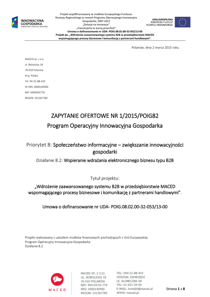 Projekt współfinansowany ze środków Europejskiego Funduszu Rozwoju Regionalnego w ramach Programu Operacyjnego Innowacyjna Gospodarka, 2007-2013 „Dotacje na innowacje” „Inwestujemy w waszą przyszłość” Umowa o dofinansowanie nr UDA- POIG.08.02.00-32-053/13-00 Projekt pn. „Wdrożenie zaawansowanego systemu B2B w przedsiębiorstwie MACED wspomagającego procesy biznesowe i komunikację z partnerami handlowymi”. Polanów, dnia 2 marca 2015 roku MACED sp. z o.o. ul. Bobolicka 18 76-010 Polanów Kraj: Polska Tel. 94-31-88-410 Nr KRS: 0000140490 NIP: 4990403778 REGON: 331367780 ZAPYTANIE OFERTOWE NR 1/2015/POIG82 Program Operacyjny Innowacyjna Gospodarka Priorytet 8: Społeczeństwo informacyjne – zwiększanie innowacyjności gospodarki Działanie 8.2: Wspieranie wdrażania elektronicznego biznesu typu B2B Tytuł projektu: „Wdrożenie zaawansowanego systemu B2B w przedsiębiorstwie MACED wspomagającego procesy biznesowe i komunikację z partnerami handlowymi”. Umowa o dofinansowanie nr UDA- POIG.08.02.00-32-053/13-00 Projekt realizowany z udziałem środków finansowych pochodzących z Unii Europejskiej Program Operacyjny Innowacyjna Gospodarka Działanie 8.2 Strona 1 z 8 Projekt współfinansowany ze środków Europejskiego Funduszu Rozwoju Regionalnego w ramach Programu Operacyjnego Innowacyjna Gospodarka, 2007-2013 „Dotacje na innowacje” „Inwestujemy w waszą przyszłość” Umowa o dofinansowanie nr UDA- POIG.08.02.00-32-053/13-00 Projekt pn. „Wdrożenie zaawansowanego systemu B2B w przedsiębiorstwie MACED wspomagającego procesy biznesowe i komunikację z partnerami handlowymi”. PO IG 8.2 ETAP nr 3 ZAPYTANIE OFERTOWE NR 1/2015/POIG82 MACED sp. z o.o. niniejszym zaprasza do składania ofert na: „Zakup usług eksperckich w ramach etapu nr 3 Projektu pn.: „Wdrożenie zaawansowanego systemu B2B w przedsiębiorstwie MACED wspomagającego procesy biznesowe i komunikację z partnerami handlowymi””, współfinansowanego ze środków Europejskiego Funduszu Rozwoju Regionalnego w ramach Programu Operacyjnego Innowacyjna Gospodarka, Działanie 8.2., Umowa o dofinansowanie nr UDA-POIG.08.02.00-32-053/1300. 1. Nazwa i adres Zamawiającego MACED sp. z o.o. ul. Bobolicka 18 76-010 Polanów Kraj: Polska Tel. 94-31-88-410 e-mail: [email protected] Nr KRS: 0000140490 NIP: 4990403778 REGON: 331367780 2. Tryb udzielania zamówienia Zamawiający nie jest zobowiązany do stosowania ustawy z dnia 29 stycznia 2004 r. Prawo zamówień publicznych (Dz. U. z 2010 r. Nr 113, poz. 759 z późn. zm.). Zamówienie nie podlega przepisom ustawy z dnia 29 stycznia 2004 r. Prawo zamówień publicznych (Dz. U. z 2010 r. Nr 113, poz. 759 z późn. zm.). jak również protestom i odwołaniom. 3. Przedmiot zamówienia Przedmiotem zamówienia jest: 1. Stworzenie specyfikacji technicznej oprogramowania komputerowego systemu – etap nr 3 (1 szt.) 2. Zakup usługi eksperckiej w zakresie stworzenia Modułu administracji i platformą B2B (1 szt.) 3. Zakup usługi eksperckiej w zakresie stworzenia Modułu serwera certyfikowanego wewnętrznego klucza prywatnego i publicznego architektury PKI (1 szt.) Strona 2 z 8 Projekt współfinansowany ze środków Europejskiego Funduszu Rozwoju Regionalnego w ramach Programu Operacyjnego Innowacyjna Gospodarka, 2007-2013 „Dotacje na innowacje” „Inwestujemy w waszą przyszłość” Umowa o dofinansowanie nr UDA- POIG.08.02.00-32-053/13-00 Projekt pn. „Wdrożenie zaawansowanego systemu B2B w przedsiębiorstwie MACED wspomagającego procesy biznesowe i komunikację z partnerami handlowymi”. 4. Zakup usługi eksperckiej w zakresie stworzenia Modułu komunikacji wewnętrznej pomiędzy Partnerami (1 szt.) 5. Zakup usługi eksperckiej w zakresie stworzenia Modułu elektronicznej wymiany danych równoważny z EDI wraz z wykorzystaniem certyfikowanego klucza wewnętrznego w celu eliminacji papierowego obiegu dokumentów (1 szt.) 6. Zakup usługi eksperckiej w zakresie stworzenia Modułu archiwizacji danych (1 szt.) 7. Zakup usługi eksperckiej w zakresie stworzenia Modułu do analizy danych dostarczonych do systemu B2B - analiza danych historycznych o partnerach i sprzedaży, trademarketingu, programie lojalnościowym (1 szt.) 8. Zakup usługi eksperckiej w zakresie stworzenia Modułu prowadzenia rozliczeń pomiędzy partnerami (1 szt.) 9. Usługi w zakresie wdrożenia komunikacji w standardzie równoważnym z EDI oraz konfiguracja interfejsów integracyjnych API (1 szt.) 10. Zakup usługi instalacji i konfiguracji oprogramowania platformy B2B oraz serwerów klucza certyfikowanego PKI, EDI i API oraz serwera dostępowego, konfiguracja rozdziału warstw aplikacji pomiędzy serwery fizyczne i ostateczne testy modułów wdrożonych w tym etapie (1 szt.) 11. Testowanie całości platformy, prace konfiguracyjne, wdrożenie i ostateczne uruchomienie platformy (1 szt.) zgodnie z Dokumentacją techniczną określoną w Załączniku 2 do niniejszego Zapytania Ofertowego oraz specyfikację techniczną oprogramowania komputerowego systemu – etap nr 2, która będzie udostępniona na żądanie oferenta. Dodatkowo: Prace w etapie 3 są wykonywane w oparciu o założenia wniosku o dofinansowanie realizacji projektu nr WND-POIG.08.02.00-32-053/13 i biznesplanu do niego, dokumentacją techniczną określoną w Załączniku 2 do niniejszego Zapytania Ofertowego a także w oparciu o szczegółowe założenia „Specyfikacji technicznej oprogramowania komputerowego systemu – etap nr 2” oraz „Specyfikacji technicznej oprogramowania komputerowego systemu – etap nr 3”. 4. Wymogi wobec wykonawcy: 1. − − Wykonawca jest zobowiązany do: zapewnienia dostępu do informacji technicznych oferowanej aplikacji B2B, udzielenia gwarancji na oferowaną aplikację, zgodnie z zasadami określonymi w Załączniku nr 2 do zapytania ofertowego; 2. Zamawiający wymaga, aby Oferent nie zalegał z opłacaniem podatków oraz składek na ubezpieczenie społeczne. Oferent, kt