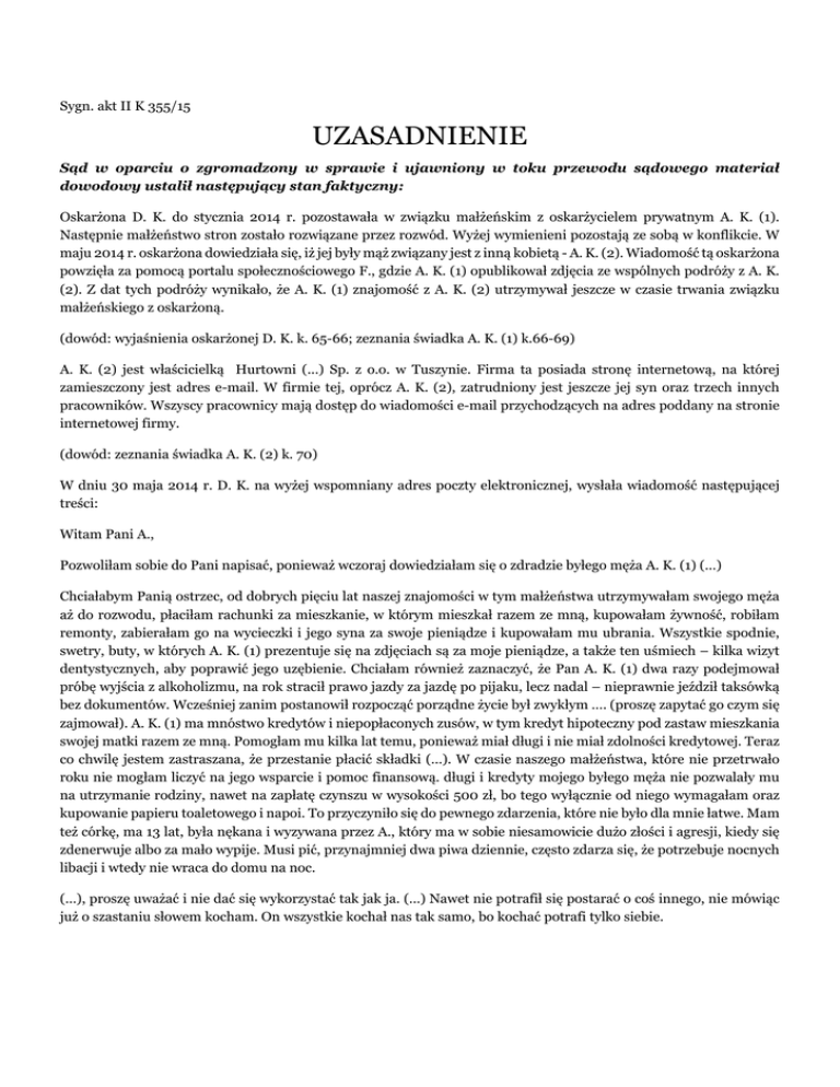Sygn. akt II K 355/15 UZASADNIENIE Sąd w oparciu o zgromadzony w sprawie i ujawniony w toku przewodu sądowego materiał dowodowy ustalił następujący stan faktyczny: Oskarżona D. K. do stycznia 2014 r. pozostawała w związku małżeńskim z oskarżycielem prywatnym A. K. (1). Następnie małżeństwo stron zostało rozwiązane przez rozwód. Wyżej wymienieni pozostają ze sobą w konflikcie. W maju 2014 r. oskarżona dowiedziała się, iż jej były mąż związany jest z inną kobietą - A. K. (2). Wiadomość tą oskarżona powzięła za pomocą portalu społecznościowego F., gdzie A. K. (1) opublikował zdjęcia ze wspólnych podróży z A. K. (2). Z dat tych podróży wynikało, że A. K. (1) znajomość z A. K. (2) utrzymywał jeszcze w czasie trwania związku małżeńskiego z oskarżoną. (dowód: wyjaśnienia oskarżonej D. K. k. 65-66; zeznania świadka A. K. (1) k.66-69) A. K. (2) jest właścicielką Hurtowni (...) Sp. z o.o. w Tuszynie. Firma ta posiada stronę internetową, na której zamieszczony jest adres e-mail. W firmie tej, oprócz A. K. (2), zatrudniony jest jeszcze jej syn oraz trzech innych pracowników. Wszyscy pracownicy mają dostęp do wiadomości e-mail przychodzących na adres poddany na stronie internetowej firmy. (dowód: zeznania świadka A. K. (2) k. 70) W dniu 30 maja 2014 r. D. K. na wyżej wspomniany adres poczty elektronicznej, wysłała wiadomość następującej treści: Witam Pani A., Pozwoliłam sobie do Pani napisać, ponieważ wczoraj dowiedziałam się o zdradzie byłego męża A. K. (1) (…) Chciałabym Panią ostrzec, od dobrych pięciu lat naszej znajomości w tym małżeństwa utrzymywałam swojego męża aż do rozwodu, płaciłam rachunki za mieszkanie, w którym mieszkał razem ze mną, kupowałam żywność, robiłam remonty, zabierałam go na wycieczki i jego syna za swoje pieniądze i kupowałam mu ubrania. Wszystkie spodnie, swetry, buty, w których A. K. (1) prezentuje się na zdjęciach są za moje pieniądze, a także ten uśmiech – kilka wizyt dentystycznych, aby poprawić jego uzębienie. Chciałam również zaznaczyć, że Pan A. K. (1) dwa razy podejmował próbę wyjścia z alkoholizmu, na rok stracił prawo jazdy za jazdę po pijaku, lecz nadal – nieprawnie jeździł taksówką bez dokumentów. Wcześniej zanim postanowił rozpocząć porządne życie był zwykłym …. (proszę zapytać go czym się zajmował). A. K. (1) ma mnóstwo kredytów i niepopłaconych zusów, w tym kredyt hipoteczny pod zastaw mieszkania swojej matki razem ze mną. Pomogłam mu kilka lat temu, ponieważ miał długi i nie miał zdolności kredytowej. Teraz co chwilę jestem zastraszana, że przestanie płacić składki (…). W czasie naszego małżeństwa, które nie przetrwało roku nie mogłam liczyć na jego wsparcie i pomoc finansową. długi i kredyty mojego byłego męża nie pozwalały mu na utrzymanie rodziny, nawet na zapłatę czynszu w wysokości 500 zł, bo tego wyłącznie od niego wymagałam oraz kupowanie papieru toaletowego i napoi. To przyczyniło się do pewnego zdarzenia, które nie było dla mnie łatwe. Mam też córkę, ma 13 lat, była nękana i wyzywana przez A., który ma w sobie niesamowicie dużo złości i agresji, kiedy się zdenerwuje albo za mało wypije. Musi pić, przynajmniej dwa piwa dziennie, często zdarza się, że potrzebuje nocnych libacji i wtedy nie wraca do domu na noc. (…), proszę uważać i nie dać się wykorzystać tak jak ja. (…) Nawet nie potrafił się postarać o coś innego, nie mówiąc już o szastaniu słowem kocham. On wszystkie kochał nas tak samo, bo kochać potrafi tylko siebie. A. K. (1) o chciwy i wyrachowany drań, który nie cofnie się przed niczym, aby uzyskać swój cel. Gorzej przychodzi mu z dzieleniem się czymkolwiek, szczególnie jeżeli chodzi o pieniądze i jego rzeczy. Szuka naiwnych i głupich kobiet, które pomogą mu finansowo (…). To wszystko co napisałam jest prawdą, mam na to dowody. Dziękuję, że Pani to przeczytała. (…) (dowód: wyjaśnienia oskarżonej D. K. k. 65-66; zeznania świadka A. K. (1) k. 66-69; zeznania świadka A. K. (2) k. 70; wydruk wiadomości przesłanej pocztą elektroniczną k. 48) Powyższy e-mail został odebrany przez pracownicę hurtowni, którą odczytała go, a następnie o jego treści poinformowała syna A. K. (2). Następnie o treści wiadomości dowiedziała się sama A. K. (2). (dowód: zeznania świadka A. K. (2) k.70) A. K. (1) oskarżył D. K. o to, że: pismem z dnia 30 maja 2014 r. skierowanym za pomocą poczty internetowej na adres Hurtowni (...) sp. z o.o. w Tuszynie pomówiła A. K. (1) o takie postępowanie i właściwości, które mogły go poniżyć w opinii publicznej oraz narazić na utratę zaufania potrzebnego dla wykonywanego przez niego zawodu taksówkarza. oraz o top, że pismem z dnia 30 maja 2014 r. skierowanym za pomocą poczty internetowej na adres Hurtowni (...) sp. z o.o. w Tuszynie używając słów powszechnie uznawanych za obraźliwe znieważył A. K. (1), tj. o przestępstwo z art. 212 § 2 kk w zw. z art. 216 § 2 kk w zw. z art. 11 § 2 kk (akt oskarżenia k. 2-7) Oskarżona D. K. jest rozwiedziona, ma jedno dziecko. Posiada wykształcenie wyższe, pracuje jako specjalista ds. obsługi klientów biznesowych. D. K. nie była dotąd karana. Jej stan zdrowia jest dobry. (dowód: dane o oskarżonej k.65; dane o karalności k. 47) Oskarżona D. K. na rozprawie nie przyznała się do popełnienia zarzucanego jej czynu. Wyjaśniła, że w dniu 30.05.2014r. wysłała maila do A. K. (2). Nie chciała poniżyć A. K. (1), a tym bardziej narazić go na utratę zaufania w zawodzie taksówkarza. Wskazała, że w/w sam to zaufanie stracił, gdy wystosowano wobec niego zakaz prowadzenia pojazdów mechanicznych za prowadzenie pod wpływem alkoholu. Nie zamierzała mścić się na mężu, ale była zdenerwowana, gdyż w dniu 21.01.2014 r. zamieścił na F. zdjęcia z A. K. (2) oraz mianował ją sw