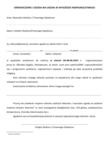 OŚWIADCZENIE I ZGODA NA UDZIAŁ W WYJEŹDZIE NIEPEŁNOLETNIEGO Imię i Nazwisko Rodzica / Prawnego Opiekuna: ......................................................... ..................... Adres i telefon Rodzica/Prawnego Opiekuna: ......................................................... ..................... Ja, niżej podpisany/a, wyrażam zgodę na udział córki / syna ……………………………………………….. ur. …………………….……………… nr pesel………………………………….. (imię i nazwisko) (data i miejsce) w wyjeździe autokarem do Lednicy w dniach 06-08.06.2014 r. organizowanym przez ks. Michała Gogóla. Oświadczam, że wiem, czym jest Lednica2000 i zapoznałem(am) się z programem spotkania, regulaminem wyjazdu i traktuję go jako prywatną praktykę religijną. Stan zdrowia mojego dziecka pozwala na bezpieczny dla niego udział w spotkaniu młodych na Polach Lednickich. Ewentualne problemy zdrowotne, które mogą wystąpić to: …………………………………………………………………………………………………………………………………………… . Proszę nie podawać mojemu dziecku żadnych lekarstw / wyrażam zgodę na podanie mojemu dziecku lekarstw1 w razie wystąpienia dolegliwości (np.: ból głowy, podwyższona temperatura, choroba lokomocyjna itp.). Zgadzam się na hospitalizację dziecka w sytuacji zagrożenia jego zdrowia i życia. …………………………………………………………………………………………………… Podpis Rodzica / Prawnego Opiekuna 11 właściwe podkreślić