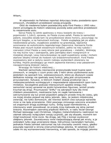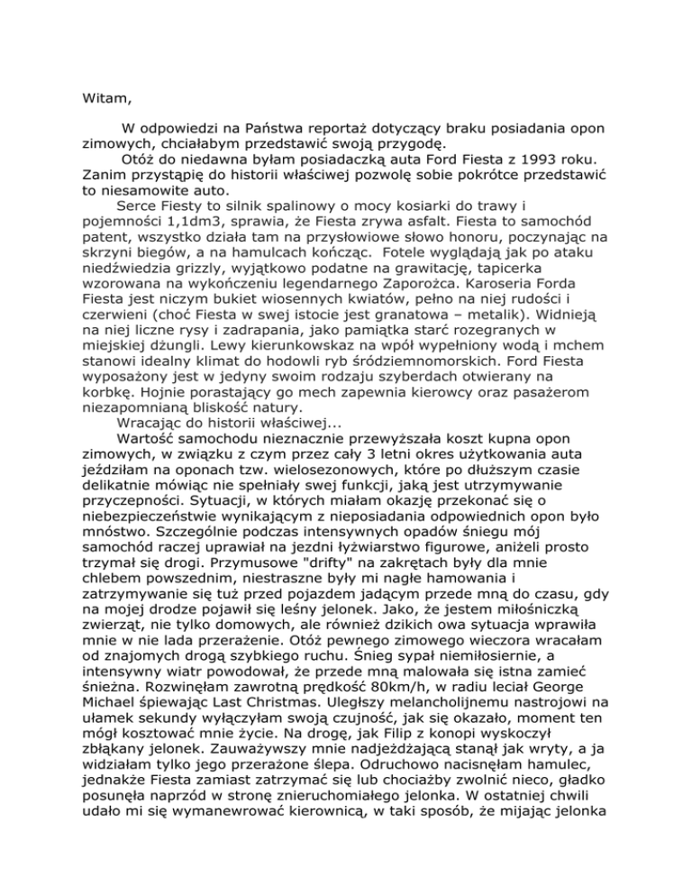 Witam, W odpowiedzi na Państwa reportaż dotyczący braku posiadania opon zimowych, chciałabym przedstawić swoją przygodę. Otóż do niedawna byłam posiadaczką auta Ford Fiesta z 1993 roku. Zanim przystąpię do historii właściwej pozwolę sobie pokrótce przedstawić to niesamowite auto. Serce Fiesty to silnik spalinowy o mocy kosiarki do trawy i pojemności 1,1dm3, sprawia, że Fiesta zrywa asfalt. Fiesta to samochód patent, wszystko działa tam na przysłowiowe słowo honoru, poczynając na skrzyni biegów, a na hamulcach kończąc. Fotele wyglądają jak po ataku niedźwiedzia grizzly, wyjątkowo podatne na grawitację, tapicerka wzorowana na wykończeniu legendarnego Zaporożca. Karoseria Forda Fiesta jest niczym bukiet wiosennych kwiatów, pełno na niej rudości i czerwieni (choć Fiesta w swej istocie jest granatowa – metalik). Widnieją na niej liczne rysy i zadrapania, jako pamiątka starć rozegranych w miejskiej dżungli. Lewy kierunkowskaz na wpół wypełniony wodą i mchem stanowi idealny klimat do hodowli ryb śródziemnomorskich. Ford Fiesta wyposażony jest w jedyny swoim rodzaju szyberdach otwierany na korbkę. Hojnie porastający go mech zapewnia kierowcy oraz pasażerom niezapomnianą bliskość natury. Wracając do historii właściwej... Wartość samochodu nieznacznie przewyższała koszt kupna opon zimowych, w związku z czym przez cały 3 letni okres użytkowania auta jeździłam na oponach tzw. wielosezonowych, które po dłuższym czasie delikatnie mówiąc nie spełniały swej funkcji, jaką jest utrzymywanie przyczepności. Sytuacji, w których miałam okazję przekonać się o niebezpieczeństwie wynikającym z nieposiadania odpowiednich opon było mnóstwo. Szczególnie podczas intensywnych opadów śniegu mój samochód raczej uprawiał na jezdni łyżwiarstwo figurowe, aniżeli prosto trzymał się drogi. Przymusowe "drifty" na zakrętach były dla mnie chlebem powszednim, niestraszne były mi nagłe hamowania i zatrzymywanie się tuż przed pojazdem jadącym przede mną do czasu, gdy na mojej drodze pojawił się leśny jelonek. Jako, że jestem miłośniczką zwierząt, nie tylko domowych, ale również dzikich owa sytuacja wprawiła mnie w nie lada przerażenie. Otóż pewnego zimowego wieczora wracałam od znajomych drogą szybkiego ruchu. Śnieg sypał niemiłosiernie, a intensywny wiatr powodował, że przede mną malowała się istna zamieć śnieżna. Rozwinęłam zawrotną prędkość 80km/h, w radiu leciał George Michael śpiewając Last Christmas. Uległszy melancholijnemu nastrojowi na ułamek sekundy wyłączyłam swoją czujność, jak się okazało, moment ten mógł kosztować mnie życie. Na drogę, jak Filip z konopi wyskoczył zbłąkany jelonek. Zauważywszy mnie nadjeżdżającą stanął jak wryty, a ja widziałam tylko jego przerażone ślepa. Odruchowo nacisnęłam hamulec, jednakże Fiesta zamiast zatrzymać się lub chociażby zwolnić nieco, gładko posunęła naprzód w stronę znieruchomiałego jelonka. W ostatniej chwili udało mi się wymanewrować kierownicą, w taki sposób, że mijając jelonka wylądowałam w przydrożnym rowie. Ani mnie, ani zwierzęciu nic się nie stało, jednakże żadne pieniądze nie są warte tego, co w tamtej chwili czułam. Niech ta historia będzie przestrogą, dla wszystkich tych, którzy podobnie jak ja żałowali pieniędzy na dobre zimówki, ponieważ następnym razem na drodze może Wam stanąć nie zbłąkany jelonek, lecz dziecko. Obecnie jestem posiadaczką Nissana Almery z 1997 roku. Temperatura za oknem coraz niższa, w związku z czym koniecznością jest wymiana opon na zimowe. Pozdrawiam, Izabela Jóźwik