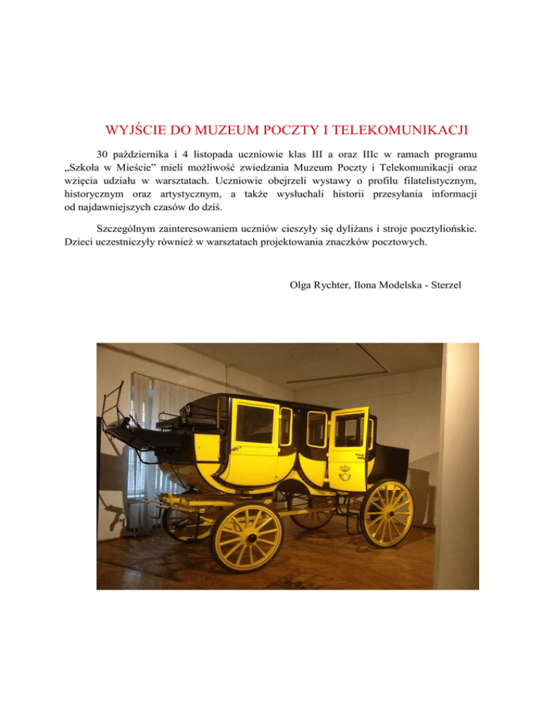 WYJŚCIE DO MUZEUM POCZTY I TELEKOMUNIKACJI 30 października i 4 listopada uczniowie klas III a oraz IIIc w ramach programu „Szkoła w Mieście” mieli możliwość zwiedzania Muzeum Poczty i Telekomunikacji oraz wzięcia udziału w warsztatach. Uczniowie obejrzeli wystawy o profilu filatelistycznym, historycznym oraz artystycznym, a także wysłuchali historii przesyłania informacji od najdawniejszych czasów do dziś. Szczególnym zainteresowaniem uczniów cieszyły się dyliżans i stroje pocztyliońskie. Dzieci uczestniczyły również w warsztatach projektowania znaczków pocztowych. Olga Rychter, Ilona Modelska - Sterzel