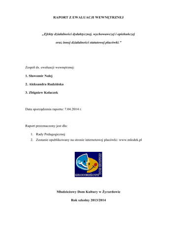 RAPORT Z EWALUACJI WEWNĘTRZNEJ „Efekty działalności dydaktycznej, wychowawczej i opiekuńczej oraz innej działalności statutowej placówki.” Zespół ds. ewaluacji wewnętrznej: 1. Sławomir Nalej 2. Aleksandra Rudzińska 3. Zbigniew Kołaczek Data sporządzenia raportu: 7.04.2014 r. Raport przeznaczony jest dla: 1. Rady Pedagogicznej 2. Zostanie opublikowany na stronie internetowej placówki: www.mlodek.pl Młodzieżowy Dom Kultury w Żyrardowie Rok szkolny 2013/2014 ZAKRES EWALUACJI Efekty działalności dydaktycznej, wychowawczej i opiekuńczej oraz innej działalności statutowej placówki. Placówka doskonali efekty swojej pracy. Wychowankowie nabywają wiadomości i umiejętności, diagnozuje i analizuje się potrzeby i możliwości wychowanków. Opis metod i narzędzi badawczych wykorzystanych przy ewaluacji. Przeprowadzono następujące badania: - ankietę skierowaną do nauczycieli, wychowanków oraz rodziców (opiekunów prawnych) w zakresie realizacji koncepcji pracy placówki - analizę dokumentów: Statutu placówki, programów nauczania, programu wychowawczego oraz profilaktycznego. Terminarz przeprowadzania czynności ewaluacyjnych. Ewaluację przeprowadzono w okresie od 2 lutego 2014 r. do 3 kwietnia 2014 r. Czynności w ramach przeprowadzonej ewaluacji zostały podzielone na: a) badania ewaluacyjne - od 1 lutego 2014 r. do 1 marca 2014 r. b) analiza danych - od 2 marca 2014 r. do 16 marca 2014 r. c) przygotowanie raportu - od 16 marca 2014 r. do 31 marca 2014r. d) przedstawienie raportu dyrektorowi placówki – do 7 kwietnia 2014r. Badania wśród pracowników pedagogicznych prowadzących zajęcia w Młodzieżowym Domu Kultury w Żyrardowie. Ankieta przeprowdzona została wśród 17 nauczycieli pracujących w Młodzieżowym Domu Kultury w Żyrardowie i miała na celu uzyskanie informacji dotyczących działań profilaktycznych, współpracy z innymi placówkami na terenie powiatu. Badany był także dobór tematyki do wieku i możliwości uczestników. Pytanie 1. Jakie działania i zadania wychowawcze kształtuje Pan/Pani w trakcie realizacji swoich zajęć? W pierwszym pytaniu nauczyciele wybierali spośród 5 odpowiedzi - działań wychowawczych realizowanych podczas zajęć. Wyniki są następujące: a) współpraca z rodzicami – 22% b) rozwój postaw szacunku i otwartości dla otoczenia – 18% c) rozwijanie zdolności twórczych wychowanków – 36% d) socjalizacja i budowanie postaw prospołecznych – 16% e) promowanie twórczości wychowanków – 8% Pytanie 2. Czy w doborze tematyki zajęć sugeruje się Pan/Pani propozycjami wychowanków? Pytanie dotyczyło tematyki zajęć oraz tego, czy nauczyciele biorą pod uwagę propozycje uczestników zajęć. Większość ankietowanych stwierdziła, iż przyjmuje propozycje uczestników zajęć. nauczycieli (84%) TAK NIE Pytanie 3. Czy uważa Pan/Pani, że placówka spełnia oczekiwania pod względem warunków lokalowych i zaplecza dydaktycznego? Uzyskane na podstawie pytania wyniki pokazują, że placówka w 87% spełnia oczekiwania nauczycieli pod względem warunków lokalowych jak i zaplecza dydaktycznego. Pytanie 4. Czy nawiązuje Pan/Pani współpracę z pobliskimi szkołami, placówkami kulturalnymi, instytucjami, fundacjami i stowarzyszeniami? Jeśli tak, proszę wymienić. Pytanie czwarte w przeprowadzonej ankiecie miało na celu ukazanie czy nauczyciele nawiązują współpracę z pobliskimi szkołami oraz innymi placówkami kulturalnymi. 85% ankietowanych nauczycieli odpowiedziało twierdząco, natomiast 15% pedagogów obecnie nie nawiązuje współpracy z innymi placówkami oświatowymi lub kulturalnymi. TAK NIE Wśród wskazanych instytucji, z którymi nauczyciele współpracują, należy wymienić: Centrum Kultury w Żyrardowie, Osiedlowy Dom Kultury, Osiedlowy Klub „Koliber”, miejskie zespoły szkół publicznych, przedszkola, Specjalny Ośrodek Szkolno-Wychowawczy (SOSW), Towarzystwo Przyjaciół Dzieci, Związek Harcerstwa Polskiego oraz liczne stowarzyszenia na terenie powiatu żyrardowskiego. Pytanie 5. Czy dokonuje Pan/Pani ewaluacji prowadzonych przez siebie zajęć? W jaki sposób? Wszyscy ankietowani odpowiedzieli twierdząco. Nauczyciele najczęściej dokonują ewaluacji swoich zajęć poprzez rozmowy z wychowankami na temat atrakcyjności zajęć, obserwację dzieci podczas zajęć, oraz poprzez przeprowadzanie ankiet, dyskusji, różnego rodzaju testów, oraz sprawozdania. Pytanie 6. Czy placówka stwarza odpowiednie warunki do rozwoju zawodowego? Pytanie miało dostarczyć informację dotyczącą warunków nauczycieli do odbycia awansu zawodowego, możliwości rozwoju zawodowego. Zdecydowana większość nauczycieli (94%) stwierdziła, że placówka stwarza warunki do odbycia awansu zawodowego. Pytanie 7. Czy podejmuje Pan/Pani działania wychowawcze w placówce? Ostatnie pytanie ankiety miało na celu uzyskanie odpowiedzi na pytanie, czy nauczyciele podejmują w placówce różne działania wychowawcze. Wszyscy ankietowani odpowiedzieli jednogłośnie, iż podejmują takie działania. Badanie przeprowadzone wśród wychowanków Młodzieżowego Domu Kultury w Żyrardowie. Ankieta została przeprowadzona wśród 50 wychowanków w celu uzyskania informacji dotyczących bezpieczeństwa, potrzeb (ich diagnozy i analizy), atrakcyjności zajęć, realizacji potrzeb oraz dostosowania placówki do możliwości dzieci i młodzieży. Pytanie 1. Czy znasz Regulamin uczestnika zajęć Mł.D.K.? Pytanie dotyczy znajomości znajomość regulaminu uczestnika zajęć obowiązującego na terenie Młodzieżowego Domu Kultury. Regulamin jest dostępny na terenie placówki (gablota w holu) i jest opublikowany na stronie internetowej placówki www.mlodek.pl Większość uczestników zajęć bo aż 72% zna regulamin, natomiast 28% ankietowanych nie zdążyło się z nim zapoznać. TAK NIE Wychowankowie znają jednak zasady zachowania się w placówce, zasady bezpieczeństwa, gdyż są informowani we 