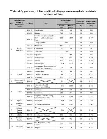 Wykaz dróg powiatowych Powiatu Strzeleckiego przeznaczonych do zamiatania nawierzchni dróg Miejscowość / pomiędzy Lp. Nr drogi miejscowościami Ulica Długość odcinka [m] Strona lewa Strona prawa 1801 O Ujazdowska 490 500 1,00 990 1804 O Habryki 340 340 1,00 680 1807 O Powstańców Śląskich (odc. DK 94 – ul. Piłsudskiego) i 1 Maja 810 1 267 1,00 2 077 1,00 370 370 1 Maja (rondo) 1 2 3 4 Strzelce Opolskie Ujazd Nogowczyce Jaryszów Leśnica Szerokość Powierzchnia zamiatania zamiatania [m] [m2] 2271 O Dworcowa 990 521 1,00 1 511 2272 O Cementowa 19 30 1,00 49 2273 O Zakładowa 1,00 170 2274 O Szpitalna 15 490 1,00 505 2275 O Mickiewicza 415 944 1,00 1 359 2278 O Matejki 930 935 1,00 1 865 2279 O Nowowiejska 1 310 1 320 1,00 2 630 2281 O Powstańców Śląskich (odc. ul. 1 Maja – ul. Dworcowa) 325 280 1,00 605 1455 O Żeromskiego 94 63 1,00 157 1458 O 3 Maja i Chrobrego 543 739 1,00 1 282 1461 O Strzelecka 470 455 1,00 925 1,00 1 291 1461 O 170 1 291 1401 O Zdzieszowicka, Pl. Narutowicza i 1 Maja 1471 O 1 154 1 539 1,00 2 693 Żyrowska 155 650 1,00 805 1472 O Krasowska 257 287 1,00 544 1805 O Porębska, Góra Św. Anny, Kościelna i Kozielska 1 532 1 215 1,00 2 747 5 Wysoka 1808 O Strzelecka 1 430 858 1,00 2 288 6 Góra Św. Anny 1808 O Strzelecka i Leśnicka 1 045 1 017 1,00 2 062 7 Lichynia Zalesie Śląskie 1401 O 1,00 1 240 8 Izbicko 1815 O 9 Izbicko Otmice 1809 O 10 Jemielnica 1 240 Powstańców Śląskich 890 885 1,00 1 775 1 520 785 1,00 2 305 1802 O Św. Wojciecha i Stara Kolonia 320 845 1,00 1 165 1841 O Wiejska 822 370 1,00 1 192 Miejscowość / pomiędzy Lp. Nr drogi miejscowoś10 Jemielnica ciami Strona lewa Strona prawa Szerokość Powierzchnia zamiatania zamiatania [m] [m2] 1855 O Szkolna 200 960 1,00 1 160 1804 O Ks. Czerwionki 697 1 011 1,00 1 708 1844 O 1 Maja 677 789 1,00 1 466 2131 O Arki Bożka 255 240 1,00 495 290 1,00 290 2132 O 11 1 Ulica Długość odcinka [m] Dworcowa (odc. ul. Arki Bożna - PKP) Dworcowa (odc. ul. Arki Bożna - las) 174 174 1,00 348 2133 O Kościuszki 101 38 1,00 139 2134 O Haraszowskie 15 320 1,00 335 2135 O Leśna (odc. DW 463 - ul. Ks. Czerwionki) 250 310 1,00 560 Leśna (odc. DW 463 - las) 261 80 1,00 341 1,00 720 1,00 1 744 1,00 44 588 Kolonowskie Strzelce Opolskie 12 Staniszcze Wielkie 1804 O Kościelna 720 13 Żędowice 1803 O Strzelecka 916 828 23 213 21 375 RAZEM 44 588
