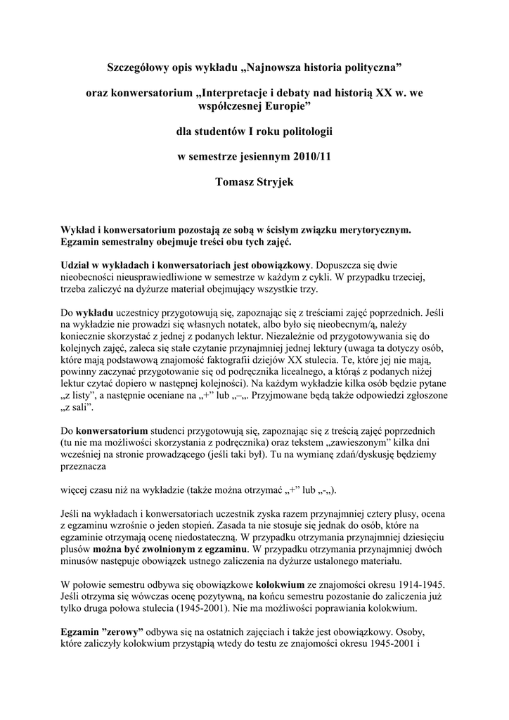Szczegółowy opis wykładu „Najnowsza historia polityczna” oraz konwersatorium „Interpretacje i debaty nad historią XX w. we współczesnej Europie” dla studentów I roku politologii w semestrze jesiennym 2010/11 Tomasz Stryjek Wykład i konwersatorium pozostają ze sobą w ścisłym związku merytorycznym. Egzamin semestralny obejmuje treści obu tych zajęć. Udział w wykładach i konwersatoriach jest obowiązkowy. Dopuszcza się dwie nieobecności nieusprawiedliwione w semestrze w każdym z cykli. W przypadku trzeciej, trzeba zaliczyć na dyżurze materiał obejmujący wszystkie trzy. Do wykładu uczestnicy przygotowują się, zapoznając się z treściami zajęć poprzednich. Jeśli na wykładzie nie prowadzi się własnych notatek, albo było się nieobecnym/ą, należy koniecznie skorzystać z jednej z podanych lektur. Niezależnie od przygotowywania się do kolejnych zajęć, zaleca się stałe czytanie przynajmniej jednej lektury (uwaga ta dotyczy osób, które mają podstawową znajomość faktografii dziejów XX stulecia. Te, które jej nie mają, powinny zaczynać przygotowanie się od podręcznika licealnego, a którąś z podanych niżej lektur czytać dopiero w następnej kolejności). Na każdym wykładzie kilka osób będzie pytane „z listy”, a następnie oceniane na „+” lub „–„. Przyjmowane będą także odpowiedzi zgłoszone „z sali”. Do konwersatorium studenci przygotowują się, zapoznając się z treścią zajęć poprzednich (tu nie ma możliwości skorzystania z podręcznika) oraz tekstem „zawieszonym” kilka dni wcześniej na stronie prowadzącego (jeśli taki był). Tu na wymianę zdań/dyskusję będziemy przeznacza więcej czasu niż na wykładzie (także można otrzymać „+” lub „-„). Jeśli na wykładach i konwersatoriach uczestnik zyska razem przynajmniej cztery plusy, ocena z egzaminu wzrośnie o jeden stopień. Zasada ta nie stosuje się jednak do osób, które na egzaminie otrzymają ocenę niedostateczną. W przypadku otrzymania przynajmniej dziesięciu plusów można być zwolnionym z egzaminu. W przypadku otrzymania przynajmniej dwóch minusów następuje obowiązek ustnego zaliczenia na dyżurze ustalonego materiału. W połowie semestru odbywa się obowiązkowe kolokwium ze znajomości okresu 1914-1945. Jeśli otrzyma się wówczas ocenę pozytywną, na końcu semestru pozostanie do zaliczenia już tylko druga połowa stulecia (1945-2001). Nie ma możliwości poprawiania kolokwium. Egzamin ”zerowy” odbywa się na ostatnich zajęciach i także jest obowiązkowy. Osoby, które zaliczyły kolokwium przystąpią wtedy do testu ze znajomości okresu 1945-2001 i napisania eseju dotyczącego tematów konwersatorium. Osoby, które nie zaliczyły kolokwium przystąpią wtedy do testu z okresu 1914-1945 (test z okresu 1945-2001 będą zaliczały na I terminie egzaminacyjnym w sesji) oraz w/w eseju. Na egzaminie „zerowym” w przypadku otrzymania oceny niedostatecznej z testu i/lub eseju sprawa ulega zapomnieniu, w przypadku otrzymania oceny pozytywnej nie można już skorzystać z terminu egzaminacyjnego w sesji (innymi słowy – tych ocen nie można już poprawić). W przypadku niezaliczenia i kolokwium i „zerówki”, uczestnicy „podchodzą” do całego stulecia na I (ew. II) terminie egzaminacyjnym w sesji. Studenci dwu kierunków indywidualnie uzgadniają z prowadzącym warunki zaliczenia przedmiotów. UWAGA: 12.11. wykład i konwersatorium nie odbędą się. Odpracujemy je 28.01. 26.11. Kolokwium – tylko test (w godzinach konwersatorium) 3.12. w godzinach wykładu i konwersatorium studenci I roku będą uczestniczyć w konferencji naukowej organizowanej przez Katedrę Historii Współczesnej i Ruchów Społecznych Instytutu 28.01. Egzamin zerowy: test i esej I W: 8.10 I wojna światowa i jej konsekwencje – początek nowoczesności Hobsbawm: s. 27-56, Kissinger: s. 213-231, Bankowicz I, s. 75-120, 133-139, Holzer: s. 56-133, Kennedy: s. 248-272, Historia, t. 18: s. 17-96, 212-226, I K: 8.10 Ludobójstwo – pojęcie, cechy. Polityka historyczna i polityka pamięci – pojęcia. Dziedzictwo b. imperium osmańskiego i Turcji kemalistowskiej dla współczesnych stosunków międzynarodowych (Armenia). II W: 15.10 Rewolucja w Rosji i w krajach europejskich 1917-1923. Bolszewizm. Sytuacja w koloniach w okresie międzywojennym Pipes: s. 525-548, Hobsbawm: s. 57-83, Courtois: r. 1, Bankowicz I: s. 120-133, 173-193, 253-263, Holzer: s. 140-152, 169-184, Historia, t. 18: s. 97-158, 227264, Bulliet: s. 199-207, Cameron: s. 341-354 II K: 15.10 Zbrodnie nazizmu i komunizmu. Spór o potrzebę komunistycznej „Norymbergi” III W: 22.10 Ład wersalski – źródła jego słabości. Wielki Kryzys. Kissinger: s. 232-262, Hobsbawm: s. 84-105, 137-169, Bankowicz I: s. 143-152, 206-242, 263-270, 279-291, Holzer: s. 164-169, 184-210, 228-237, Kitchen: 42141, Kennedy: s. 274-288, Dulffer: s. 39-50, Historia, t. 18: s. 182-211, 265296, 552-600, Cameron: s. 370-390 III K: 22.10 Idea jugosłowiańska i jej rozkład. Konflikty na Bałkanach Zachodnich w XX w. (1912-1918, 1941-1945, 1991-1999). Współczesne spory o pamięć. IV W: 29.10 Kryzys demokracji w Europie: faszyzm, nazizm i autorytaryzm 1919-1939 Hobsbawm: s. 106-136, Bankowicz I: s. 193-206, 291-307, 371-397, Holzer: s. 155-163, 216-227, 238-241, 263-297, Kitchen: 216-294, 295-402, 441-473, Historia, t. 18: s. 297-360, 375-431, 432-516, Kershaw: s. 13-150 IV K: 29.10 Niemcy (i Austria), ich wojenni satelici (Włochy, Węgry, Państwo Francuskie) i kooperanci (Szwecja, Szwajcaria) w zmaganiach z „ciemnymi” stronami przeszłości po 1945 r. Historikerstreit V W: 5.11 ZSRS w latach 1922-1939. Stalinizm. Kryzys i rozkład ładu wersalskiego w l. 30. Hobsbawm: s. 137-169, Kissinger: 263-378, Bankowicz I: s. 353-371, 411-420, Holzer: s. 211-215, 242-262, 314-337, Kitchen: s. 176-215, 403-440, 474-508, Historia, t. 18: s. 517-551, 690-762, Kennedy: s. 288-339, Bulliet: