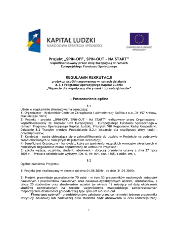 Projekt „SPIN-OFF, SPIN-OUT – NA START” współfinansowany przez Unię Europejską w ramach Europejskiego Funduszu Społecznego REGULAMIN REKRUTACJI projektu współfinansowanego w ramach działania 8.2.1 Programu Operacyjnego Kapitał Ludzki „Wsparcie dla współpracy sfery nauki i przedsiębiorstw” I. Postanowienia ogólne §1 Użyte w regulaminie sformułowania oznaczają: 1) Organizator – Krakowskie Centrum Zarządzania i Administracji Spółka z o.o.,31-157 Kraków, Plac Matejki 10/3; 2) Projekt – projekt „SPIN-OFF, SPIN-OUT – NA START” realizowany przez Organizatora i współfinansowany ze środków Unii Europejskiej – Europejskiego Funduszu Społecznego w ramach Programu Operacyjnego Kapitał Ludzki; Priorytet VIII Regionalne Kadry Gospodarki; Działanie 8.2 Transfer wiedzy; Poddziałanie 8.2.1 Wsparcie dla współpracy sfery nauki i przedsiębiorstw; 3) Kandydat – osoba ubiegająca się o zakwalifikowanie do udziału w Projekcie na podstawie zasad określonych w niniejszym Regulaminie Rekrutacji; 4) Beneficjent Ostateczny – kandydat, który po spełnieniu wszystkich wymogów określonych w niniejszym Regulaminie został dopuszczony do udziału w Projekcie; 5) szkoła wyższa, uczelnia, student, absolwent – dotyczą brzmienia ustawy z dnia 27 lipca 2005 r. – Prawo o szkolnictwie wyższym (Dz. U. Nr 164, poz. 1365, z późn. zm.). §2 Ogólne założenia Projektu: 1) Projekt jest realizowany w okresie od dnia 01.08.2008r. do dnia 31.03.2010r. 2) Projekt przewiduje przeszkolenie 70 osób – w tym 50 pracowników naukowych jednostek naukowych i pracowników naukowych oraz naukowo-dydaktycznych uczelni, doktorantów, a także 20 studentów oraz absolwentów uczelni (w okresie 12 miesięcy od daty ukończenia studiów) zamieszkałych na terenie województwa małopolskiego zainteresowanych rozpoczęciem działalności gospodarczej typu spin-off lub spin-out. Firma typu spin-off – przedsiębiorstwo założone przez co najmniej jednego pracownika instytucji naukowej lub badawczej albo studenta bądź absolwenta w celu komercjalizacji 1 innowacyjnych pomysłów lub technologii, zwykle zależne w pewien sposób (organizacyjnie, formalno-prawnie, finansowo) od organizacji macierzystej. Firma typu spin-out – przedsiębiorstwo, które zostało założone, przez co najmniej jednego pracownika instytucji naukowej lub badawczej albo studenta bądź absolwenta uczelni w celu komercjalizacji innowacyjnych pomysłów lub technologii, zwykle niezależne od jednostki macierzystej oraz posiadające niezależne źródła finansowania. 3) Zakres tematyczny szkolenia (72 godziny dydaktyczne) obejmuje: - Aspekty prawne prowadzenia działalności gospodarczej, w tym ścieżki / modele wchodzenia w działalność gospodarczą pracowników naukowych oraz studentów i absolwentów (firmy spinoff i spin-out). - Zakładanie i prowadzenia działalności gospodarczej. - Elementy prawa pracy. - Formy opodatkowania. - Plan marketingowy. - Badania rynku. - Komercjalizacja wynalazków i innowacyjnych technologii: udzielanie licencji, sprzedaż wynalazku. - Tworzenie biznes planu. - Źródła finansowania działalności gospodarczej, w tym zewnętrzne źródła finansowania projektów innowacyjnych i badawczych. - Zarządzanie małą firmą. 4) Zajęcia będą prowadzone metodą blended learning tj. połączenie warsztatów z samodzielną analizą opracowanych materiałów oraz pracą własną Beneficjentów Ostatecznych. Szkolenie będzie prowadzone średnio dwa razy w tygodniu (w dni robocze) w godzinach popołudniowych w wymiarze średnim 6 godzin tygodniowo. 5) Szkolenia będą prowadzone w następujących terminach: 1 edycja: listopad 2008r. – styczeń 2009r. – dwie grupy, 2 edycja: luty - maj 2009r. – dwie grupy, 3 edycja: czerwiec - wrzesień 2009r. – jedna grupa, 4 edycja: październik 2009r. – styczeń 2010 r. – dwie grupy,. Jednocześnie Organizator zastrzega sobie możliwość zmiany terminów szkoleń. 6) W ramach realizacji szkolenia każdy Beneficjent Ostateczny przygotuje i przedstawi Organizatorowi projekt własnej działalności spin-off lub spin-out opracowany samodzielnie lub w grupie. 7) Oprócz udziału w szkoleniu, każdy Beneficjent Ostateczny weźmie udział w 8 godzinach indywidualnych konsultacji (doradztwa). Konsultacje rozpoczną się po realizacji połowy części szkoleniowej i trwać będą do czterech tygodni po zakończeniu części szkoleniowej. 8) Udział Beneficjenta Ostatecznego w działaniach realizowanych w ramach Projektu jest bezpłatny. 9) W wyniku udziału w Projekcie pracownicy naukowi, doktoranci, studenci oraz absolwenci uczelni uzyskają umiejętności niezbędne do rozpoczęcia i prowadzenia działalności gospodarczej typu spin-off lub spin-out. 2 10) Każdy Beneficjent Ostateczny ma obowiązek wzięcia udziału w co najmniej 80% zajęć warsztatowych oraz we wszystkich indywidualnych konsultacjach, a także przygotować projekt działalności gospodarczej typu spin-off lub spin-out. 11) Organizator pokrywa następujące koszty związane ze szkoleniem oraz doradztwem: - całkowity koszt szkoleń oraz doradztwa, - całkowity koszt przygotowania materiałów szkoleniowych. 12) Organizator zobowiązuje się do przekazania każdemu Beneficjentowi Ostatecznemu materiałów szkoleniowych oraz materiałów promocyjnych (teczka na materiały dydaktyczne oraz długopis). 13) Podstawowym kryterium rekrutacji Beneficjentów Ostatecznych będzie kolejność zgłoszenia. 14) Organizator zakłada tworzenie list rezerwowych, które będą pomocne w przypadkach uzasadnionej rezygnacji Beneficjentów Ostatecznych w udziale w Projekcie z uwagi na wyższą konieczność. §3 1. Wszystkie informacje dotyczące realizacji Projektu dostępne są na stronie internetowej www.kczia.eu oraz w Biurze Projektu - Kraków, Plac Matejki 10/3, tel. (12) 429 41 41, 429 47 81. 2. Biuro Projektu jest czynne we wszystkie dni robocze w godzinach od 10.00 do 15.