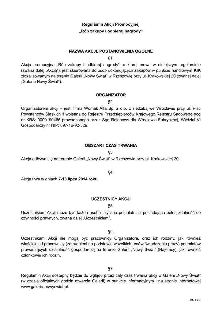 Regulamin Akcji Promocyjnej „Rób zakupy i odbieraj nagrody” NAZWA AKCJI, POSTANOWIENIA OGÓLNE §1. Akcja promocyjna „Rób zakupy i odbieraj nagrody”, o której mowa w niniejszym regulaminie (zwana dalej „Akcją”), jest skierowana do osób dokonujących zakupów w punkcie handlowym KIK zlokalizowanym na terenie Galerii „Nowy Świat” w Rzeszowie przy ul. Krakowskiej 20 (zwanej dalej „Galeria Nowy Świat”). ORGANIZATOR §2. Organizatorem akcji – jest: firma Womak Alfa Sp. z o.o. z siedzibą we Wrocławiu przy ul. Plac Powstańców Śląskich 1 wpisana do Rejestru Przedsiębiorców Krajowego Rejestru Sądowego pod nr KRS: 0000190466 prowadzonego przez Sąd Rejonowy dla Wrocławia-Fabrycznej, Wydział VI Gospodarczy nr NIP: 897-16-92-329. OBSZAR I CZAS TRWANIA §3. Akcja odbywa się na terenie Galerii „Nowy Świat” w Rzeszowie przy ul. Krakowskiej 20. §4. Akcja trwa w dniach 7-13 lipca 2014 roku. UCZESTNICY AKCJI §5. Uczestnikiem Akcji może być każda osoba fizyczna pełnoletnia i posiadająca pełną zdolność do czynności prawnych, zwana dalej „Uczestnikiem”. §6. Uczestnikami Akcji nie mogą być pracownicy Organizatora, oraz ich rodziny, jak również właściciele i pracownicy (zatrudnieni na podstawie wszelkich umów świadczenia pracy) podmiotów prowadzących działalność gospodarczą na terenie Galerii „Nowy Świat” (Najemcy), jak również członkowie ich rodzin. §7. Regulamin Akcji dostępny będzie do wglądu przez cały czas trwania akcji w Galerii „Nowy Świat” (w czasie oficjalnych godzin otwarcia Galerii) w punkcie informacyjnym i na stronie internetowej www.galeria-nowyswiat.pl. str. 1 z 3 ZASADY AKCJI §8. 1. Aby wziąć udział w Akcji Uczestnik musi dokonać w dniach 7-13 lipca 2014 roku jednorazowego zakupu w punkcie handlowym KIK zlokalizowanym w Galerii „Nowy Świat”, na kwotę minimum 20,00 złotych brutto. 2. Następnie Uczestnik akcji z dowodem zakupu powinien udać się do punktu informacyjnego zlokalizowanego na poziomie 0 Galerii „Nowy Świat”. Dowodami zakupu są faktury i paragony fiskalne dokumentujące faktycznie dokonaną transakcję. 3. Pracownik punktu na podstawie przedstawionego dowodu zakupu wyda Uczestnikowi Kupon Rabatowy wg. następujących zasad: - za każdy dowód zakupu na kwotę min. 20 zł i mniej niż 50 zł, voucher do Kina 6D lub voucher do Kinderplanety; - za każdy dowód zakupu na kwotę min. 50 zł i mniej niż 100 zł, voucher do Perfumerii Douglas lub voucher na 1 godzinę gry w kręgle do Kula Bowling & Club. - za każdy dowód zakupu na kwotę pow. 100 zł, voucher do Kosmetycznego Instytutu Dr Irena Eris lub salonu fryzjerskiego. Kwoty z odrębnych paragonów nie podlegają sumowaniu. 4. W punkcie informacyjnym Galerii prowadzona będzie ewidencja wydanych voucherów. POSTANOWIENIA KOŃCOWE §11. Wszelkie opisy wykorzystywane w materiałach reklamowych oraz promocyjnych niniejszej Akcji mają wyłącznie charakter ogólny i informacyjny. Moc wiążącą posiada jedynie niniejszy Regulamin w całej swojej treści. §12. Organizator zastrzega sobie prawo do wprowadzania zmian w Regulaminie lub przedłużenia bądź skrócenia czasu trwania Akcji bez podania przyczyn. Informacje o wprowadzeniu w Regulaminie, jak również przedłużeniu lub skróceniu czasu trwania Akcji zostaną opublikowane na stronie www.galeria-nowyswiat.pl i w punkcie informacyjnym Galerii „Nowy Świat”. Zmienione postanowienia obowiązują Uczestników od chwili ich opublikowania. Zmiany w Akcji nie mogą naruszać praw nabytych przez Uczestników. §13. Uczestnik przystępując do Akcji oświadcza, że zapoznał się z pełną treścią Regulaminu, akceptuje wszystkie warunki niniejszego Regulaminu oraz zapewnia, iż spełnia wszystkie niezbędne warunki uczestnictwa. str. 2 z 3 §14. 1. Jeżeli pojawią się jakiekolwiek okoliczności, w wyniku których nie dojdzie do skutku transakcja pomiędzy Uczestnikiem a punktem handlowym KIK z Galerii „Nowy Świat” (zwrot, faktura korygująca, anulowanie faktury, itp.), która to transakcja stanowiła podstawę do wydania odpowiedniej ilości Kuponów Rabatowych, dany Uczestnik będzie musiał niezwłocznie zwrócić otrzymane na tej podstawie Kupony lub ich nominalną wartość w gotówce Organizatorowi. 2. Przed dokonaniem operacji zwrotu towaru przez Uczestnika akcji, pracownik sklepu KIK ma obowiązek poinformować o tym fakcie Organizatora akcji, a Uczestnika akcji skierować do punktu informacyjnego Galerii, gdzie Uczestnik akcji ma obowiązek dokonać zwrotu otrzymanych korzyści na rzecz Organizatora w postaci otrzymanego vouchera bądź jego równowartość. 3. Po przedłożeniu przez Uczestnika akcji dowodu zakupu z adnotacją pracownika punktu informacyjnego dot. zwrotu KIK Galerii Nowy Swiat może dokonać operacji: zwrotu towaru przez Uczestnika akcji. §15. Wszelkie kwestie nieuregulowane niniejszym Regulaminem reguluje Kodeks Cywilny. §16. Akcja promocyjna nie jest grą losową, loterią fantową, zakładem wzajemnym ani loterią promocyjną, których wynik zależy od przypadku (przeprowadzenia losowania) w rozumieniu ustawy z dnia 19 listopada 2009 r. o grach hazardowych (tekst jedn. Dz U. z 2009 r, Nr 201, poz.1540). str. 3 z 3