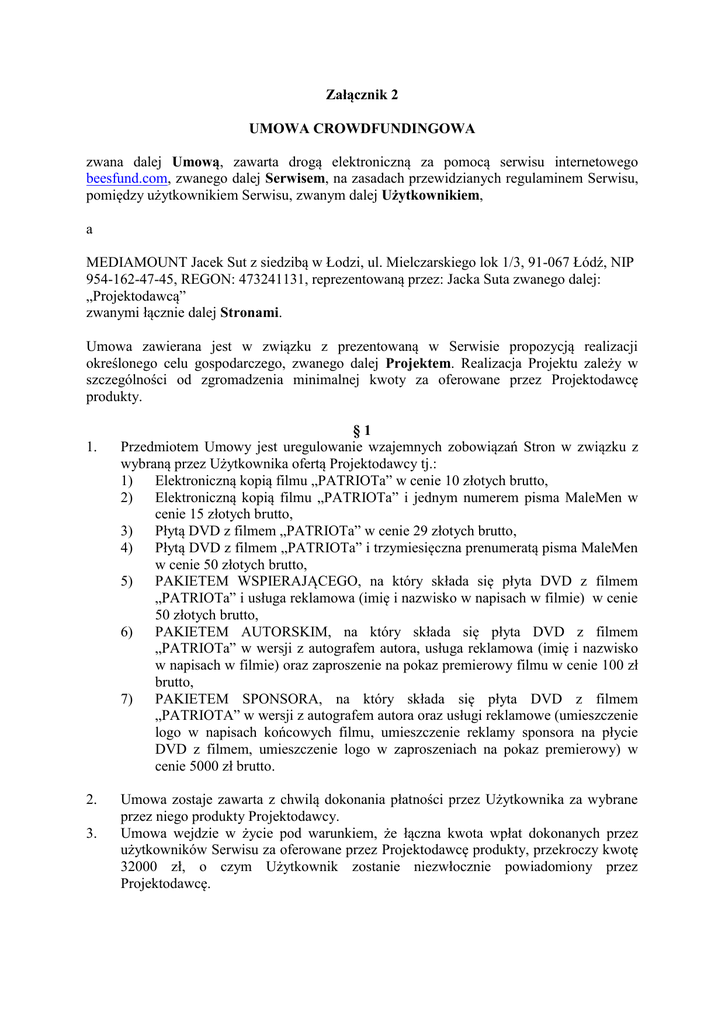Załącznik 2 UMOWA CROWDFUNDINGOWA zwana dalej Umową, zawarta drogą elektroniczną za pomocą serwisu internetowego beesfund.com, zwanego dalej Serwisem, na zasadach przewidzianych regulaminem Serwisu, pomiędzy użytkownikiem Serwisu, zwanym dalej Użytkownikiem, a MEDIAMOUNT Jacek Sut z siedzibą w Łodzi, ul. Mielczarskiego lok 1/3, 91-067 Łódź, NIP 954-162-47-45, REGON: 473241131, reprezentowaną przez: Jacka Suta zwanego dalej: „Projektodawcą” zwanymi łącznie dalej Stronami. Umowa zawierana jest w związku z prezentowaną w Serwisie propozycją realizacji określonego celu gospodarczego, zwanego dalej Projektem. Realizacja Projektu zależy w szczególności od zgromadzenia minimalnej kwoty za oferowane przez Projektodawcę produkty. 1. 2. 3. §1 Przedmiotem Umowy jest uregulowanie wzajemnych zobowiązań Stron w związku z wybraną przez Użytkownika ofertą Projektodawcy tj.: 1) Elektroniczną kopią filmu „PATRIOTa” w cenie 10 złotych brutto, 2) Elektroniczną kopią filmu „PATRIOTa” i jednym numerem pisma MaleMen w cenie 15 złotych brutto, 3) Płytą DVD z filmem „PATRIOTa” w cenie 29 złotych brutto, 4) Płytą DVD z filmem „PATRIOTa” i trzymiesięczna prenumeratą pisma MaleMen w cenie 50 złotych brutto, 5) PAKIETEM WSPIERAJĄCEGO, na który składa się płyta DVD z filmem „PATRIOTa” i usługa reklamowa (imię i nazwisko w napisach w filmie) w cenie 50 złotych brutto, 6) PAKIETEM AUTORSKIM, na który składa się płyta DVD z filmem „PATRIOTa” w wersji z autografem autora, usługa reklamowa (imię i nazwisko w napisach w filmie) oraz zaproszenie na pokaz premierowy filmu w cenie 100 zł brutto, 7) PAKIETEM SPONSORA, na który składa się płyta DVD z filmem „PATRIOTA” w wersji z autografem autora oraz usługi reklamowe (umieszczenie logo w napisach końcowych filmu, umieszczenie reklamy sponsora na płycie DVD z filmem, umieszczenie logo w zaproszeniach na pokaz premierowy) w cenie 5000 zł brutto. Umowa zostaje zawarta z chwilą dokonania płatności przez Użytkownika za wybrane przez niego produkty Projektodawcy. Umowa wejdzie w życie pod warunkiem, że łączna kwota wpłat dokonanych przez użytkowników Serwisu za oferowane przez Projektodawcę produkty, przekroczy kwotę 32000 zł, o czym Użytkownik zostanie niezwłocznie powiadomiony przez Projektodawcę. 4. 5. 6. 7. 1. 2. W razie niespełnienia się warunku, o którym mowa w ust. 3 powyżej, Umowa rozwiązuje się z chwilą zakończenia gromadzenia środków na realizację Projektu w Serwisie. Kwota wpłacona przez Użytkownika stanowi zaliczkę na poczet ceny za wybrane z oferty Projektodawcy produkty. Kwota wpłacona przez Użytkownika obejmuje koszty dostarczenia towaru (jeśli dotyczy). Projektodawca nie może uzależniać spełnienia zaoferowanych przez siebie świadczeń wybranych w Serwisie przez Użytkownika od dokonania jakichkolwiek dodatkowych wpłat, niezależnie od tytułu płatności chyba, że Umowa stanowi inaczej. §2 Wejście w życie Umowy oznacza zobowiązanie Projektodawcy do dostarczenia wybranego przez Użytkownika produktu, w terminie 90 dni od daty zakończenia Projektu. Przed wysyłką produktu do Użytkownika, Projektodawca zawiadomi Użytkownika o zamiarze wysłania produktu na znany Projektodawcy adres zamieszkania Użytkownika lub adres poczty elektronicznej Użytkownika, przesyłając stosowną wiadomość pocztą elektroniczną. Użytkownik uprawniony jest do podania Projektodawcy innego adresu dostawy produktu, przesyłając stosowną informację pocztą elektroniczną, w terminie 2 dni od daty zawiadomienia przez Projektodawcę. 5. §3 Użytkownikowi przysługuje prawo do odstąpienia od Umowy w terminie 10 dni od dnia dostarczenia zamówionych przez niego produktów poprzez przesłanie oświadczenia o odstąpieniu od Umowy na adres Projektodawcy. Zwracany towar nie może nosić śladów użytkowania i nie może być zniszczony, należy również dołączyć oświadczenie o odstąpieniu od umowy. Koszt przesyłki zwracanego towaru ponosi Użytkownik. W przypadku odstąpienia od Umowy Użytkownik jest zobowiązany do odesłania otrzymanych produktów na adres Projektodawcy, z wykorzystaniem usług Poczty Polskiej lub firmy kurierskiej uzgodnionej z Projektodawcą, w terminie 14 dni od dnia otrzymania przez Projektodawcę oświadczenia o odstąpieniu od Umowy, zaś odnośnie produktów dostarczonych droga elektroniczną, do zniszczenia/usunięcia wszelkich posiadanych egzemplarzy/kopii produktu oraz usunięcia produktu Projektodawcy z nośników informatycznych (takich jak np. dyski twarde, pamięć flash, poczta elektroniczna). Projektodawca zobowiązany jest do zwrotu Użytkownikowi, który złożył oświadczenie o odstąpieniu od Umowy, całej uiszczonej dotychczas przez Użytkownika kwoty przedpłaty. W przypadku odstąpienia przez Użytkownika od Umowy Projektodawca w terminie 14 dni od dnia otrzymania zwróconego produktu, prześle Użytkownikowi potwierdzenie otrzymania zwróconego produktu. Wszelkie reklamacje należy kierować w formie pisemnej na adres Projektodawcy. 1. 2. §4 Umowa podlega prawu polskiemu. Wszelkie zmiany Umowy wymagają formy pisemnej pod rygorem nieważności. 1. 2. 3. 4.