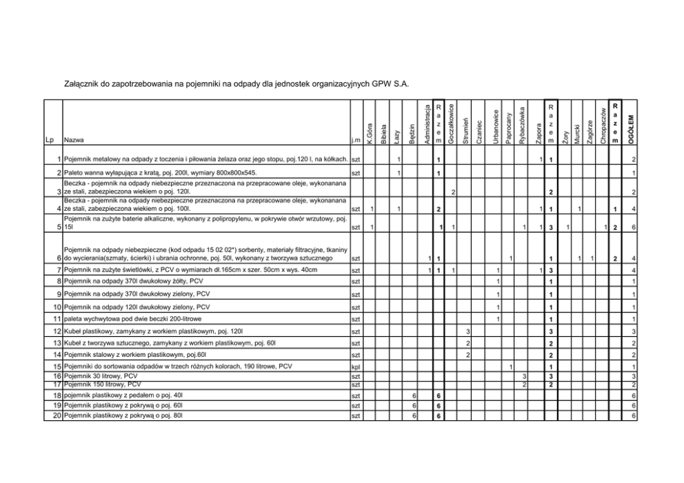 Załącznik do zapotrzebowania na pojemniki na odpady dla