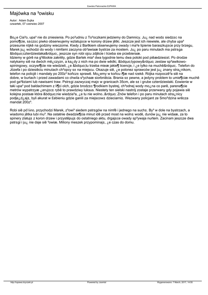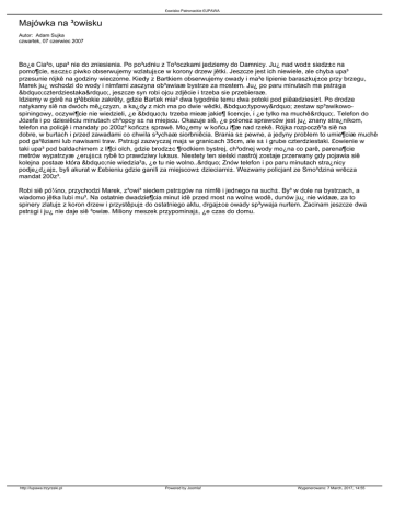 £owisko Patronackie £UPAWA Majówka na ³owisku Autor: Adam Sujka czwartek, 07 czerwiec 2007 Bo¿e Cia³o, upa³ nie do zniesienia. Po po³udniu z To³oczkami jedziemy do Damnicy. Ju¿ nad wod± siedz±c na pomo¶cie, s±cz±c piwko obserwujemy wzlatuj±ce w korony drzew jêtki. Jeszcze jest ich niewiele, ale chyba upa³ przesunie rójkê na godziny wieczorne. Kiedy z Bartkiem obserwujemy owady i ma³e lipienie baraszkuj±ce przy brzegu, Marek ju¿ wchodzi do wody i nimfami zaczyna ob³awiaæ bystrze za mostem. Ju¿ po paru minutach ma pstr±ga „czterdziestaka”, jeszcze syn robi ojcu zdjêcie i trzeba sie przebieraæ. Idziemy w górê na g³êbokie zakrêty, gdzie Bartek mia³ dwa tygodnie temu dwa potoki pod piêædziesi±t. Po drodze natykamy siê na dwóch mê¿czyzn, a ka¿dy z nich ma po dwie wêdki, „typowy” zestaw sp³awikowospiningowy, oczywi¶cie nie wiedzieli, ¿e „tu trzeba mieæ jakie¶ licencje, i ¿e tylko na muchê”. Telefon do Józefa i po dziesiêciu minutach ch³opcy s± na miejscu. Okazuje siê, ¿e polonez sprawców jest ju¿ znany stra¿nikom, telefon na policjê i mandaty po 200z³ koñcz± sprawê. Mo¿emy w koñcu i¶æ nad rzekê. Rójka rozpoczê³a siê na dobre, w burtach i przed zawadami co chwila s³ychaæ siorbniêcia. Brania s± pewne, a jedyny problem to umie¶ciæ muchê pod ga³êziami lub nawisami traw. Pstr±gi zazwyczaj maj± w granicach 35cm, ale s± i grube czterdziestaki. £owienie w taki upa³ pod baldachimem z li¶ci olch, gdzie brodz±c ¶rodkiem bystrej, ch³odnej wody mo¿na co parê, parena¶cie metrów wypatrzyæ ¿eruj±c± rybê to prawdziwy luksus. Niestety ten sielski nastrój zostaje przerwany gdy pojawia siê kolejna postaæ która „nie wiedzia³a, ¿e tu nie wolno..” Znów telefon i po paru minutach stra¿nicy podje¿d¿aj±, byli akurat w £ebieniu gdzie ganili za miejscow± dzieciarni±. Wezwany policjant ze Smo³dzina wrêcza mandat 200z³. Robi siê pó¼no, przychodzi Marek, z³owi³ siedem pstr±gów na nimfê i jednego na such±. By³ w dole na bystrzach, a wiadomo jêtka lubi mu³. Na ostatnie dwadzie¶cia minut idê przed most na woln± wodê, dunów ju¿ nie widaæ, za to spinery zlatuj± z koron drzew i przystêpuj± do ostatniego aktu, drgaj±ce owady sp³ywaja nurtem. Zacinam jeszcze dwa pstr±gi i ju¿ nie daje siê ³owiæ. Miliony meszek przypominaj±, ¿e czas do domu. http://lupawa.trzyrzeki.pl Powered by Joomla! Wygenerowano: 7 March, 2017, 14:55