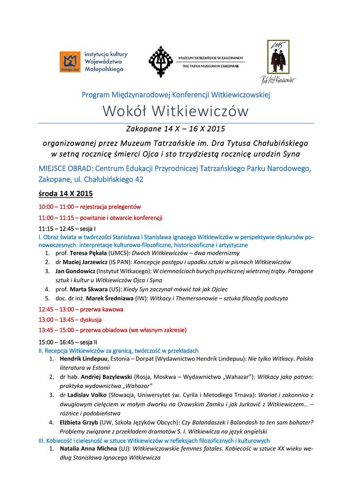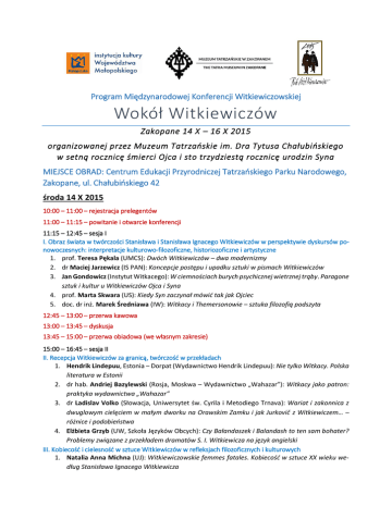 Program Międzynarodowej Konferencji Witkiewiczowskiej Wokół Witkiewiczów Zakopane 14 X – 16 X 2015 organizowanej przez Muzeum Tatrzańskie im. Dra Tytusa Chałubińskiego w setną rocznicę śmierci Ojca i sto trzydziestą rocznicę urodzin Syna MIEJSCE OBRAD: Centrum Edukacji Przyrodniczej Tatrzańskiego Parku Narodowego, Zakopane, ul. Chałubińskiego 42 środa 14 X 2015 10:00 – 11:00 – rejestracja prelegentów 11:00 – 11:15 – powitanie i otwarcie konferencji 11:15 – 12:45 – sesja I I. Obraz świata w twórczości Stanisława i Stanisława Ignacego Witkiewiczów w perspektywie dyskursów ponowoczesnych: interpretacje kulturowo-filozoficzne, historiozoficzne i artystyczne 1. prof. Teresa Pękala (UMCS): Dwóch Witkiewiczów – dwa modernizmy 2. dr Maciej Jarzewicz (IS PAN): Koncepcje postępu i upadku sztuki w pismach Witkiewiczów 3. Jan Gondowicz (Instytut Witkacego): W ciemnościach burych psychicznej wietrznej trąby. Paragone sztuk i kultur u Witkiewiczów Ojca i Syna 4. prof. Marta Skwara (US): Kiedy Syn zaczynał mówić tak jak Ojciec 5. doc. dr inż. Marek Średniawa (IW): Witkacy i Themersonowie – sztuka filozofią podszyta 12:45 – 13:00 – przerwa kawowa 13:00 – 13:45 – dyskusja 13:45 – 15:00 – przerwa obiadowa (we własnym zakresie) 15:00 – 16:45 – sesja II II. Recepcja Witkiewiczów za granicą, twórczość w przekładach 1. Hendrik Lindepuu, Estonia – Dorpat (Wydawnictwo Hendrik Lindepuu): Nie tylko Witkacy. Polska literatura w Estonii 2. dr hab. Andriej Bazylewski (Rosja, Moskwa – Wydawnictwo „Wahazar”): Witkacy jako patron: praktyka wydawnictwa „Wahazar” 3. dr Ladislav Volko (Słowacja, Uniwersytet św. Cyrila i Metodiego Trnava): Wariat i zakonnica z dwuglowym cielęciem w małym dworku na Orawskim Zamku i jak Jurkovič z Witkiewiczem… – różnice i podobieństwa 4. Elżbieta Grzyb (UW, Szkoła Języków Obcych): Czy Bałandaszek i Balandash to ten sam bohater? Problemy związane z przekładem dramatów S. I. Witkiewicza na język angielski III. Kobiecość i cielesność w sztuce Witkiewiczów w refleksjach filozoficznych i kulturowych 1. Natalia Anna Michna (UJ): Witkiewiczowskie femmes fatales. Kobiecość w sztuce XX wieku według Stanisława Ignacego Witkiewicza 2. Justyna Staroń (KUL): Kobiety w życiu Stanisława Witkiewicza. Glosy do listów 3. Magdalena Jarnotowska (UŁ): Rytuały cielesne Jadwigi i Stanisława Ignacego Witkiewiczów [komunikat] 16:45 – 17:00 – przerwa kawowa 17:00 – 18:45 – sesja III IV. Przyjaźnie, spotkania genealogie (cz. 1) 1. Elżbieta Witkiewicz-Schiele (rodzina Witkiewiczów): Nie tylko Witkiewiczowie… Dwa wieki z rodzinami Prószyńskich, Becków, Rabowskich i Schielów od Syberii po Zakopane 2. dr Maciej Pinkwart (wyst. ind.): Zakopiańskie szlaki Witkiewiczów 3. dr hab. Jerzy M. Roszkowski (MT): Witkiewiczowie – Piłsudscy. Wzajemne relacje 4. Lesław Dall (MT): Ziuk i Kochany Drogi Wujaszek, czyli Józef Piłsudski i Stanisław Witkiewicz 5. dr Marek Kochanowski (UwB): Obraz nowoczesnego świata w późnej twórczości Andrzeja Struga i w wybranych utworach Witkacego. Ścieżki wspólne 6. Maciej Krupa (Fundacja „Zakopiańczycy. W poszukiwaniu tożsamości”): Narty to jednak coś 7. prof. Wojciech Kosiński (PK): Wkład Witkiewiczów – Ojca i Syna – w kulturę, ze szczególnym uwzględnieniem stylu zakopiańskiego 18:45 – 19:15 – dyskusja 15 X 2015 (czwartek) 9:00 – 10:30 – sesja IV V. Gościnny blok literacki 1. Wiesław Aleksander Wójcik (CBG PTTK w Krakowie): „Na przełęczy” Stanisława Witkiewicza w wielkich syntezach literatury polskiej 2. dr Jakub Żmidziński (Uniwersytet Artystyczny w Poznaniu): Motywy muzyczne w prozie tatrzańskiej Stanisława Witkiewicza 3. prof. Dorota Heck (UWr): Stanisław Ignacy Witkiewicz w świetle postkolonializmu 4. prof. Małgorzata Łoboz (UWr): Zakryte Zaryte, czyli zakopiańszczyzna na styku kultur. Dygresje na marginesie lektury Witkacego 5. dr hab. Bogusław Bednarek (UWr): Rafała Malczewskiego „Od cepra do wariata” 10:30 – 11:15 – dyskusja 11:15 – 11:30 – przerwa kawowa 11:30 – 13:15 – sesja V VI. Witkacy – filozofia i jej pogranicza 1. dr hab. Andrzej Ostrowski (UMCS): Wspomnienia „Ja”, czyli o próbie przełamania solipsyzmu przez S. I. Witkiewicza 2. prof. Krzysztof Kościuszko (UWM): Witkacy uwikłany w spór między absolutną a relacyjną teorią przestrzeni 3. dr Magdalena Bizior-Dombrowska (UMK): „Nd. Pkl. + R. Ż. max” – Witkacego nuda „metafizycznego rzędu” 4. dr Maciej Dombrowski (UWr): Filozofia w przebraniu powieści. O Jedynym wyjściu Stanisława Ignacego Witkiewicza 5. Przemysław Pawlak (IW): Przeszczep głowy i gruczołów – biocybernetyczny tryumf mechanicyzmu w dramatach Witkacego 6. Magdalena Baraniak (UMK): Czy Witkacy stał się „eleuterystą”? Spór Stanisława Witkiewicza i Witkacego o romantyzm 7. Michał Deniziak (UW): Stanisław Witkiewicz w poszukiwaniu religii żywej 2 13:15 – 13:45 – dyskusja 13:45 – 15:00 – przerwa obiadowa (we własnym zakresie) 15:00 – 16:30 – sesja VI VII. Sztuki plastyczne 1. prof. Anna Sieradzka (UW): Stanisław Witkiewicz jako inspirator stylu zakopiańskiego w modzie kobiecej czasów Młodej Polski 2. dr Anna Żakiewicz (wys. ind.): Witkiewicz czy Witkacy? Spór o autorstwo pejzażu Przedwiośnie z kolekcji Janusza Jagmina 3. dr Małgorzata Vražič (UW): Lovrańskie pejzaże – polskie dylematy. Stanisław Witkiewicz w Lovranie 4. Magdalena Julia Staniucha (UJ): Wiatr Halny i problem Stimmungu w teorii i praktyce artystycznej Stanisława Witkiewicza 5. Beata Zgodzińska (Muzeum Pomorza Środkowego w Słupsku): O różnych sposobach ukazywania twarzy w portretach pastelowych Witkacego… 6. Paweł Polit (Muzeum Sztuki w Łodzi): Przestrzenie malarskie ciała własnego: Witkacy i MerleauPonty 16:30 – 16:45 – przerwa kawowa 16:45 – 17:45 – sesja VII VIII. Epistolografia, językoznawstwo 1.