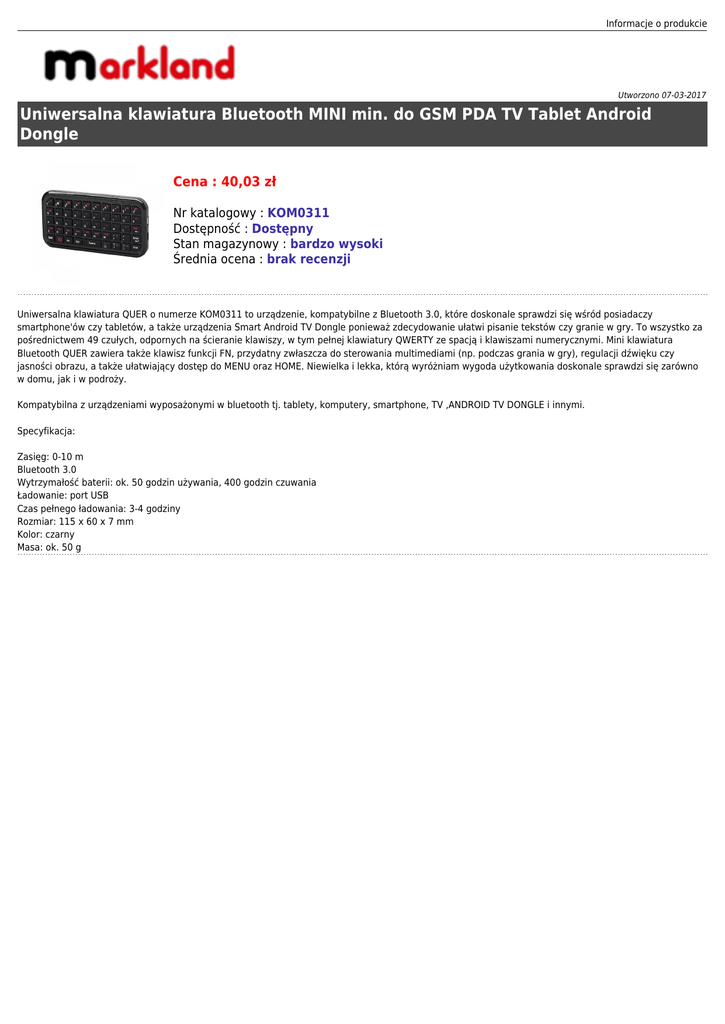 Informacje o produkcie Utworzono 07-03-2017 Uniwersalna klawiatura Bluetooth MINI min. do GSM PDA TV Tablet Android Dongle Cena : 40,03 zł Nr katalogowy : KOM0311 Dostępność : Dostępny Stan magazynowy : bardzo wysoki Średnia ocena : brak recenzji Uniwersalna klawiatura QUER o numerze KOM0311 to urządzenie, kompatybilne z Bluetooth 3.0, które doskonale sprawdzi się wśród posiadaczy smartphone'ów czy tabletów, a także urządzenia Smart Android TV Dongle ponieważ zdecydowanie ułatwi pisanie tekstów czy granie w gry. To wszystko za pośrednictwem 49 czułych, odpornych na ścieranie klawiszy, w tym pełnej klawiatury QWERTY ze spacją i klawiszami numerycznymi. Mini klawiatura Bluetooth QUER zawiera także klawisz funkcji FN, przydatny zwłaszcza do sterowania multimediami (np. podczas grania w gry), regulacji dźwięku czy jasności obrazu, a także ułatwiający dostęp do MENU oraz HOME. Niewielka i lekka, którą wyróżniam wygoda użytkowania doskonale sprawdzi się zarówno w domu, jak i w podroży. Kompatybilna z urządzeniami wyposażonymi w bluetooth tj. tablety, komputery, smartphone, TV ,ANDROID TV DONGLE i innymi. Specyfikacja: Zasięg: 0-10 m Bluetooth 3.0 Wytrzymałość baterii: ok. 50 godzin używania, 400 godzin czuwania Ładowanie: port USB Czas pełnego ładowania: 3-4 godziny Rozmiar: 115 x 60 x 7 mm Kolor: czarny Masa: ok. 50 g