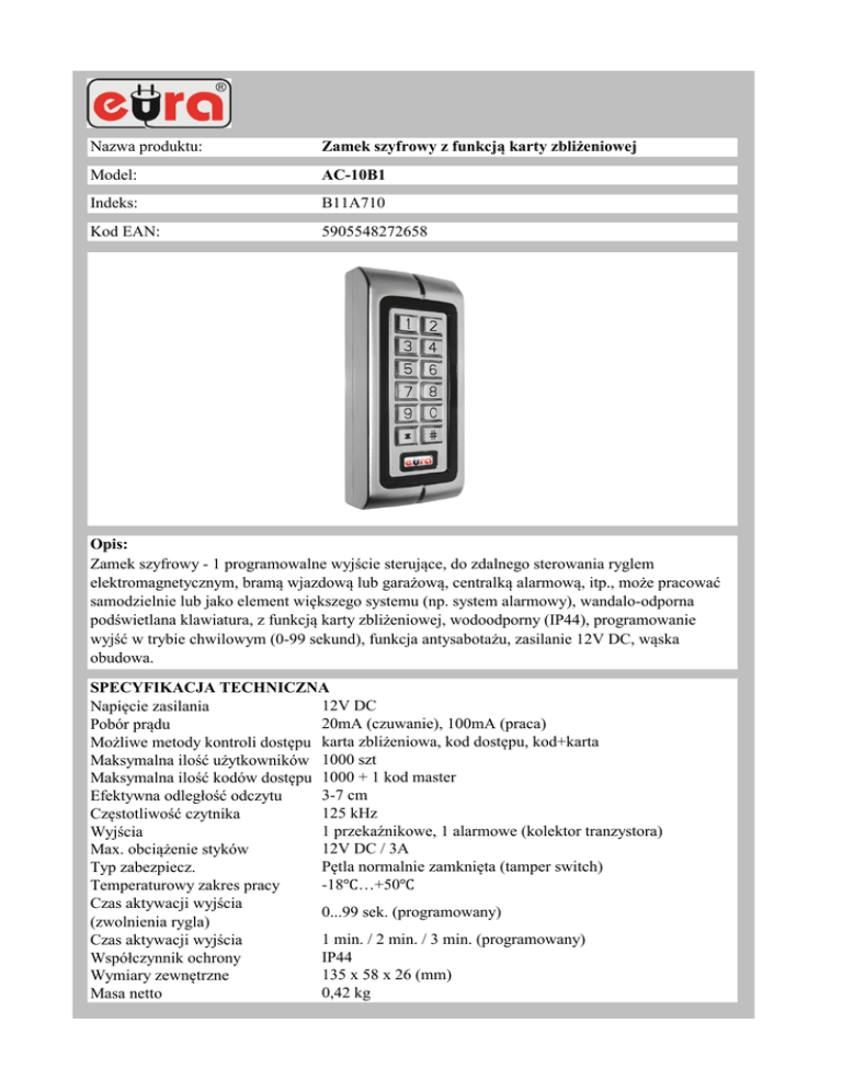 Nazwa produktu: Zamek szyfrowy z funkcją karty zbliżeniowej Model: AC-10B1 Indeks: B11A710 Kod EAN: 5905548272658 Opis: Zamek szyfrowy - 1 programowalne wyjście sterujące, do zdalnego sterowania ryglem elektromagnetycznym, bramą wjazdową lub garażową, centralką alarmową, itp., może pracować samodzielnie lub jako element większego systemu (np. system alarmowy), wandalo-odporna podświetlana klawiatura, z funkcją karty zbliżeniowej, wodoodporny (IP44), programowanie wyjść w trybie chwilowym (0-99 sekund), funkcja antysabotażu, zasilanie 12V DC, wąska obudowa. SPECYFIKACJA TECHNICZNA 12V DC Napięcie zasilania 20mA (czuwanie), 100mA (praca) Pobór prądu Możliwe metody kontroli dostępu karta zbliżeniowa, kod dostępu, kod+karta Maksymalna ilość użytkowników 1000 szt Maksymalna ilość kodów dostępu 1000 + 1 kod master 3-7 cm Efektywna odległość odczytu 125 kHz Częstotliwość czytnika 1 przekaźnikowe, 1 alarmowe (kolektor tranzystora) Wyjścia 12V DC / 3A Max. obciążenie styków Pętla normalnie zamknięta (tamper switch) Typ zabezpiecz. -18℃…+50℃ Temperaturowy zakres pracy Czas aktywacji wyjścia 0...99 sek. (programowany) (zwolnienia rygla) 1 min. / 2 min. / 3 min. (programowany) Czas aktywacji wyjścia IP44 Współczynnik ochrony 135 x 58 x 26 (mm) Wymiary zewnętrzne 0,42 kg Masa netto