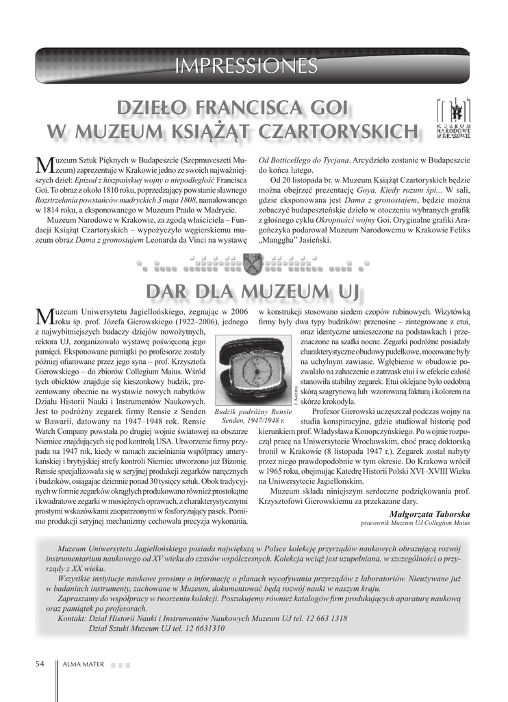 DZIEŁO FRANCISCA GOI W MUZEUM KSIĄŻĄT CZARTORYSKICH M uzeum Sztuk Pięknych w Budapeszcie (Szepmuveszeti Muzeum) zaprezentuje w Krakowie jedno ze swoich najważniejszych dzieł: Epizod z hiszpańskiej wojny o niepodległość Francisca Goi. To obraz z około 1810 roku, poprzedzający powstanie sławnego Rozstrzelania powstańców madryckich 3 maja 1808, namalowanego w 1814 roku, a eksponowanego w Muzeum Prado w Madrycie. Muzeum Narodowe w Krakowie, za zgodą właściciela – Fundacji Książąt Czartoryskich – wypożyczyło węgierskiemu muzeum obraz Dama z gronostajem Leonarda da Vinci na wystawę Od Botticellego do Tycjana. Arcydzieło zostanie w Budapeszcie do końca lutego. Od 20 listopada br. w Muzeum Książąt Czartoryskich będzie można obejrzeć prezentację Goya. Kiedy rozum śpi... W sali, gdzie eksponowana jest Dama z gronostajem, będzie można zobaczyć budapeszteńskie dzieło w otoczeniu wybranych grafik z głośnego cyklu Okropności wojny Goi. Oryginalne grafiki Aragończyka podarował Muzeum Narodowemu w Krakowie Feliks „Manggha” Jasieński. DAR DLA MUZEUM UJ M J. Kozina uzeum Uniwersytetu Jagiellońskiego, żegnając w 2006 w konstrukcji stosowano siedem czopów rubinowych. Wizytówką roku śp. prof. Józefa Gierowskiego (1922–2006), jednego firmy były dwa typy budzików: przenośne – zintegrowane z etui, z najwybitniejszych badaczy dziejów nowożytnych, oraz identyczne umieszczone na podstawkach i przerektora UJ, zorganizowało wystawę poświęconą jego znaczone na szafki nocne. Zegarki podróżne posiadały pamięci. Eksponowane pamiątki po profesorze zostały charakterystyczne obudowy pudełkowe, mocowane były później ofiarowane przez jego syna – prof. Krzysztofa na uchylnym zawiasie. Wgłębienie w obudowie poGierowskiego – do zbiorów Collegium Maius. Wśród zwalało na zahaczenie o zatrzask etui i w efekcie całość tych obiektów znajduje się kieszonkowy budzik, prestanowiła stabilny zegarek. Etui oklejane było ozdobną zentowany obecnie na wystawie nowych nabytków skórą szagrynową lub wzorowaną fakturą i kolorem na Działu Historii Nauki i Instrumentów Naukowych. skórze krokodyla. Jest to podróżny zegarek firmy Rensie z Senden Budzik podróżny Rensie Profesor Gierowski uczęszczał podczas wojny na Senden, 1947/1948 r. w Bawarii, datowany na 1947–1948 rok. Rensie studia konspiracyjne, gdzie studiował historię pod Watch Company powstała po drugiej wojnie światowej na obszarze kierunkiem prof. Władysława Konopczyńskiego. Po wojnie rozpoNiemiec znajdujących się pod kontrolą USA. Utworzenie firmy przy- czął pracę na Uniwersytecie Wrocławskim, choć pracę doktorską pada na 1947 rok, kiedy w ramach zacieśniania współpracy amery- bronił w Krakowie (8 listopada 1947 r.). Zegarek został nabyty kańskiej i brytyjskiej strefy kontroli Niemiec utworzono już Bizonię. przez niego prawdopodobnie w tym okresie. Do Krakowa wrócił Rensie specjalizowała się w seryjnej produkcji zegarków naręcznych w 1965 roku, obejmując Katedrę Historii Polski XVI–XVIII Wieku i budzików, osiągając dziennie ponad 30 tysięcy sztuk. Obok tradycyj- na Uniwersytecie Jagiellońskim. nych w formie zegarków okrągłych produkowano również prostokątne Muzeum składa niniejszym serdeczne podziękowania prof. i kwadratowe zegarki w mosiężnych oprawach, z charakterystycznymi Krzysztofowi Gierowskiemu za przekazane dary. prostymi wskazówkami zaopatrzonymi w fosforyzujący pasek. PomiMałgorzata Taborska mo produkcji seryjnej mechanizmy cechowała precyzja wykonania, pracownik Muzeum UJ Collegium Maius Muzeum Uniwersytetu Jagiellońskiego posiada największą w Polsce kolekcję przyrządów naukowych obrazującą rozwój instrumentarium naukowego od XV wieku do czasów współczesnych. Kolekcja wciąż jest uzupełniana, w szczególności o przyrządy z XX wieku. Wszystkie instytucje naukowe prosimy o informację o planach wycofywania przyrządów z laboratoriów. Nieużywane już w badaniach instrumenty, zachowane w Muzeum, dokumentować będą rozwój nauki w naszym kraju. Zapraszamy do współpracy w tworzeniu kolekcji. Poszukujemy również katalogów firm produkujących aparaturę naukową oraz pamiątek po profesorach. Kontakt: Dział Historii Nauki i Instrumentów Naukowych Muzeum UJ tel. 12 663 1318 Dział Sztuki Muzeum UJ tel. 12 6631310 54 ALMA MATER
