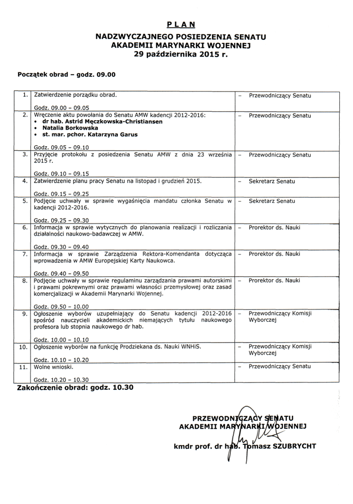 PLAN NADZWYCZAJNEGO POSIEDZENIA SENATU AKADEMII MARYNARKI WOJENNEJ 29 października 2015 r. Początek obrad - godz. 09.00 1. 2. 3. 4. Zatwierdzenie porządku obrad. Przewodniczący Senatu Godz. 09.00 - 09.05 Wręczenie aktu powołania do Senatu AMW kadencji 2012-2016: • dr hab. Astrid Męczkowska-Christiansen • Natalia Borkowska • st. mar. pchor. Katarzyna Garus Przewodniczący Senatu Godz. 09.05 - 09.10 Przyjęcie protokołu z posiedzenia Senatu AMW z dnia 23 września 2015 r. Godz. 09.10 -09.15 Zatwierdzenie planu pracy Senatu na listopad i grudzień 2015. Przewodniczący Senatu - Sekretarz Senatu 5. Godz. 09.15 - 09.25 Podjęcie uchwały w sprawie wygaśnięcia mandatu członka Senatu w kadencji 2012-2016. Sekretarz Senatu 6. Godz. 09.25 - 09.30 Informacja w sprawie wytycznych do planowania realizacji i rozliczania działalności naukowo-badawczej w AMW. Prorektor ds. Nauki 7. Godz. 09.30 - 09.40 Informacja w sprawie Zarządzenia Rektora-Komendanta dotycząca wprowadzenia w AMW Europejskiej Karty Naukowca. Prorektor ds. Nauki 8. Godz. 09.40 - 09.50 Podjęcie uchwały w sprawie regulaminu zarządzania prawami autorskimi i prawami pokrewnymi oraz prawami własności przemysłowej oraz zasad komercjalizacji w Akademii Marynarki Wojennej. 9. Godz. 09.50 - 10.00 Ogłoszenie wyborów uzupełniający do Senatu kadencji 2012-2016 spośród nauczycieli akademickich niemających tytułu naukowego profesora lub stopnia naukowego dr hab. 10. Godz. 10.00- 10.10 Ogłoszenie wyborów na funkcję Prodziekana ds. Nauki WNHiS. 11. Godz. 10.10 - 10.20 Wolne wnioski. Prorektor ds. Nauki Przewodniczący Komisji Wyborczej Przewodniczący Komisji Wyborczej Przewodniczący Senatu Godz. 10.20 - 10.30 Zakończenie obrad: godz. 10.30 PRZEWODNICZĄCY AKADEMII MARYŃAR kmdr prof. dr h ATU JENNEJ masz SZUBRYCHT