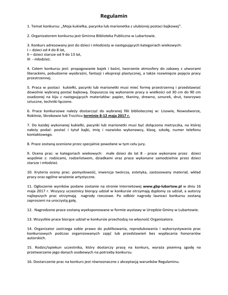 Regulamin 1. Temat konkursu: „Moja kukiełka, pacynka lub marionetka z ulubionej postaci bajkowej”. 2. Organizatorem konkursu jest Gminna Biblioteka Publiczna w Lubartowie. 3. Konkurs adresowany jest do dzieci i młodzieży w następujących kategoriach wiekowych: I – dzieci od 4 do 8 lat, II – dzieci starsze od 9 do 13 lat, III - młodzież. 4. Celem konkursu jest: propagowanie bajek i baśni, tworzenie atmosfery do zabawy z utworami literackimi, pobudzenie wyobraźni, fantazji i ekspresji plastycznej, a także rozwinięcie pojęcia pracy przestrzennej. 5. Praca w postaci kukiełki, pacynki lub marionetki musi mieć formę przestrzenną i przedstawiać dowolnie wybraną postać bajkową. Dopuszcza się wykonanie pracy o wielkości od 30 cm do 90 cm osadzonej na kiju z następujących materiałów: papier, tkaniny, drewno, sznurek, drut, tworzywo sztuczne, techniki łączone. 6. Prace konkursowe należy dostarczyć do wybranej filii bibliotecznej w: Lisowie, Nowodworze, Rokitnie, Skrobowie lub Trzcińcu terminie 8-12 maja 2017 r. 7. Do każdej wykonanej kukiełki, pacynki lub marionetki musi być dołączona metryczka, na której należy podać: postać i tytuł bajki, imię i nazwisko wykonawcy, klasę, szkołę, numer telefonu kontaktowego. 8. Prace zostaną ocenione przez specjalnie powołane w tym celu jury. 9. Ocena prac: w kategoriach wiekowych: małe dzieci do lat 8 - prace wykonane przez dzieci wspólnie z: rodzicami, rodzeństwem, dziadkami oraz prace wykonane samodzielnie przez dzieci starsze i młodzież. 10. Kryteria oceny prac: pomysłowość, inwencja twórcza, estetyka, zastosowany materiał, wkład pracy oraz ogólne wrażenie artystyczne. 11. Ogłoszenie wyników podane zostanie na stronie internetowej www.gbp-lubartow.pl w dniu 16 maja 2017 r. Wszyscy uczestnicy biorący udział w konkursie otrzymają dyplomy za udział, a autorzy najlepszych prac otrzymają nagrody rzeczowe. Po odbiór nagrody laureaci konkursu zostaną zaproszeni na uroczystą galę. 12. Nagrodzone prace zostaną wyeksponowane w formie wystawy w Urzędzie Gminy w Lubartowie. 13. Wszystkie prace biorące udział w konkursie przechodzą na własność Organizatora. 14. Organizator zastrzega sobie prawo do publikowania, reprodukowania i wykorzystywania prac konkursowych podczas organizowanych zajęć lub przedstawień bez wypłacania honorariów autorskich. 15. Rodzic/opiekun uczestnika, który dostarczy pracę na konkurs, wyraża pisemną zgodę na przetwarzanie jego danych osobowych na potrzeby konkursu. 16. Dostarczenie prac na konkurs jest równoznaczne z akceptacją warunków Regulaminu.