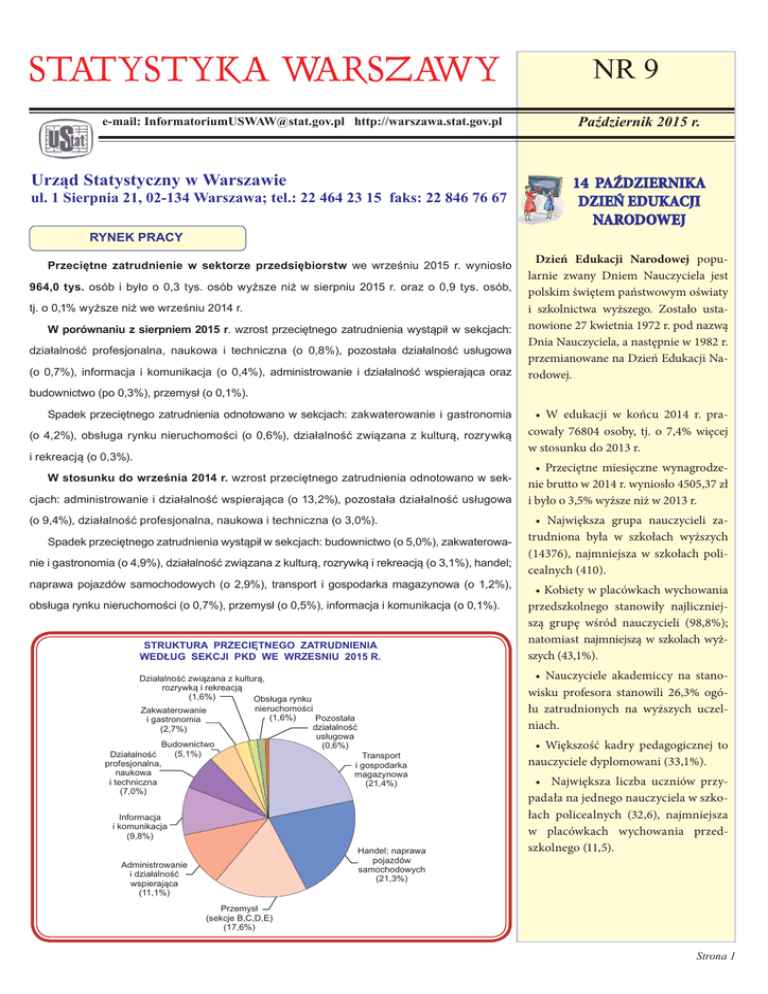 STATYSTYKA WARSZAWY e-mail: [email protected] http://warszawa.stat.gov.pl Urząd Statystyczny w Warszawie ul. 1 Sierpnia 21, 02-134 Warszawa; tel.: 22 464 23 15 faks: 22 846 76 67 NR 9 Październik 2015 r. 14 PAŹDZIERNIKA DZIEŃ EDUKACJI NARODOWEJ RYNEK PRACY Przeciętne zatrudnienie w sektorze przedsiębiorstw we wrześniu 2015 r. wyniosło 964,0 tys. osób i było o 0,3 tys. osób wyższe niż w sierpniu 2015 r. oraz o 0,9 tys. osób, tj. o 0,1% wyższe niż we wrześniu 2014 r. W porównaniu z sierpniem 2015 r. wzrost przeciętnego zatrudnienia wystąpił w sekcjach: działalność profesjonalna, naukowa i techniczna (o 0,8%), pozostała działalność usługowa (o 0,7%), informacja i komunikacja (o 0,4%), administrowanie i działalność wspierająca oraz Dzień Edukacji Narodowej popularnie zwany Dniem Nauczyciela jest polskim świętem państwowym oświaty i szkolnictwa wyższego. Zostało ustanowione 27 kwietnia 1972 r. pod nazwą Dnia Nauczyciela, a następnie w 1982 r. przemianowane na Dzień Edukacji Narodowej. budownictwo (po 0,3%), przemysł (o 0,1%). Spadek przeciętnego zatrudnienia odnotowano w sekcjach: zakwaterowanie i gastronomia (o 4,2%), obsługa rynku nieruchomości (o 0,6%), działalność związana z kulturą, rozrywką i rekreacją (o 0,3%). W stosunku do września 2014 r. wzrost przeciętnego zatrudnienia odnotowano w sekcjach: administrowanie i działalność wspierająca (o 13,2%), pozostała działalność usługowa (o 9,4%), działalność profesjonalna, naukowa i techniczna (o 3,0%). Spadek przeciętnego zatrudnienia wystąpił w sekcjach: budownictwo (o 5,0%), zakwaterowanie i gastronomia (o 4,9%), działalność związana z kulturą, rozrywką i rekreacją (o 3,1%), handel; naprawa pojazdów samochodowych (o 2,9%), transport i gospodarka magazynowa (o 1,2%), obsługa rynku nieruchomości (o 0,7%), przemysł (o 0,5%), informacja i komunikacja (o 0,1%). STRUKTURA PRZECIĘTNEGO ZATRUDNIENIA WEDŁUG SEKCJI PKD WE WRZESNIU 2015 R. Działalność związana z kulturą, rozrywką i rekreacją (1,6%) Obsługa rynku nieruchomości Zakwaterowanie (1,6%) Pozostała i gastronomia działalność (2,7%) usługowa Budownictwo (0,6%) (5,1%) Działalność Transport profesjonalna, i gospodarka naukowa magazynowa i techniczna (21,4%) (7,0%) Informacja i komunikacja (9,8%) Handel; naprawa pojazdów samochodowych (21,3%) Administrowanie i działalność wspierająca (11,1%) • W edukacji w końcu 2014 r. pracowały 76804 osoby, tj. o 7,4% więcej w stosunku do 2013 r. • Przeciętne miesięczne wynagrodzenie brutto w 2014 r. wyniosło 4505,37 zł i było o 3,5% wyższe niż w 2013 r. • Największa grupa nauczycieli zatrudniona była w szkołach wyższych (14376), najmniejsza w szkołach policealnych (410). • Kobiety w placówkach wychowania przedszkolnego stanowiły najliczniejszą grupę wśród nauczycieli (98,8%); natomiast najmniejszą w szkolach wyższych (43,1%). • Nauczyciele akademiccy na stanowisku profesora stanowili 26,3% ogółu zatrudnionych na wyższych uczelniach. • Większość kadry pedagogicznej to nauczyciele dyplomowani (33,1%). • Największa liczba uczniów przypadała na jednego nauczyciela w szkołach policealnych (32,6), najmniejsza w placówkach wychowania przedszkolnego (11,5). Przemysł (sekcje B,C,D,E) (17,6%) Strona 1 RYNEK PRACY (dok.) Podstawowe dane o m.st. Warszawie W końcu września 2015 r. liczba zarejestrowanych bezrobotnych wyniosła 43049 osób, była o 668 osób, tj. o 1,5% mniejsza niż w końcu sierpnia 2015 r. i o 8207 osób, tj. o 16,0% mniej- Przeciętne zatrudnienie w sektorze przedsiębiorstw we wrześniu 2015 r. wyniosło 964,0 tys. osób i było o 0,1% wyższe niż przed rokiem. sza niż w analogicznym okresie 2014 r. Liczba zarejestrowanych bezrobotnych kobiet wyniosła 21012, co stanowiło 48,8% ogółu bezrobotnych (przed miesiącem 48,9%, przed rokiem 48,6%) i 19,3% bezrobotnych kobiet w województwie mazowieckim. W stosunku do sierpnia 2015 r. liczba bezrobotnych kobiet Przeciętne miesięczne wynagrodze- zmniejszyła się o 369 osób, tj. o 1,7%, a w stosunku do września 2014 r. zmniejszyła się nie brutto w sektorze przedsiębiorstw o 3889 osób, tj. o 15,6%. we wrześniu 2015 r. wyniosło 5251,78 zł Stopa bezrobocia rejestrowanego wynosiła 3,7% (w sierpniu 2015 r. wynosiła 3,8%, i było o 5,2% wyższe niż we wrześniu a we wrześniu 2014 r. 4,5%), średnia w województwie mazowieckim kształtowała się na po- 2014 r. W końcu września 2015 r. liczba zarejestrowanych bezrobotnych wyniosła 43049 osób i była o 16,0% mniejsza niż przed rokiem, a stopa bezrobocia ukształtowała się na poziomie 3,7%. ziomie 8,6% (przed miesiącem 8,7%, a przed rokiem 10,0%), natomiast w kraju na poziomie 9,7% (przed miesiącem 9,9%, a przed rokiem 11,5%). We wrześniu 2015 r. zarejestrowano w urzędach pracy 4496 osób bezrobotnych (3758 w sierpniu 2015 r., a 5115 we wrześniu 2014 r.). Bezrobotni zarejestrowani stanowili 17,1% ogółu zarejestrowanych bezrobotnych w województwie. Liczba osób rejestrujących się po raz pierwszy wyniosła 1329 (przed miesiącem 1200), W końcu września 2015 r. liczba kobiet, które nie podjęły zatrudnienia po urodzeniu dziecka wyniosła 3534, tj. 16,8% ogółu zarejestrowanych bezrobotnych kobiet. co stanowiło 29,6% ogółu nowo zarejestrowanych bezrobotnych oraz 19,7% zarejestrowanych po raz pierwszy w województwie. Udział osób zwolnionych z przyczyn dotyczących zakładu pracy wśród bezrobotnych zarejestrowanych we wrześniu 2015 r. wyniósł 4,0% (w województwie mazowieckim 4,2%), przed miesiącem 5,3%, a przed rokiem 5,6%. We wrześniu 2015 r. wyrejestrowano z ewidencji bezrobotnych 5164 osoby (4305 Produkcja sprzedana przemysłu w sierpniu 2015 r., a 6043 we wrześniu 2014 r.), co stanowiło 17,9% wyrejestrowanych (w cenach stałych) we wrześniu 2015 r. z ewidencji bezrobotnych w województwie mazowieckim. Spośród wyrejestrowanych bezro- była o 2,4% większa niż