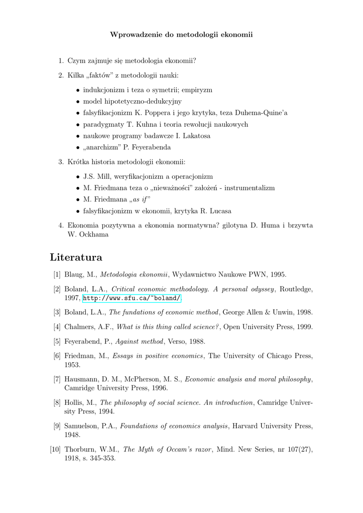 Wprowadzenie do metodologii ekonomii 1. Czym zajmuje sie, metodologia ekonomii? 2. Kilka faktów” z metodologii nauki: ” • indukcjonizm i teza o symetrii; empiryzm • model hipotetyczno-dedukcyjny • falsyfikacjonizm K. Poppera i jego krytyka, teza Duhema-Quine’a • paradygmaty T. Kuhna i teoria rewolucji naukowych • naukowe programy badawcze I. Lakatosa • anarchizm” P. Feyerabenda ” 3. Krótka historia metodologii ekonomii: • J.S. Mill, weryfikacjonizm a operacjonizm • M. Friedmana teza o nieważności” zalożeń - instrumentalizm ” • M. Friedmana as if ” ” • falsyfikacjonizm w ekonomii, krytyka R. Lucasa 4. Ekonomia pozytywna a ekonomia normatywna? gilotyna D. Huma i brzywta W. Ockhama Literatura [1] Blaug, M., Metodologia ekonomii , Wydawnictwo Naukowe PWN, 1995. [2] Boland, L.A., Critical economic methodology. A personal odyssey, Routledge, 1997, http://www.sfu.ca/~boland/. [3] Boland, L.A., The fundations of economic method , George Allen & Unwin, 1998. [4] Chalmers, A.F., What is this thing called science? , Open University Press, 1999. [5] Feyerabend, P., Against method , Verso, 1988. [6] Friedman, M., Essays in positive economics, The University of Chicago Press, 1953. [7] Hausmann, D. M., McPherson, M. S., Economic analysis and moral philosophy, Camridge University Press, 1996. [8] Hollis, M., The philosophy of social science. An introduction, Camridge University Press, 1994. [9] Samuelson, P.A., Foundations of economics analysis, Harvard University Press, 1948. [10] Thorburn, W.M., The Myth of Occam’s razor , Mind. New Series, nr 107(27), 1918, s. 345-353.