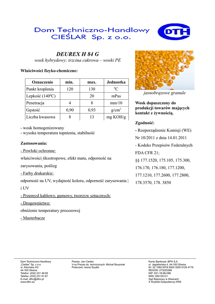 DEUREX H 84 G wosk hybrydowy; trzcina cukrowa – woski PE Właściwości fizyko-chemiczne: Oznaczenie min. max. Punkt kroplenia 120 130 Lepkość (1400C) Penetracja Gęstość Liczba kwasowa Jednostka 0 C 20 mPas 4 8 mm/10 0,90 0,93 g/cm3 8 13 mg KOH/g jasnobrązowe granule Wosk dopuszczony do produkcji towarów mających kontakt z żywnością. Zgodność: - wosk homogenizowany - wysoka temperatura topnienia, stabilność - Rozporządzenie Komisji (WE) Nr 10/2011 z dnia 14.01.2011 Zastosowania: - Kodeks Przepisów Federalnych - Powłoki ochronne: FDA CFR 21; właściwości tiksotropowe, efekt matu, odporność na §§ 177.1520, 175.105, 175.300, zarysowania, poślizg 176.170, 176.180, 177.1200, - Farby drukarskie: 177.1210, 177.2600, 177.2800, odporność na UV, wydajność koloru, odporność zarysowania | 178.3570, 178. 3850 i UV - Przemysł kablowy, gumowy, tworzyw sztucznych: - Drogownictwo: obniżenie temperatury procesowej - Masterbacze Dom Techniczno-Handlowy „Cieślar” Sp. z o.o. ul. Arkońska 4/2 44-100 Gliwice Telefon: (032) 231 48 69 Telefax: (032) 231 81 87 E-mail: [email protected] www.dthc.eu Prezes: Jan Cieślar V-ce Prezes ds. technicznych: Michał Słuszniak Prokurent: Iwona Szydło Konto Bankowe: BPH S.A. ul. Jagiellońska 4, 44-100 Gliwice Nr: 52 1060 0076 0000 3200 0129 4719 REGON: 273225368 NIP: 631-18-96-088 KRS: 000120121 Sąd Rejonowy w Gliwicach X Wydział Gospodarczy KRS