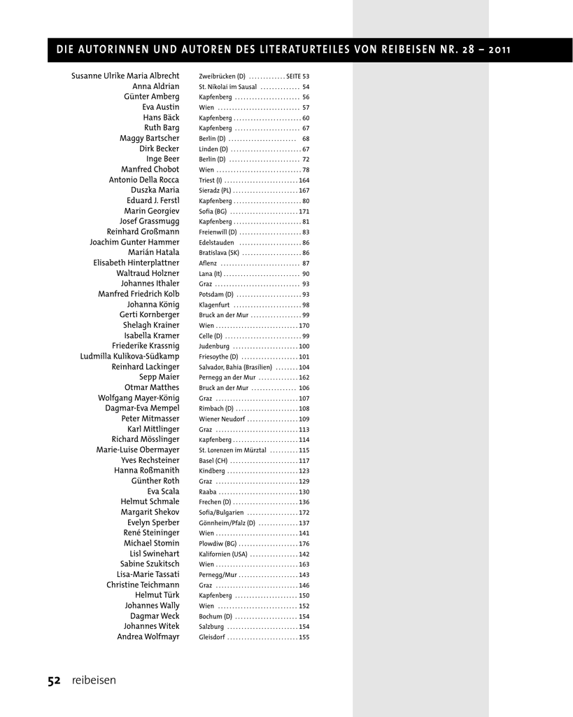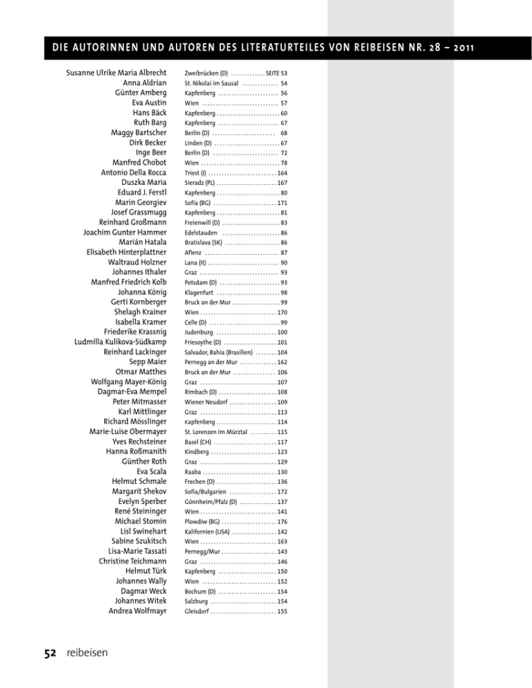 D I E AUTO R I N N E N U N D AUTO R E N D E S L ITE R ATU RTE I L E S VO N R E I B E I S E N N R . 2 8 – 2 0 1 1 Susanne Ulrike Maria Albrecht Anna Aldrian Günter Amberg Eva Austin Hans Bäck Ruth Barg Maggy Bartscher Dirk Becker Inge Beer Manfred Chobot Antonio Della Rocca Duszka Maria Eduard J. Ferstl Marin Georgiev Josef Grassmugg Reinhard Großmann Joachim Gunter Hammer Marián Hatala Elisabeth Hinterplattner Waltraud Holzner Johannes Ithaler Manfred Friedrich Kolb Johanna König Gerti Kornberger Shelagh Krainer Isabella Kramer Friederike Krassnig Ludmilla Kulikova-Südkamp Reinhard Lackinger Sepp Maier Otmar Matthes Wolfgang Mayer-König Dagmar-Eva Mempel Peter Mitmasser Karl Mittlinger Richard Mösslinger Marie-Luise Obermayer Yves Rechsteiner Hanna Roßmanith Günther Roth Eva Scala Helmut Schmale Margarit Shekov Evelyn Sperber René Steininger Michael Stomin Lisl Swinehart Sabine Szukitsch Lisa-Marie Tassati Christine Teichmann Helmut Türk Johannes Wally Dagmar Weck Johannes Witek Andrea Wolfmayr 52 reibeisen Zweibrücken (D) . . . . . . . . . . . . . SEITE 53 St. Nikolai im Sausal . . . . . . . . . . . . . . 54 Kapfenberg . . . . . . . . . . . . . . . . . . . . . . . 56 Wien . . . . . . . . . . . . . . . . . . . . . . . . . . . . . 57 Kapfenberg . . . . . . . . . . . . . . . . . . . . . . . . 60 Kapfenberg . . . . . . . . . . . . . . . . . . . . . . . 67 Berlin (D) . . . . . . . . . . . . . . . . . . . . . . . . 68 Linden (D) . . . . . . . . . . . . . . . . . . . . . . . . . 67 Berlin (D) . . . . . . . . . . . . . . . . . . . . . . . . . 72 Wien . . . . . . . . . . . . . . . . . . . . . . . . . . . . . . 78 Triest (I) . . . . . . . . . . . . . . . . . . . . . . . . . . 164 Sieradz (PL) . . . . . . . . . . . . . . . . . . . . . . . 167 Kapfenberg . . . . . . . . . . . . . . . . . . . . . . . . 80 Sofia (BG) . . . . . . . . . . . . . . . . . . . . . . . . 171 Kapfenberg . . . . . . . . . . . . . . . . . . . . . . . . 81 Freienwill (D) . . . . . . . . . . . . . . . . . . . . . . 83 Edelstauden . . . . . . . . . . . . . . . . . . . . . . 86 Bratislava (SK) . . . . . . . . . . . . . . . . . . . . . 86 Aflenz . . . . . . . . . . . . . . . . . . . . . . . . . . . . 87 Lana (It) . . . . . . . . . . . . . . . . . . . . . . . . . . . 90 Graz . . . . . . . . . . . . . . . . . . . . . . . . . . . . . . 93 Potsdam (D) . . . . . . . . . . . . . . . . . . . . . . . 93 Klagenfurt . . . . . . . . . . . . . . . . . . . . . . . . 98 Bruck an der Mur . . . . . . . . . . . . . . . . . . 99 Wien . . . . . . . . . . . . . . . . . . . . . . . . . . . . . 170 Celle (D) . . . . . . . . . . . . . . . . . . . . . . . . . . . 99 Judenburg . . . . . . . . . . . . . . . . . . . . . . . 100 Friesoythe (D) . . . . . . . . . . . . . . . . . . . . 101 Salvador, Bahia (Brasilien) . . . . . . . . 104 Pernegg an der Mur . . . . . . . . . . . . . . 162 Bruck an der Mur . . . . . . . . . . . . . . . . 106 Graz . . . . . . . . . . . . . . . . . . . . . . . . . . . . . 107 Rimbach (D) . . . . . . . . . . . . . . . . . . . . . . 108 Wiener Neudorf . . . . . . . . . . . . . . . . . . 109 Graz . . . . . . . . . . . . . . . . . . . . . . . . . . . . . 113 Kapfenberg . . . . . . . . . . . . . . . . . . . . . . . 114 St. Lorenzen im Mürztal . . . . . . . . . . 115 Basel (CH) . . . . . . . . . . . . . . . . . . . . . . . . 117 Kindberg . . . . . . . . . . . . . . . . . . . . . . . . . 123 Graz . . . . . . . . . . . . . . . . . . . . . . . . . . . . . 129 Raaba . . . . . . . . . . . . . . . . . . . . . . . . . . . . 130 Frechen (D) . . . . . . . . . . . . . . . . . . . . . . . 136 Sofia/Bulgarien . . . . . . . . . . . . . . . . . . 172 Gönnheim/Pfalz (D) . . . . . . . . . . . . . . 137 Wien . . . . . . . . . . . . . . . . . . . . . . . . . . . . . 141 Plowdiw (BG) . . . . . . . . . . . . . . . . . . . . . 176 Kalifornien (USA) . . . . . . . . . . . . . . . . . 142 Wien . . . . . . . . . . . . . . . . . . . . . . . . . . . . . 163 Pernegg/Mur . . . . . . . . . . . . . . . . . . . . . 143 Graz . . . . . . . . . . . . . . . . . . . . . . . . . . . . . 146 Kapfenberg . . . . . . . . . . . . . . . . . . . . . . 150 Wien . . . . . . . . . . . . . . . . . . . . . . . . . . . . 152 Bochum (D) . . . . . . . . . . . . . . . . . . . . . . 154 Salzburg . . . . . . . . . . . . . . . . . . . . . . . . . 154 Gleisdorf . . . . . . . . . . . . . . . . . . . . . . . . . 155