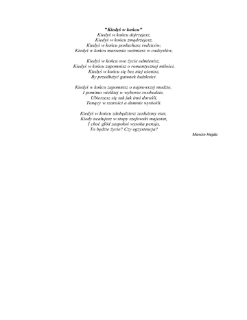 "Kiedyś w końcu" Kiedyś w końcu dojrzejesz, Kiedyś w końcu zmądrzejesz, Kiedyś w końcu posłuchasz rodziców, Kiedyś w końcu marzenia weźmiesz w cudzysłów, Kiedyś w końcu swe życie odmienisz, Kiedyś w końcu zapomnisz o romantycznej miłości, Kiedyś w końcu się bez niej ożenisz, By przedłużyć gatunek ludzkości. Kiedyś w końcu zapomnisz o najnowszej modzie, I pomimo wielkiej w wyborze swobodzie, Ubierzesz się tak jak inni dorośli, Tonący w szarości a dumnie wyniośli. Kiedyś w końcu zdobędziesz zasłużony etat, Kiedy ucałujesz w stopy szefowski majestat, I choć głód zaspokoi wysoka pensja, To będzie życie? Czy egzystencja? Marcin Hajdo