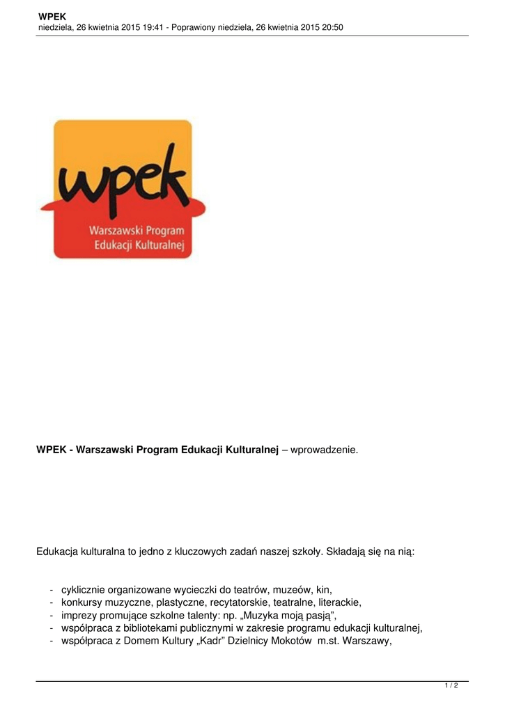 WPEK niedziela, 26 kwietnia 2015 19:41 - Poprawiony niedziela, 26 kwietnia 2015 20:50 WPEK - Warszawski Program Edukacji Kulturalnej – wprowadzenie. Edukacja kulturalna to jedno z kluczowych zadań naszej szkoły. Składają się na nią: - cyklicznie organizowane wycieczki do teatrów, muzeów, kin, konkursy muzyczne, plastyczne, recytatorskie, teatralne, literackie, imprezy promujące szkolne talenty: np. „Muzyka moją pasją”, współpraca z bibliotekami publicznymi w zakresie programu edukacji kulturalnej, współpraca z Domem Kultury „Kadr” Dzielnicy Mokotów m.st. Warszawy, 1/2 WPEK niedziela, 26 kwietnia 2015 19:41 - Poprawiony niedziela, 26 kwietnia 2015 20:50 - udział w festiwalach, koncertach i imprezach o charakterze edukacyjnym, - udział w piknikach integracyjnych i wycieczkach edukacyjnych. Spodziewane efekty: - Zwiększona aktywność artystyczna i społeczna uczniów naszej szkoły. - Rozwój zainteresowań i uzdolnień uczniów. - Systemowa współpraca szkoły z organizacjami i instytucjami kultury w dziedzinie edukacji kulturalnej dzieci i młodzieży. - Zróżnicowanie ofert w obszarze edukacji kulturalnej. - System gromadzenia i upowszechniania informacji o programach edukacji kulturalnej. - Skuteczniejsza współpraca szkoły z podmiotami środowiska lokalnego typu domy kultury, biblioteki publiczne, kina, teatry itp. Szkolny koordynator edukacji kulturalnej (KEKS) Ewelina Adamczyk 2/2