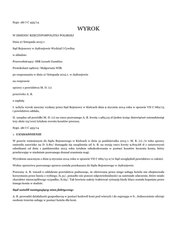 Sygn. akt I C 455/14 WYROK W IMIENIU RZECZYPOSPOLITEJ POLSKIEJ Dnia 27 listopada 2015 r. Sąd Rejonowy w Jędrzejowie Wydział I Cywilny w składzie: Przewodniczący: SSR Leszek Gumbisz Protokolant sądowy: Małgorzata Wilk po rozpoznaniu w dniu 27 listopada 2015 r. w Jędrzejowie na rozprawie sprawy z powództwa M. D. (1) przeciwko A. B. o zapłatę I. uchyla wyrok zaoczny wydany przez Sąd Rejonowy w Kielcach dnia 9 stycznia 2014 roku w sprawie VII C 682/13 i powództwo oddala, II. zasądza od powódki M. D. (1) na rzecz pozwanego A. B. kwotę 1.983,03 zł (jeden tysiąc dziewięćset osiemdziesiąt trzy złote 03/100) tytułem zwrotu kosztów procesu. Sygn. akt I C 455/14 1. UZASADNIENIE W pozwie wniesionym do Sądu Rejonowego w Kielcach w dniu 31 października 2013 r. M. K. (1) /w toku sprawy zmieniła nazwisko na D. k.80/ domagała się zasądzenia od A. B. na swoją rzecz kwoty 9.819,68 zł z ustawowymi odsetkami od dnia 1 października 2013 roku tytułem odszkodowania w postaci kosztów leczenia konia, który przebywając w stadninie pozwanego doznał zranienia nogi. Wyrokiem zaocznym z dnia 9 stycznia 2014 roku w sprawie VII C 682/13 w/w Sąd uwzględnił powództwo w całości. Wobec sprzeciwu pozwanego sprawa została przekazana do Sądu Rejonowego w Jędrzejowie. Pozwany A. B. wnosił o oddalenie powództwa podnosząc, że oferowana przez niego usługa hotelu nie obejmowała korzystania przez konia z wybiegu /k.31/, ponadto nie ponosi odpowiedzialności za zaistniałe zdarzenie, które miało charakter nieszczęśliwego wypadku /k.65/. Tak bowiem należy traktować sytuację kiedy klacz została kopnięta przez innego konia w stadzie. Sąd ustalił następujący stan faktyczny: A. B. prowadzi działalność gospodarczą w postaci hodowli koni pod wierzch i do zaprzęgu w S.. Jednocześnie oferuje osobom trzecim usługę w postaci hotelu dla koni. Jesienią 2008 roku powódka umieściła tam klacz M B.. W zamian za opłatę w wysokości 500 zł miesięcznie zapewniono zwierzęciu miejsce w boksie, karmienie, pojenie, czyszczenie i wybieg na padoku. Zawarta wtedy umowa ustna nie obejmowała leczenia konia ani usług kowalskich. W dniu 20 lutego 2010 roku klacz ta urodziła źrebię płci żeńskiej M B.. Pierwotnie przebywała w jednym boksie razem z matką. Następnie po upływie pół roku trafiła do pomieszczenia z innym źrebakiem za co powódka musiała płacić 400 zł miesięcznie. Po kilku kolejnych miesiącach otrzymała własny boks, zaś stawka za jej utrzymanie wzrosła do 500 zł miesięcznie. Rankiem w dniu 10 lipca 2012 roku M B. razem z grupą około 15 koni została wypuszczona na wybieg który dochodził do rzeki N.. Od tej strony nie był ogrodzony aby zwierzęta w upalne dni miały stały dostęp do wody. Po południu na padoku pojawił się M. M. (1) pracownik pozwanego aby zabrać konie. Wtedy zauważył, że klacz powódki kuleje. Podobnie widział to M. K. (2), który wprowadzał zwierzęta do stajni. Tego dnia żadne zwierzę nie uciekło z wybiegu. Nikt też nie zaobserwował w jakich okolicznościach doszło do uszkodzenia nogi klaczy. Natychmiast wezwano lekarza weterynarii Z. C. (1), który stwierdził ranę szarpaną wewnętrznej części uda. Oczyścił ją, zszył i podał leki. Co prawda skaleczenie goiło się prawidłowo, ale kulawizna nie ustąpiła. Sama powódka stwierdziła, że wobec wyraźnego zaniku mięśni i braku poprawy należy wykonać zdjęcie RTG. Identyczną sugestię wyraziła córka pozwanego S. G. (1) także lekarz weterynarii obecna krytycznego dnia w stadninie. Ostatecznie dopiero 12 sierpnia 2012 roku Z. C. (1) wykonał takie zdjęcie, ale nie stwierdził żadnego złamania czy pęknięcia kości. Co najwyżej zapalenie stawu kolanowego. Zalecił także ruch w karuzeli, a ponieważ takowej w S. nie było to w dniu 27 września 2012 roku klacz trafiła do stadniny w M.. W takiej sytuacji M B. w dniu 26 listopada 2012 roku została przewieziona do S. pod W. do lekarza M. R.. Koszt transportu wyniósł 1.111,92 zł. Lekarka ta zdiagnozowała wieloodłamowe złamanie kłykcia i części nadkłykcia bocznego kości udowej prawej. Nikt na miejscu nie chciał się jednak podjąć niezbędnej operacji. Dlatego też klacz przewieziono do G. do lekarza P. G.. Potwierdził on tę diagnozę co kosztowało 540 zł. Następnie w styczniu 2013 roku przeprowadził dwie operacje co kosztowało 6.768,36 zł. Transport powrotny konia do M. kosztował 1.082,40 zł. Jednocześnie powódka dochodziła zwrotu kosztów własnej podróży na trasie K.-G.-K. w kwocie 317 zł. /Dowód: faktury VAT k.9 i 12; częściowo zeznania powódki k.91 i częściowo pozwanego k.92; zeznania świadków A. J. k.81, U. R. k.81, M. M. k.89, S. G. k.89, Z. C. k.89, M. K. k.101 /. Leczenie przedmiotowej klaczy prowadzone przez Z. C. (1) od początku nie było prawidłowe. W ogóle bowiem nie zdiagnozował on złamania kości, a więc przyczyny wszelkich dolegliwości M B.. Samo zdjęcie RTG wykonano zbyt późno, nawet wtedy jednak nie zostało ono dobrze odczytane. Ponadto w S. przy pomocy badania manualnego stwierdzono już deformację stawu kolanowego oraz niemożliwość zginania nogi. Takich procedur Z. C. (1) nie przeprowadził. Zalecony przez niego ruch w karuzeli mógł jedynie pogorszyć sytuację. Szybie postawienie prawidłowej diagnozy pozwoliłoby przeprowadzić niezbędną operację nawet na miejscu w S., której koszt wynosiłby około 500-600 zł. Zbędny byłby również transport konia pod W.. /Dowód: opinia biegłego k.117-18, 131, 140 i 144/. Sąd zważył, co następuje: Przechodząc do oceny zgromadzonego materiału dowodowego należy podkreślić, że zeznania zdecydowanej większości przesłuchanych świadków zostały uznane za wiarygodne. W szczególności A. J. (2) i U. R. nie były obecne krytycznego dnia w S.. Przebieg wydarzeń znały jedynie z opowiadań powódki. Potwierdziły również fakt, że zarówno B. jak i B. podczas swojego