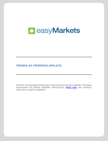PREMIA ZA PIERWSZĄ WPŁATĘ Prawnie obowiązującą wersją tego dokumentu jest wersja angielska. Niniejsze tłumaczenie ma jedynie charakter informacyjny. Kliknij tutaj, aby otworzyć dokument w języku angielskim. 31 December 2013 PREMIA ZA PIERWSZĄ WPŁATĘ Wszyscy inwestorzy, którzy dokonają wpłaty w wysokości co najmniej 400 PLN, będą uprawnieni do otrzymania premii za pierwszą wpłatę. Kwota premii to wartość procentowa uzależniona od kwoty pierwszej wpłaty klienta i obliczana zgodnie z poniższą tabelą. Aby uzyskać premię, klient powinien skontaktować się ze swoim opiekunem klienta (relationship manager), powołując się na „premię za pierwszą wpłatę”. Klienci muszą się zgodzić, że premia będzie traktowana jako pierwszy etap procesu rejestracji. Wartość premii w zależności od pierwszej wpłaty: Wpłata Premia Min. kredyt Maks. kredyt $100 - $199 30% $30 $60 $200 - $1000 50% $100 $500 $1001 - $5000 40% $400 $2000 * Bonus zostanie zamieniony na Walutę bazową Twojego konta według aktualnego kursu rynkowego. W tej promocji mogą wziąć udział wszyscy nowi klienci powyżej 18 roku życia, którzy nie dokonali dotychczas wpłaty, inwestujący w dowolny instrument finansowy dostępny na platformie handlowej easyMarkets lub MT4. Promocja jest ważna do 31 Marca 2017 roku. Inwestor w dowolnym czasie może wypłacić wszelkie zyski wypracowane w wyniku inwestowania kwotą premii. Jeżeli w ciągu 30 (trzydziestu) dni od daty otrzymania premii inwestor nie dokona żadnych transakcji, easyMarkets odbierze kwotę przyznanej premii. Premie są przeznaczone wyłącznie na cele inwestycyjne. Nie mogą być przekazywane, nie podlegają wypłacie ani zwrotowi. W każdym przypadku wycofania depozytu przed dokonaniem transakcji bonus zostanie odjęty proporcjonalnie do wycofanego depozytu. Przykład: o Jeśli wpłacisz 8000zł o Otrzymasz 3200zł bonusu o Jeśli przed dokonaniem transakcji wypłacisz 50% depozytu, 4000zł o 50% bonusu - 1600zł zostanie odjęte. Wszelkie wypłaty po dokonaniu transakcji spowoduje odjecie bonusu w całości. Więcej informacji na temat kredytu transakcyjnego (premii) można znaleźć w witrynie internetowej www.easymarkets.com/pl/legal. Każdy klient może uczestniczyć w danej promocji wyłącznie za pośrednictwem jednego ze swoich kont handlowych. Należące do tego samego klienta konta wielokrotne zostaną zdyskwalifikowane. Zastrzegamy sobie prawo do zdyskwalifikowania uczestnika i odebrania mu premii w pełnej wysokości, jeśli zaistnieją uzasadnione podejrzenia nadużycia lub manipulowania ofertą w jakikolwiek ©Blue Capital Markets Limited 2015. All rights reserved. sposób, w tym korzystanie z adresu IP, który nie jest zgodny z dokumentami identyfikacyjnymi tego klienta. Ta promocja może być łączona z innymi promocjami easyMarkets dostępnymi w tym samym czasie. Za opłacenie jakichkolwiek podatków i obciążeń wynikających z udziału w niniejszej promocji odpowiada wyłącznie inwestor. Konto handlowe podlega postanowieniom standardowej umowy z użytkownikiem dostępnej w witrynie internetowej www.easymarkets.com/pl/legal. Z tej promocji nie mogą korzystać pracownicy easyMarkets, najbliżsi członkowie ich rodzin, brokerzy wprowadzający za pośrednictwem swoich kont osobistych, menedżerowie zarządzający kontami MAM ani podmioty trzecie powiązane z daną promocją. Zastrzegamy sobie prawo, aby w dowolnej chwili odmówić założenia lub zamknąć konto handlowe. easyMarkets może w dowolnej chwili wycofać lub wprowadzić zmiany do niniejszej promocji. Ostrzeżenie o ryzyku: Kontrakty FRA (Forward Rate Agreements), Opcje oraz CFD (transakcje OTC) to produkty lewarowane, niosące ze sobą znaczne ryzyko straty maksymalnie do kwoty zainwestowanego kapitału. Mogą nie być odpowiednie dla każdego. Upewnij się, że dobrze rozumiesz ryzyka związane z tą działalnością i nie inwestujesz pieniędzy, na których utratę Cię nie stać. Powyższe informacje nie mogą pod żadnym warunkiem być uznane za rekomendację do zawarcia jakiejkolwiek transakcji. Nasza grupa firm poprzez swoje spółki zależne posiada licencję Cypryjskiej Komisji Papierów Wartościowych i Giełd (Easy Forex Trading Ltd-CySEC – numer licencji 079/07), (która na mocy dyrektywy MiFID jest ważna w całej Unii Europejskiej) oraz ASIC w Australii (Easy Markets Pty Ltd -licencja AFS nr 246566). ©Blue Capital Markets Limited 2015. All rights reserved.