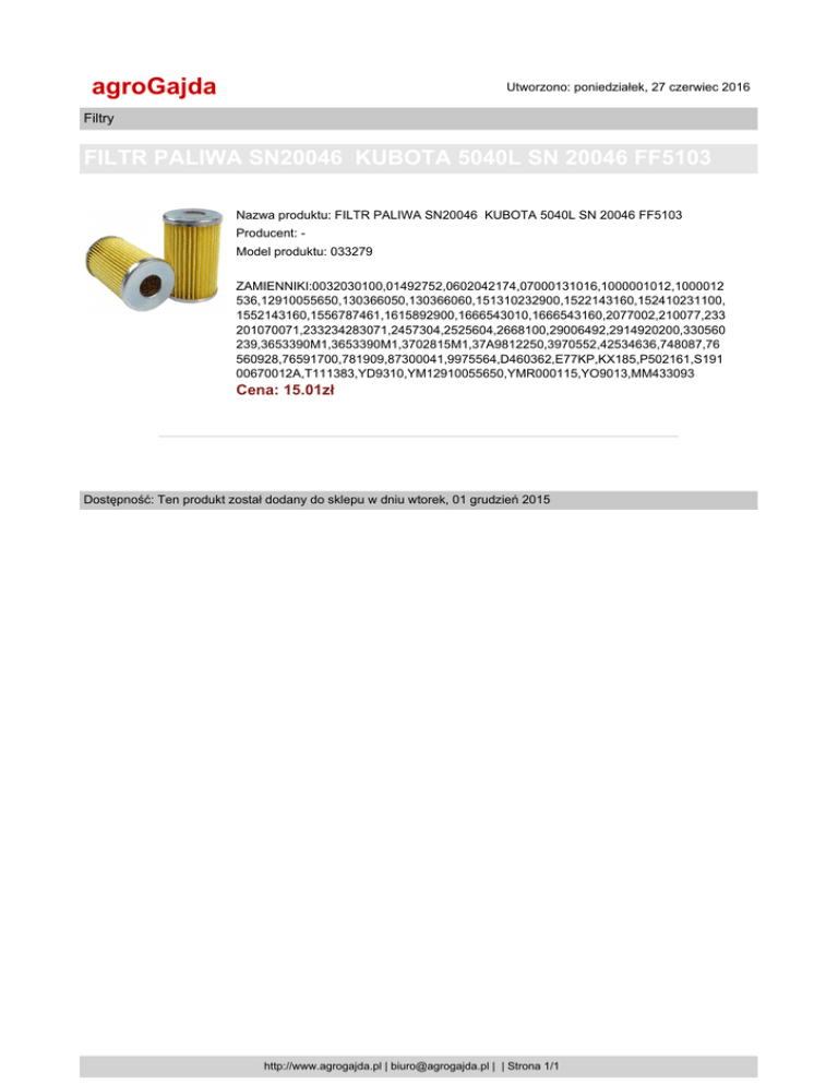 agroGajda Utworzono: poniedziałek, 27 czerwiec 2016 Filtry FILTR PALIWA SN20046 KUBOTA 5040L SN 20046 FF5103 Nazwa produktu: FILTR PALIWA SN20046 KUBOTA 5040L SN 20046 FF5103 Producent: Model produktu: 033279 ZAMIENNIKI:0032030100,01492752,0602042174,07000131016,1000001012,1000012 536,12910055650,130366050,130366060,151310232900,1522143160,152410231100, 1552143160,1556787461,1615892900,1666543010,1666543160,2077002,210077,233 201070071,233234283071,2457304,2525604,2668100,29006492,2914920200,330560 239,3653390M1,3653390M1,3702815M1,37A9812250,3970552,42534636,748087,76 560928,76591700,781909,87300041,9975564,D460362,E77KP,KX185,P502161,S191 00670012A,T111383,YD9310,YM12910055650,YMR000115,YO9013,MM433093 Cena: 15.01zł Dostępność: Ten produkt został dodany do sklepu w dniu wtorek, 01 grudzień 2015 http://www.agrogajda.pl | [email protected] | | Strona 1/1