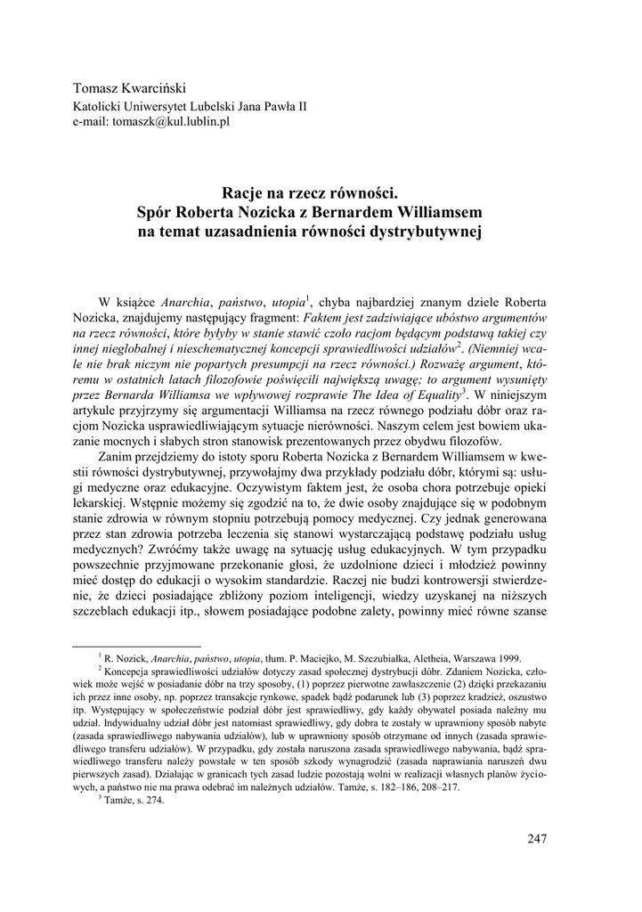Tomasz Kwarciński Katolicki Uniwersytet Lubelski Jana Pawła II e-mail: [email protected] Racje na rzecz równości. Spór Roberta Nozicka z Bernardem Williamsem na temat uzasadnienia równości dystrybutywnej W książce Anarchia, państwo, utopia1, chyba najbardziej znanym dziele Roberta Nozicka, znajdujemy następujący fragment: Faktem jest zadziwiające ubóstwo argumentów na rzecz równości, które byłyby w stanie stawić czoło racjom będącym podstawą takiej czy innej nieglobalnej i nieschematycznej koncepcji sprawiedliwości udziałów 2. (Niemniej wcale nie brak niczym nie popartych presumpcji na rzecz równości.) Rozważę argument, któremu w ostatnich latach filozofowie poświęcili największą uwagę; to argument wysunięty przez Bernarda Williamsa we wpływowej rozprawie The Idea of Equality 3. W niniejszym artykule przyjrzymy się argumentacji Williamsa na rzecz równego podziału dóbr oraz racjom Nozicka usprawiedliwiającym sytuacje nierówności. Naszym celem jest bowiem ukazanie mocnych i słabych stron stanowisk prezentowanych przez obydwu filozofów. Zanim przejdziemy do istoty sporu Roberta Nozicka z Bernardem Williamsem w kwestii równości dystrybutywnej, przywołajmy dwa przykłady podziału dóbr, którymi są: usługi medyczne oraz edukacyjne. Oczywistym faktem jest, że osoba chora potrzebuje opieki lekarskiej. Wstępnie możemy się zgodzić na to, że dwie osoby znajdujące się w podobnym stanie zdrowia w równym stopniu potrzebują pomocy medycznej. Czy jednak generowana przez stan zdrowia potrzeba leczenia się stanowi wystarczającą podstawę podziału usług medycznych? Zwróćmy także uwagę na sytuację usług edukacyjnych. W tym przypadku powszechnie przyjmowane przekonanie głosi, że uzdolnione dzieci i młodzież powinny mieć dostęp do edukacji o wysokim standardzie. Raczej nie budzi kontrowersji stwierdzenie, że dzieci posiadające zbliżony poziom inteligencji, wiedzy uzyskanej na niższych szczeblach edukacji itp., słowem posiadające podobne zalety, powinny mieć równe szanse R. Nozick, Anarchia, państwo, utopia, tłum. P. Maciejko, M. Szczubiałka, Aletheia, Warszawa 1999. Koncepcja sprawiedliwości udziałów dotyczy zasad społecznej dystrybucji dóbr. Zdaniem Nozicka, człowiek może wejść w posiadanie dóbr na trzy sposoby, (1) poprzez pierwotne zawłaszczenie (2) dzięki przekazaniu ich przez inne osoby, np. poprzez transakcje rynkowe, spadek bądź podarunek lub (3) poprzez kradzież, oszustwo itp. Występujący w społeczeństwie podział dóbr jest sprawiedliwy, gdy każdy obywatel posiada należny mu udział. Indywidualny udział dóbr jest natomiast sprawiedliwy, gdy dobra te zostały w uprawniony sposób nabyte (zasada sprawiedliwego nabywania udziałów), lub w uprawniony sposób otrzymane od innych (zasada sprawiedliwego transferu udziałów). W przypadku, gdy została naruszona zasada sprawiedliwego nabywania, bądź sprawiedliwego transferu należy powstałe w ten sposób szkody wynagrodzić (zasada naprawiania naruszeń dwu pierwszych zasad). Działając w granicach tych zasad ludzie pozostają wolni w realizacji własnych planów życiowych, a państwo nie ma prawa odebrać im należnych udziałów. Tamże, s. 182–186, 208–217. 3 Tamże, s. 274. 1 2 247 korzystania z wysokiej jakości usług edukacyjnych. Czy jednak zalety uczniów stanowią wystarczającą podstawę dostępu do edukacji szkolnej? Pytanie, czy potrzeby pacjentów w przypadku usług medycznych oraz zalety uczniów w przypadku edukacji szkolnej, stanowią wystarczającą podstawę podziału odpowiednio usług medycznych i edukacyjnych, jest w gruncie rzeczy pytaniem o racje dystrybucji tego rodzaju dóbr. Podając odpowiednie racje możemy uzasadnić bądź równy podział dóbr, bądź dystrybucję odbiegającą od wzorca równości. W pierwszym przypadku wskazujemy na to, że dane osoby posiadają zbliżone potrzeby lub dysponują podobnymi zaletami. W drugim przypadku podkreślamy zróżnicowanie ludzi pod względem potrzeb lub zalet, które są ich udziałem. 1. Założenie o równości Zdaniem Williamsa, w każdej sytuacji nierównego traktowania ludzi musi zostać podana odpowiednio ogólna racja lub zasada usprawiedliwiająca tego typu nierówności 4. Tak sformułowaną tezę można określić mianem „założenia o równości” 5. Williams zakłada bowiem, że prima facie należy się ludziom równe traktowanie. Samo założenie o równości ma wszakże wyłącznie formalny charakter. Nic bowiem nie mówi ani o rodzajach dóbr, które powinny być z założenia dzielone równo, ani o podmiotach, którym te dobra mają przypaść w udziale. Założenie o równości nie mówi również jakiego typu racje mogą stanowić odpowiednie uzasadnienie odstępstwa od równego podziału tych dóbr6. Williams nie poprzestaje jednak na czysto formalnym założeniu o równości, aplikując je do wymienionych na początku przypadków dystrybucji usług medycznych i edukacyjnych. Twierdzi on mianowicie, że równy zakres usług medycznych należy się ludziom posiadającym podobne potrzeby w zakresie ochrony zdrowia (znajdującym się w podobnym stanie zdrowia), a równe szanse dostępu do usług edukacyjnych należą się podobnie uzdolnionej młodzieży (posiadającej podobne zalety). Wszelkie zaś odstępstwa od tak rozumianego równego traktowania ludzi muszą być odpowiednio, czyli bezstronnie (za pomocą ogólnych racji) uzasadnione. Problem dotyczący akceptacji przedstawionego podejścia do dystrybucji usług medycznych i edukacyjnych sprowadza się zasadniczo do pytania, czy ludzkie potrzeby oraz zalety stanowią odpowiednie racje uzasadniające zarówno ustanowienie sytuacji równości, jak i przypadki odstępstwa od takiej sytuacji. Pytanie to stawia Robert Nozick, polemizując z przyjmowanym przez Williamsa założeniem o równości. Spór pomiędzy Nozickiem i Williamsem dotyczy zatem tego, jakie racje stanowią odpowiednie uzas