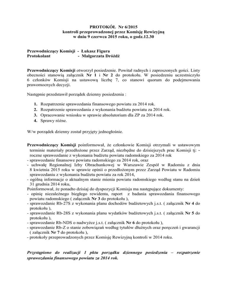 PROTOKÓŁ Nr 6/2015 kontroli przeprowadzonej przez Komisję Rewizyjną w dniu 9 czerwca 2015 roku, o godz.12.30 Przewodniczący Komisji - Łukasz Figura Protokolant - Małgorzata Dróżdż Przewodniczący Komisji otworzył posiedzenie. Powitał radnych i zaproszonych gości. Listy obecności stanowią załącznik Nr 1 i Nr 2 do protokołu. W posiedzeniu uczestniczyło 6 członków Komisji na ustawową liczbę 7, co stanowi quorum do podejmowania prawomocnych decyzji. Następnie przedstawił porządek dzienny posiedzenia : 1. 2. 3. 4. Rozpatrzenie sprawozdania finansowego powiatu za 2014 rok. Rozpatrzenie sprawozdania z wykonania budżetu powiatu za 2014 rok. Opracowanie wniosku w sprawie absolutorium dla ZP za 2014 rok. Sprawy różne. W/w porządek dzienny został przyjęty jednogłośnie. Przewodniczący Komisji poinformował, że członkowie Komisji otrzymali w ustawowym terminie materiały przedłożone przez Zarząd, niezbędne do dzisiejszych prac Komisji tj: roczne sprawozdanie z wykonania budżetu powiatu radomskiego za 2014 rok - sprawozdanie finansowe powiatu radomskiego za 2014 rok, oraz - uchwałę Regionalnej Izby Obrachunkowej w Warszawie Zespół w Radomiu z dnia 8 kwietnia 2015 roku w sprawie opinii o przedłożonym przez Zarząd Powiatu w Radomiu sprawozdaniu z wykonania budżetu powiatu za rok 2014, - ogólną informacje o aktualnym stanie mienia powiatu radomskiego według stanu na dzień 31 grudnia 2014 roku, Poinformował, że ponadto dzisiaj do dyspozycji Komisja ma następujące dokumenty: - opinię niezależnego biegłego rewidenta, raport z badania sprawozdania finansowego powiatu radomskiego ( załącznik Nr 3 do protokołu ), - sprawozdanie Rb-27S z wykonania planu dochodów budżetowych j.s.t. ( załącznik Nr 4 do protokołu ), - sprawozdanie Rb-28S z wykonania planu wydatków budżetowych j.s.t. ( załącznik Nr 5 do protokołu ), - sprawozdanie Rb-NDS o nadwyżce j.s.t. ( załącznik Nr 6 do protokołu ), - sprawozdanie Rb-Z o stanie zobowiązań według tytułów dłużnych oraz poręczeń i gwarancji ( załącznik Nr 7 do protokołu ), - protokoły przeprowadzonych przez Komisję Rewizyjną kontroli w 2014 roku. Przystąpiono do realizacji 1 pktu porządku dziennego posiedzenia – rozpatrzenie sprawozdania finansowego powiatu za 2014 rok. Skarbnik Powiatu Joanna Wontorska poinformowała, że sprawozdanie finansowe składa się z : -bilansu z wykonania budżetu powiatu radomskiego wraz z załącznikami, łącznego bilansu obejmującego dane wynikające z bilansów samorządowych jednostek budżetowych zawierający informacje w ustalonym zakresie, -łącznego rachunku zysków i strat obejmujący dane wynikające z rachunków zysków i strat samorządowych jednostek budżetowych zawierający informacje w ustalonym zakresie, -łącznego zestawienia zmian w funduszu obejmujące dane wynikające z zestawień zmian w funduszu samorządowych jednostek budżetowych zawierające informacje w ustalonym zakresie. Poinformowała, że w/w sprawozdanie było przedmiotem badania biegłego rewidenta. Są one załączone do materiału które badał i w sprawie których wydał opinie rewident. Bilans z wykonania budżetu powiatu pokazuje sytuację samego powiatu czyli stronę aktywną i pasywną, pokazuje zobowiązania finansowe, nadwyżkę, deficyt za dany rok, stan zobowiązań na koniec roku 2014. Jest to kwota 14.500.877,11 zł, z tego 14.500.000 zł to są zobowiązania wynikające z zaciągniętych kredytów, a 877,11 zł są to odsetki. Rok został zamknięty deficytem w wysokości 2.589.765,50 zł. Wszystko to jest umieszczone w bilansie z wykonania budżetu. Opinia biegłego odnośnie tego sprawozdania jest pozytywna, nie zostały wniesione żadne uwagi. Natomiast w bilansie obejmującym łączne bilanse podległych jednostek wykazany jest stan aktywów i pasywów na koniec bieżącego roku i poprzedniego roku budżetowego. Bilans prezentuje sytuację majątkową i finansową podległych jednostek. Suma bilansowa na koniec roku zamknęła się kwotą 283.182.416,38 zł. Poinformowała, że rachunek zysków i strat przedstawia grupy przychodów i kosztów jakie występują w działalności operacyjnej jednostek budżetowych. Zysk na koniec roku 2014 to kwota 20.924.680 zł. Jest to zysk wypracowany przez podległe jednostki. Jest to zbilansowany zysk jednostkowych sprawozdań. Kolejne sprawozdanie wchodzące w skład sprawozdania finansowego to zestawienie zmian w funduszu. Przedstawia ono jakie były ruchy w trakcie roku w funduszach poszczególnych jednostek. Wskazuje również kwoty na jakie były zrealizowane dochody, jakie były zrealizowane wydatki i jakie były przekazane dotacje. Tak jak przewiduje formularz jest to w każdej pozycji wykazane. Tak samo rachunek zysków i strat jest powiązany z bilansem odpowiednimi pozycjami jakie są wykazane w formularzu. Łączna suma zestawienia zmian w funduszu zamknęła się kwotą 254.545.629,16 zł. Poinformowała, że ze sprawozdaniem finansowym ściśle związana jest opinia biegłego rewidenta, oraz raport który zawiera zestawienia tabelaryczne. W opinii biegłego sprawozdanie finansowe przedstawia rzetelnie i jasno wszystkie informacje istotne dla oceny sytuacji majątkowej i finansowej badanej jednostki na dzień 31.12.2014r. jak też jej wyniku finansowego za rok obrotowy 2014. Sprawozdanie zostało sporządzone we wszystkich istotnych aspektach, zgodnie z określonymi w ustawie o rachunkowości zasadami oraz na podstawie prawidłowo prowadzonych ksiąg rachunkowych. Jest zgodne z wpływającymi na treść sprawozdania finansowego przepisami prawa i postanowieniami statutu powiatu radomskiego. Radna Teresa Majkusiak stwierdziła, że pozytywna opinia biegłego rewidenta, pozytywna opinia RIO stanowią podstawy do pozytywnej opinii Komisji. Skarbnik Powiatu Joanna Wontorska poinformowała, że RIO badana sprawozdanie roczne z wykonania budżetu, to opisowe. Natomiast biegły rewident bada sprawozdanie finan