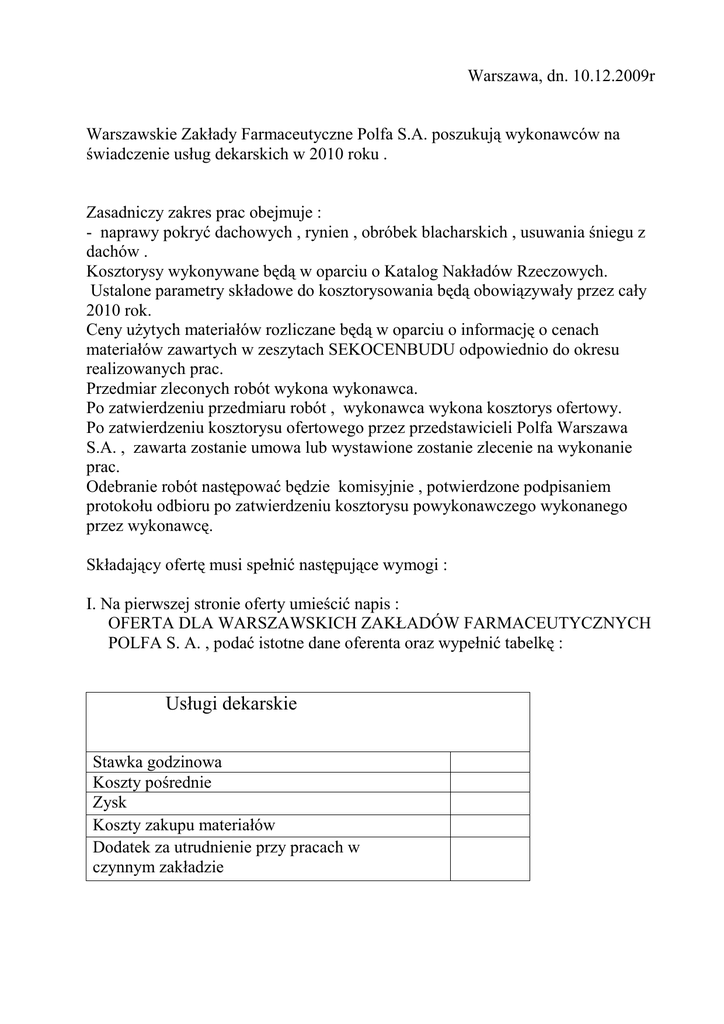 Warszawa, dn. 10.12.2009r Warszawskie Zakłady Farmaceutyczne Polfa S.A. poszukują wykonawców na świadczenie usług dekarskich w 2010 roku . Zasadniczy zakres prac obejmuje : - naprawy pokryć dachowych , rynien , obróbek blacharskich , usuwania śniegu z dachów . Kosztorysy wykonywane będą w oparciu o Katalog Nakładów Rzeczowych. Ustalone parametry składowe do kosztorysowania będą obowiązywały przez cały 2010 rok. Ceny uŜytych materiałów rozliczane będą w oparciu o informację o cenach materiałów zawartych w zeszytach SEKOCENBUDU odpowiednio do okresu realizowanych prac. Przedmiar zleconych robót wykona wykonawca. Po zatwierdzeniu przedmiaru robót , wykonawca wykona kosztorys ofertowy. Po zatwierdzeniu kosztorysu ofertowego przez przedstawicieli Polfa Warszawa S.A. , zawarta zostanie umowa lub wystawione zostanie zlecenie na wykonanie prac. Odebranie robót następować będzie komisyjnie , potwierdzone podpisaniem protokołu odbioru po zatwierdzeniu kosztorysu powykonawczego wykonanego przez wykonawcę. Składający ofertę musi spełnić następujące wymogi : I. Na pierwszej stronie oferty umieścić napis : OFERTA DLA WARSZAWSKICH ZAKŁADÓW FARMACEUTYCZNYCH POLFA S. A. , podać istotne dane oferenta oraz wypełnić tabelkę : Usługi dekarskie Stawka godzinowa Koszty pośrednie Zysk Koszty zakupu materiałów Dodatek za utrudnienie przy pracach w czynnym zakładzie II. Załączyć : - wykaz wykonanych i potwierdzonych robót remontowo- budowlanych w przemyśle farmaceutycznym lub pokrewnym w okresie ostatnich 5 lat wraz z przerobem brutto. - kopię aktualnego odpisu z właściwego rejestru albo zaświadczenie o wpisie do ewidencji działalności gospodarczej wystawionej nie później niŜ 6 m – cy przed terminem składania ofert. - dokumenty potwierdzające zatrudnienie niezbędnej ilości pracowników o wymaganych kwalifikacjach oraz posiadanie odpowiedniej kondycji finansowej - kopię zawarcia Umowy Ubezpieczenia Odpowiedzialności Cywilnej z tytułu prowadzenia działalności gospodarczej na kwotę nie mniejszą niŜ 1 000 000 zł. - kopię zaświadczenia o nie zaleganiu z uiszczeniem podatków. - kopię zaświadczenia o nie zaleganiu z uiszczeniem składek na ubezpieczenie zdrowotne - kopie pism referencyjnych. Zasady składania ofert : - oferty naleŜy złoŜyć w zaklejonej kopercie w Kancelarii – pokój 111 piętro I ; budynek Nr 1 ; ul. Karolkowa 22/24 do dnia 20.01.2010r czynnej do godz. 15 z napisem OFERTA DLA WARSZAWSKICH ZAKŁADÓW FARMACEUTYCZNYCH POLFA S. A. NA WYKONANIE USŁUG DEKARSKICH NA 2010R - ofertę składa : nazwa firmy ……………………………………………….. Szczegółowych informacji udziela p. Antoni Łapacz w godz. 8 - 15 n - ry tel. 022/ 691-39-70 lub 0 510-992-083 Zastrzegamy sobie prawo uniewaŜnienia przetargu bez podania przyczyny. Postępowanie przetargowe nie podlega przepisom ustawy o zamówieniach publicznych.