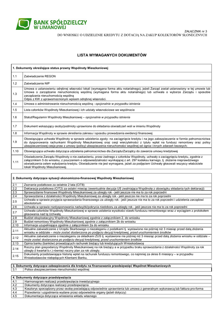 ZAŁĄCZNIK nr 3 DO WNIOSKU O UDZIELENIE KREDYTU Z DOTACJĄ NA ZAKUP KOLEKTORÓW SŁONECZNYCH LISTA WYMAGANYCH DOKUMENTÓW 1. Dokumenty określające status prawny Wspólnoty Mieszkaniowej 1.1 Zaświadczenie REGON 1.2 Zaświadczenie NIP 1.3 Umowa o ustanowieniu odrębnej własności lokali (wymagana forma aktu notarialnego), jeżeli Zarząd został ustanowiony w tej umowie lub Umowa o zarządzanie nieruchomością wspólną (wymagana forma aktu notarialnego) lub uchwała o wyborze Zarządu i sposobie zarządzania nieruchomością wspólną Odpis z KW z uprawomocnionym wpisem odrębnej własności. 1.4 Umowa o administrowanie nieruchomością wspólną - opcjonalnie w przypadku istnienia 1.5 Lista członków Wspólnoty Mieszkaniowej i ich udziały własnościowe we wspólnocie 1.6 Statut/Regulamin Wspólnoty Mieszkaniowej – opcjonalnie w przypadku istnienia 1.7 Dokument wskazujący osoby/podmioty uprawnione do składania oświadczeń woli w imieniu Wspólnoty 1.8 Informacja Wspólnoty w sprawie określenia zakresu i sposobu prowadzenia ewidencji finansowej 1.9 Obowiązująca uchwała Wspólnoty w sprawie udzielenia zgody: na zaciągnięcie kredytu i na jego zabezpieczenie w formie pełnomocnictwa do dysponowania rachunkami Wspólnoty Mieszkaniowej oraz cesji wierzytelności z tytułu wpłat na fundusz remontowy oraz polisy ubezpieczeniowej cesja praw z umowy (polisy) ubezpieczenia nieruchomości wspólnej od ognia i innych zdarzeń losowych; 1.10 Obowiązująca uchwała dotycząca udzielenia pełnomocnictwa dla Zarządu/Zarządcy do zawarcia umowy kredytowej 1.11 Oświadczenie Zarządu Wspólnoty o nie zaskarżeniu, przez żadnego z członków Wspólnoty, uchwały o zaciągnięciu kredytu, zgodnie z załącznikiem 5 do wniosku, z pouczeniem o odpowiedzialności wynikającej z art. 297 kodeksu karnego, tj. złożenie nieprawdziwego oświadczenia celem wyłudzenia kredytu. Oświadczenie nie jest wymagane, jeżeli za podjęciem Uchwały głosowali wszyscy właściciele lokali Wspólnoty Mieszkaniowej. 2. Dokumenty dotyczące sytuacji ekonomiczno-finansowej Wspólnoty Mieszkaniowej 2.1 2.2 2.3 2.4 2.5 2.6 2.7 2.8 2.9 2.10 2.11 2.12 2.13 2.14 2.15 Zeznanie podatkowe za ostatnie 2 lata (CIT8) Deklaracja podatkowa (CIT2) za ostatni miesiąc (ewentualnie decyzja US zwalniająca Wspólnotę z obowiązku składania tych deklaracji) Sprawozdanie finansowe Wspólnoty Mieszkaniowej za ubiegły rok - jeśli jeszcze nie ma to za rok poprzedni Sprawozdanie z działalności Wspólnoty Mieszkaniowej za ubiegły rok - jeśli jeszcze nie ma to za rok poprzedni Uchwała w sprawie przyjęcia sprawozdania finansowego za ubiegły rok - jeśli jeszcze nie ma to za rok poprzedni i udzielenia zarządowi absolutorium Uchwała w sprawie rozdysponowania nadwyżki/pokrycia niedoboru za ubiegły rok - jeśli jeszcze nie ma to za rok poprzedni Uchwała członków Wspólnoty Mieszkaniowej w sprawie ustalenia wysokości stawki funduszu remontowego wraz z wyciągiem z protokołem głosowania nad tą Uchwałą Budżet eksploatacyjny Wspólnoty Mieszkaniowej zgodnie z załącznikiem 2, do wniosku Budżet remontowy Wspólnoty Mieszkaniowej zgodnie z załącznikiem 2b do wniosku Informacje uzupełniające zgodnie z załącznikiem 2a do wniosku Aktualne zaświadczenie z Urzędu Skarbowego o niezaleganiu z podatkami tj. wystawione nie później niż 3 miesiąc przed datą złożenia wniosku w oddziale – może zostać dostarczona po podjęciu decyzji kredytowej, przed uruchomieniem środków Aktualne zaświadczenie o niezaleganiu ze składkami ZUS tj. wystawione nie później niż 3 miesiąc przed datą złożenia wniosku w oddziale – może zostać dostarczona po podjęciu decyzji kredytowej, przed uruchomieniem środków Opinia banku (banków) prowadzących rachunek bieżący lub kredytujących Wnioskodawcę Roczny plan gospodarczy Wspólnoty Mieszkaniowej na rok bieżący a w przypadku braku sprawozdania z działalności Wspólnoty za rok ubiegły (I kwartał b.r.) również roczny plan za rok ubiegły. Dokumenty przedstawiające historię wpłat na rachunek funduszu remontowego, co najmniej za okres 6 miesięcy – w przypadku Wnioskodawców niebędących Klientami Banku, 3. Dokumenty dotyczące zabezpieczenia dla kredytu na finansowanie przedsięwzięć Wspólnot Mieszkaniowych 3.1 Polisa ubezpieczeniowa nieruchomości wspólnej 4. Dokumenty dotyczące przedsięwzięcia 4.1 Harmonogram realizacji przedsięwzięcia inwestycyjnego 4.2 Dokumenty dotyczące realizacji przedsięwzięcia 4.3 Kosztorys sporządzony przez osobę posiadającą odpowiednie uprawnienia lub umowa z generalnym wykonawcą lub faktura pro-forma 4.4 Pozwolenia i uzgodnienia wydane przez odpowiednie organy (jeżeli dotyczy) 4.5 Dokumentacja dotycząca wniesienia wkładu własnego ZAŁĄCZNIK nr 3 DO WNIOSKU O UDZIELENIE KREDYTU Z DOTACJĄ NA ZAKUP KOLEKTORÓW SŁONECZNYCH 5. Formularze Banku Wniosek kredytowy 5.1 Podstawowe informacja o Wspólnocie Mieszkaniowej 5.2 Budżet Wspólnoty Mieszkaniowej 5.3 Informacje uzupełniające 5.4 Budżet remontowy Wspólnoty Mieszkaniowej 5.5 Oświadczenie o aktualności dokumentów będących w posiadaniu Banku 5.6 Oświadczenie o nie zaskarżeniu uchwały WM zaciągnięcie kredytu 5.7 Propozycja uchwały w sprawie zaciągnięcia kredytu 5.8 Wyjaśnienie występowania należności dochodzonych na drodze sądowej – jeżeli dotyczy 5.9 Jeżeli rok ubiegły zamknął się niedoborem, lub niedobór występuje w okresie bieżącym -prosimy o załączenie do wniosku pisemnego 5.10 wyjaśnienia występowania niedoboru oraz Uchwały Wspólnoty o pokryciu niedoboru za rok ubiegły 2
