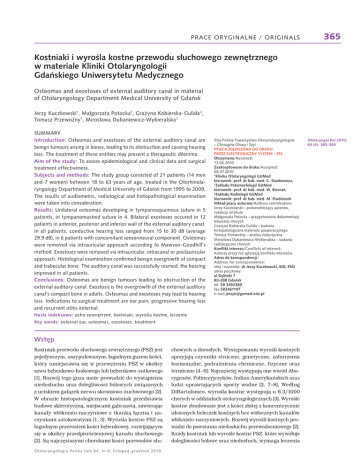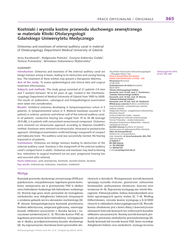 PRACE ORYGINALNE / ORIGINALS 365 .RVWQLDNLLZ\URĂODNRVWQHSU]HZRGXVïXFKRZHJR]HZQÚWU]QHJR ZPDWHULDOH.OLQLNL2WRODU\QJRORJLL *GDñVNLHJR8QLZHUV\WHWX0HG\F]QHJR Osteomas and exostoses of external auditory canal in material RI2WRODU\QJRORJ\'HSDUWPHQW0HGLFDO8QLYHUVLW\RI*GDñVN Jerzy Kuczkowski0DïJRU]DWD3RWRFND*UDĝ\QD.RELHUVND*XOLGD , 7RPDV]3U]HZRěQ\0LURVïDZD'XEDQLHZLF]:\ELHUDOVND 3 6800$5< ,QWURGXFWLRQ Osteomas and exostoses of the external auditory canal are EHQLJQWXPRXUVDULVLQJLQERQHVOHDGLQJWRLWVREVWUXFWLRQDQGFDXVLQJKHDULQJ loss. The treatment of these entities may present a therapeutic dilemma. $LPRIWKHVWXG\ To assess epidemiological and clinical data and surgical treatment effectiveness. 6XEMHFWVDQGPHWKRGV7KHVWXG\JURXSFRQVLVWHGRISDWLHQWVPHQ DQGZRPHQEHWZHHQWR\HDUVRIDJHWUHDWHGLQWKH2WRUKLQROD U\QJRORJ\'HSDUWPHQWRI0HGLFDO8QLYHUVLW\RI*GDñVNIURPWR The results of audiometric, radiological and histopathological examination were taken into consideration. 5HVXOWV8QLODWHUDORVWHRPDVGHYHORSLQJLQW\PSDQRVTXDPRXVVXWXUHLQ SDWLHQWVLQW\PSDQRPDVWRLGVXWXUHLQ%LODWHUDOH[RVWRVHVRFFXUHGLQ patients in anterior, posterior and inferior wall of the external auditory canal. ,QDOOSDWLHQWVFRQGXFWLYHKHDULQJORVVUDQJHGIURPWRG%DYHUDJH G%LQSDWLHQWVZLWKFRQFRPLWDQWVHQVRULQHXUDOFRPSRQHQW2VWHRPDV were removed via intrauricular approach according to Mawson-Goodhill’s method. Exostoses were removed via intrauricular, intracanal or postauricular DSSURDFK+LVWRORJLFDOH[DPLQDWLRQFRQğUPHGEHQLJQRYHUJURZWKRIFRPSDFW DQGWUDEHFXODUERQH7KHDXGLWRU\FDQDOZDVVXFFHVVIXOO\UHDPHGWKHKHDULQJ improved in all patients. &RQFOXVLRQV2VWHRPDVDUHEHQLJQWXPRXUVOHDGLQJWRREVWUXFWLRQRIWKH external auditory canal. Exostosis is the overgrowth of the external auditory FDQDOijVFRPSDFWERQHLQDGXOWV2VWHRPDVDQGH[RVWRVHVPD\OHDGWRKHDULQJ loss. Indications to surgical treatment are ear pain, progressive hearing loss and recurrent otitis external. ŅE\3ROVNLH7RZDU]\VWZR2WRU\QRODU\QJRORJöZ ļ&KLUXUJöZ*ïRZ\L6]\L 35$&$=*26=21$'2'58.8 35=(=(/(.7521,&=1<6<67(0ļ((6 2WU]\PDQR5HFHLYHG =DDNFHSWRZDQRGRGUXNX$FFHSWHG .OLQLND2WRODU\QJRORJLL*80HG NLHURZQLNSURIGUKDEPHG&6WDQNLHZLF] =DNïDGX3DWRPRUIRORJLL*80HG NLHURZQLNSURIGUKDEPHG:%LHUQDW 3 =DNïDGX5DGLRORJLL*80HG NLHURZQLNSURIGUKDEPHG06WXGQLDUHN :NïDGSUDF\DXWRUöZ$XWKRUVFRQWULEXWLRQ -HU]\.XF]NRZVNLļSU]HZRGQLF]ÈF\DXWRUöZ UHGDNFMDDUW\NXïX 0DïJRU]DWD3RWRFNDļSU]\JRWRZDQLHGRNXPHQWDFML lekarskiej chorych *UDĝ\QD.RELHUVND*XOLGDļEDGDQLD KLVWRSDWRORJLF]QHPDWHULDïXSRRSHUDF\MQHJR 7RPDV]3U]HZRěQ\ļDQDOL]DVWDW\VW\F]QD 0LURVïDZD'XEDQLHZLF]:\ELHUDOVNDļEDGDQLD radiologiczne chorych .RQIOLNWLQWHUHVX&RQIOLFWVRILQWHUHVW $XWRU]\SUDF\QLH]JïDV]DMÈNRQIOLNWXLQWHUHVöZ $GUHVGRNRUHVSRQGHQFML/ $GGUHVVIRUFRUUHVSRQGHQFH LPLÚLQD]ZLVNRGU-HU]\.XF]NRZVNL0'3K' adres pocztowy: XO'ÚELQNL *GDñVN tel. fax e-mail MHU]\N#JXPHGHGXSO +DVïDLQGHNVRZHXFKR]HZQÚWU]QHNRVWQLDNLZ\URĂODNRVWQHOHF]HQLH .H\ZRUGV external ear, osteomas, exostoses, treatment :VWÚS Kostniak przewodu słuchowego zewnętrznego (PSZ) jest pojedynczym, uszypułowanym, łagodnym guzem kości, który umiejscawia się w przewężeniu PSZ w okolicy szwu bębenkowo-łuskowego lub bębenkowo-sutkowego [1]. Rozwój tego guza może prowadzić do wystąpienia niedosłuchu oraz dolegliwości bólowych związanych z uciskiem gałązek nerwu skroniowo-żuchwowego [2]. W obrazie histopatologicznym kostniak przedstawia budowę sklerotyczną, miejscami gąbczastą, zawierając kanały włóknisto-naczyniowe z tkanką łączną i naczyniami zatokowatymi [1, 3]. Wyrośla kostne PSZ są łagodnym przerostem kości bębenkowej, rozwijającym się w okolicy przedpierścieniowej kanału słuchowego [2]. Są najczęstszymi chorobami kości przewodów słu2 WROD U \QJRORJLD3ROVNDWRP QU OLV WRSDGJU XG]LHñ chowych u dorosłych. Występowaniu wyrośli kostnych sprzyjają czynniki etniczne, genetyczne, zaburzenia hormonalne, podrażnienia chemiczne, fizyczne oraz termiczne [4–6]. Najczęściej występują one wśród Aborygenów, Polinezyjczyków, Indian Amerykańskich oraz ludzi uprawiających sporty wodne [2, 7–8]. Według DiBartolomeo, wyrośla kostne występują u 6,3/1000 chorych w oddziałach otolaryngologicznych [3]. Wyrośle kostne zbudowane jest z kości zbitej z koncentrycznie ułożonych beleczek kostnych bez widocznych kanałów włóknisto-naczyniowych. Rozwój wyrośli kostnych prowadzi do powstania niedosłuchu przewodzeniowego [2]. Każdy kostniak lub wyrośle kostne PSZ, które wywołuje dolegliwości bólowe oraz niedosłuch, wymaga leczenia 2WRODU\QJRO3RO 64 (6): 365-369 366 PRACE ORYGINALNE / ORIGINALS Tabela I.&KDUDNWHU\VW\NDNOLQLF]QDFKRU\FK]bNRVWQLDNDPLOXEZ\URĂODPLNRVWQ\PLQ 7DEOH,&OLQLFDOFKDUDFWHULVWLFSDWLHQWVZLWKRVWHRPDVRUH[RVWRVHVQ 3DUDPHWU 3ïHÊ :LHNODWD Kostniaki Q :\URĂODNRVWQH Q 5D]HP Q NRELHW\ 4 5 PÚĝF]\ěQL 5 ř ĂUHGQLD ]DNUHVZLHNX 6WURQQRĂÊ]PLDQ\ 2EMDZ\ =DPNQLÚFLHĂZLDWïDSU]HZRGX 7\SQLHGRVïXFKX 8SUDZLDQLHVSRUWöZZRGQ\FK &KRURE\ZVSöïLVWQLHMÈFH 0HWRGDRSHUDF\MQD ļ REXVWURQQH ļ SUDZRVWURQQH 5 - 5 OHZRVWURQQH 4 - 4 EöOXFKD 6 8 ]DW\NDQLHXFKD 9 ĂZLÈGXFKD 5 5 - - - ! 9 SU]HZRG]HQLRZ\ 9 8 PLHV]DQ\ - 4 4 + - 9 5 SHUODNXFKD - NLHV]RQNDUHWUDNF\MQD - ]DSDOHQLH36= 3 3 5 ZHZQÈWU]XV]QD 8 ZHZQÈWU]SU]HZRGRZD 8 3 ]DXV]QD - chirurgicznego. Leczenie chirurgiczne kostniaków lub wyrośli kostnych polega na wycięciu ich osteotomem lub wiertarką uszną z dojścia wewnątrzusznego, wewnątrzprzewodowego lub zausznego [2, 9–10]. Dość rzadkie występowanie tych chorób skłoniło nas do przedstawienia metod diagnostycznych oraz wyników leczenia chirurgicznego tych chorych. Celem pracy jest analiza kliniczna z oceną skuteczności leczenia chirurgicznego chorych z kostniakami oraz wyroślami kostnymi przewodu słuchowego zewnętrznego w Klinice Otolaryngologii GUMed. 0DWHULDïLbPHWRG\ W okresie od 1995 do 2009 w Klinice Otolaryngologii GUMed leczono 9 chorych z jednostronnymi kostniakami oraz 12 chorych z obustronnymi wyroślami kostnymi. W grupie badanych było 14 (66,6%) 