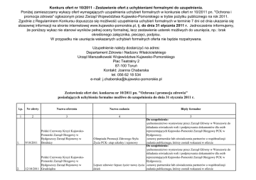 Konkurs ofert nr 10/2011 - Zestawienie ofert z uchybieniami formalnymi do uzupełnienia. PoniŜej zamieszczamy wykazy ofert wymagających uzupełnienia uchybień formalnych w konkursie ofert nr 10/2011 pn. "Ochrona i promocja zdrowia" ogłoszonym przez Zarząd Województwa Kujawsko-Pomorskiego w trybie poŜytku publicznego na rok 2011. Zgodnie z Regulaminem Konkursu dopuszcza się moŜliwość uzupełnienia uchybień formalnych w terminie 7 dni od dnia ukazania się stosownej informacji na stronie internetowej www.kujawsko-pomorskie.pl, tj. do dnia 31 stycznia 2011 r. Jednocześnie informujemy, Ŝe poniŜszy wykaz nie stanowi wyników pełnej oceny formalnej, lecz zestawienie usterek moŜliwych do usunięcia, np.: brak określonego załącznika, pieczęci, podpisu. W przypadku nie usunięcia wskazanych uchybień formalnych oferta nie będzie rozpatrywana. Uzupełnienie naleŜy dostarczyć na adres: Departament Zdrowia i Nadzoru Właścicielskiego Urząd Marszałkowski Województwa Kujawsko-Pomorskiego Plac Teatralny 2 87-100 Toruń Kontakt: Joanna Chaberska tel. 056 62 18 534 e-mail: [email protected] Zestawienie ofert dot. konkursu nr 10/2011 pn. "Ochrona i promocja zdrowia" posiadających uchybienia formalne moŜliwe do uzupełnienia do dnia 31 stycznia 2011 r. l.p. Nr oferty Nazwa oferenta Nazwa zadania 1 2 3 4 Polski Czerwony KrzyŜ KujawskoPomorski Zarząd Okręgowy w Bydgoszczy Zarząd Rejonowy w Brodnicy 1. 9/10/2011 2. Polski Czerwony KrzyŜ KujawskoPomorski Zarząd Okręgowy w Bydgoszczy Zarząd Rejonowy w 12/10/2011 Grudziądzu Błędy formalne 5 Do uzupełnienia: -pełnomocnictwo wystawione przez Zarząd Główny w Warszawie do składania oświadczeń woli i podpisywania dokumentów dla osób reprezentujących Kujawsko-Pomorski Zarząd Okręgowy PCK w Bydgoszczy, Olimpiada Promocji Zdrowego Stylu -umowy partnerskie lub oświadczenia partnerów o współrealizaji śycia PCK- etap szkolny i rejonowy zadania publicznego, którzy zostali wskazani w ofercie Do uzupełnienia: -pełnomocnictwo wystawione przez Zarząd Główny w Warszawie do składania oświadczeń woli i podpisywania dokumentów dla osób reprezentujących Kujawsko-Pomorski Zarząd Okręgowy PCK w Bydgoszczy, Lepsze zdrowie=lepsze Ŝycie=nowy Ŝycia -umowy partnerskie lub oświadczenia partnerów o współrealizaji dzień zadania publicznego, którzy zostali wskazani w ofercie l.p. Nr oferty Nazwa oferenta 1 2 3 3. 29/10/2011 4. 32/10/2011 5. 46/10/2011 6. 47/10/2011 7. 50/10/2011 8. 52/10/2011 9. 60/10/2011 10. 65/10/2011 Nazwa zadania Błędy formalne 4 5 Zdrowe, przyjemne i niezapomniane spędzanie czasu wolnego. Koń najlepszym Stowarzyszenie Miłośników Koni przyjacielem, nauczycielem dzieci i Do uzupełnienia: "DśOKEJ" w Bydgoszczy młodzieŜy -drugi podpis na ofercie -Pani Karoliny Guścior-Prezes Do uzupełnienia: -umowy partnerskie lub oświadczenia partnerów o współrealizaji PCK Zarząd Rejonowy we Włocławku W krainie zdrowia zadania publicznego, którzy zostali wskazani w ofercie Do uzupełnienia: -sprawozdanie merytoryczne za rok 2010 (w przypadku nie sporządzenia Polskie Towarzystwo Zwalczania Chorób W przyjaźni z ASTMĄ - turnus sprawozdania za ubiegły rok w wymaganym terminie moŜliwe jest Alergicznych Oddział w Bydgoszczy rehabilitacyjny JASTARNIA 2011 złoŜenie sprawozdania za rok 2009) Do uzupełnienia: -pełen dokument - Krajowy Rejestr Sądowy poświadczony za zgodność z oryginałem przez osobę uprawnioną, -na upowaŜnieniu - drugi podpis osoby z listy upowaŜnionych uchwałą Zarządu Oddziału (zgodnie z KRS) oraz poświadczenie upowaŜnienia za Działania mające na celu poprawę jakości zgodność z oryginałem przez osobę uprawnioną, Polskie Stowarzyszenie Diabetyków Koło Ŝycia osób chorych i ich -poświadczenie statutu za zgodność z oryginałem przez sobę Miejsko-Powiatowe w Grudziądzu rodzin/opiekunów uprawnioną, Do uzupełnienia: -aktualny wypis z KRS potwierdzający status prawny oferenta oraz nazwiska i funkcje upowaŜnionych do składania oświadczeń woli w jego imieniu Stowarzyszenie Koło Gospodyń (załączono KRS dot. Stowarzyszenia Ochotniczej StraŜy PoŜarnej w Śliwicach) Wiejskich "JAGODZIANKI" w Linówku Bezpieczne wakacje nad wodą i w lesie Do uzupełnienia: Stowarzyszenie na Rzecz Ochrony Profilaktyka prozdrowotna w Świetlicy -umowy partnerskie lub oświadczenia partnerów o współrealizaji Zdrowia w Kowalewie Pomorskim Socjoterapeutycznej zadania publicznego, którzy zostali wskazani w ofercie Do uzupełnienia: -ostatnia strona oferty z podpisami Prezesa lub Wiceprezesa i Skarbnika (zgodnie z KRS) te osoby takŜe powinny być wskazane w ofercie (str. 3) Stowarzyszenie Na Rzecz Wspierania jako osoby upowaŜnione do podpisywania umów o wykonanie zadania Edukacji SPINAKER w Grudziądzu Program Profilaktyczny Aktywny Senior publicznego Do uzupełnienia: -upowaŜnienie Pani Aleksandry Smagały do składania oświadczeń woli Terenowy Komitet Ochrony Praw Krótkoterminowa grupa terapeutyczna dla w imieniu organizacji wystawione przez Zarząd Stowarzyszenia Dziecka w Inowrocławiu kobiet, które wyszły z przemocy (zgodnie z KRS)