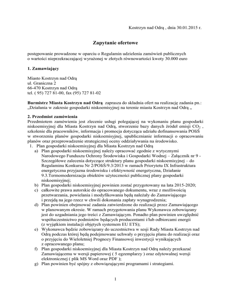 Kostrzyn nad Odrą , dnia 30.01.2015 r. Zapytanie ofertowe postępowanie prowadzone w oparciu o Regulamin udzielenia zamówień publicznych o wartości nieprzekraczającej wyrażonej w złotych równowartości kwoty 30.000 euro 1. Zamawiający Miasto Kostrzyn nad Odrą ul. Graniczna 2 66-470 Kostrzyn nad Odrą tel. ( 95) 727 81-00, fax (95) 727 81-02 Burmistrz Miasta Kostrzyn nad Odrą zaprasza do składnia ofert na realizację zadania pn.: „Działania w zakresie gospodarki niskoemisyjnej na terenie miasta Kostrzyn nad Odrą „ 2. Przedmiot zamówienia Przedmiotem zamówienia jest zlecenie usługi polegającej na wykonaniu planu gospodarki niskoemisyjnej dla Miasta Kostrzyn nad Odrą, stworzenie bazy danych źródeł emisji CO2 , szkolenie dla pracowników, informacja i promocja dotycząca udziału dofinansowania POIiŚ w stworzeniu planów gospodarki niskoemisyjnej, upublicznianie informacji o opracowaniu planów oraz przeprowadzenie strategicznej oceny oddziaływania na środowisko. 1. Plan gospodarki niskoemisyjnej dla Miasta Kostrzyn nad Odrą a) Plan gospodarki niskoemisyjnej należy opracować zgodnie z wytycznymi Narodowego Funduszu Ochrony Środowiska i Gospodarki Wodnej – Załącznik nr 9 Szczegółowe zalecenia dotyczące struktury planu gospodarki niskoemisyjnej – do Regulaminu Konkursu Nr 2/POIiŚ/9.3/2013 w ramach Priorytetu IX Infrastruktura energetyczna przyjazna środowisku i efektywność energetyczna, Działanie 9.3.Termomodernizacja obiektów użyteczności publicznej plany gospodarki niskoemisyjnej; b) Plan gospodarki niskoemisyjnej powinien zostać przygotowany na lata 2015-2020; c) całkowite prawa autorskie do opracowanego dokumentu, wraz z możliwością przetwarzania, powielania i modyfikowania będą należały do Zamawiającego i przejdą na jego rzecz w chwili dokonania zapłaty wynagrodzenia; d) Plan powinien obejmować zadania zatwierdzone do realizacji przez Zamawiającego w planowanym okresie. W ramach przygotowania planu Wykonawca zobowiązany jest do uzgadniania jego treści z Zamawiającym. Ponadto plan powinien uwzględnić współuczestnictwo podmiotów będących producentami i/lub odbiorcami energii (z wyjątkiem instalacji objętych systemem EU ETS); e) Wykonawca będzie zobowiązany do uczestnictwa w sesji Rady Miasta Kostrzyn nad Odrą podczas której będą podejmowane uchwały o przyjęciu planu do realizacji oraz o przyjęciu do Wieloletniej Prognozy Finansowej inwestycji wynikających z opracowanego planu; f) Plan gospodarki niskoemisyjnej dla Miasta Kostrzyn nad Odrą należy przekazać Zamawiającemu w wersji papierowej ( 5 egzemplarzy ) oraz edytowalnej wersji elektronicznej ( plik MS Word oraz PDF ); g) Plan powinien być spójny z obowiązującymi programami i strategiami. 1 2) Stworzenie bazy danych a) Opracowanie bazy danych winno być poprzedzone wykonaniem szczegółowej inwentaryzacji emisji gazów cieplarnianych w sektorach i obiektach znajdujących się na terenie Miasta Kostrzyn nad Odrą oraz wyliczeniem ilości CO2 emitowanego wskutek zużycia energii na terenie Miasta Kostrzyn nad Odrą w roku bazowym 2013. b) Inwentaryzacja dotyczyć będzie pozyskania danych wyjściowych do przygotowania bazy danych oraz opracowania Planu gospodarki niskoemisyjnej tj: - emisji powierzchniowej, liniowej (komunikacyjnej) oraz punktowej, - niskiej emisji zanieczyszczeń powietrza uwzględniającej obiekty komunalne, budynki mieszkalne, oświetlenie uliczne, obiekty usługowe, komunikację; - stanu i funkcjonowania systemu elektroenergetycznego na terenie miasta; - ilości źródeł ciepła opalanych węglem w budynkach mieszkalnych (jedno i wielorodzinnych) oraz podmiotach gospodarczych i obiektach użyteczności publicznej w mieście, - inwentaryzację istniejących źródeł energii odnawialnej na terenie miasta. Źródło danych: statystyki, ogólnodostępne dokumenty i opracowania, faktury dotyczące zużycia energii w obiektach użyteczności publicznej, wykaz firm zarejestrowanych na terenie miasta, ankiety skierowane do właścicieli budynków (wspólnot, mieszkańców, przedsiębiorców), informacje pozyskane z Urzędu Marszałkowskiego, Starostwa Powiatowego, Urzędu Miasta, Spółek Dystrybucyjnych, WIOŚ, GUS. c) Bazę danych należy wykonać na aktywnych arkuszach kalkulacyjnych MS Excel z założeniami, wyliczeniami i ich zestawionymi wynikami oraz w wersji tradycyjnej(papierowej) w formie raportu z inwentaryzacji wraz z bilansem emisji CO2 z obszaru Miasta (w formie tabeli) jak również przedstawionej w formie graficznej – na kolorowej mapie. d) Baza danych zostanie przekazana Zamawiającemu w edytowalnej formie elektronicznej. 3) Szkolenia dla pracowników a) Przeprowadzenie szkolenia pracowników Urzędu Miasta w zakresie obsługi bazy danych , opracowania i wdrażania Planu gospodarki niskoemisyjnej i monitorowania skutków jego realizacji (4 osoby, 2 dni szkolenia po ok. 8 h). Przeszkoleni pracownicy docelowo będą zajmowali się m.in. aktualizacją bazy danych Przygotowaną w ramach Projektu, monitoringiem wdrażania Planu, promocją realizacji Planu wśród mieszkańców Miasta, możliwością pozyskania zewnętrznych środków finansowych na realizację działań zapisanych w Planie. W szczególności szkolenia winny obejmować następujące zagadnienia: a) wprowadzenie do zagadnień ochrony klimatu i gospodarki niskoemisyjnej (podstawy naukowe, regulacje prawne, strategie UE oraz Polskie, praktyczne aspekty gospodarki niskoemisyjnej). b) Plan gospodarki niskoemisyjnej (cel, zakres i struktura), c) zasady opracowania Planów gospodarki niskoemisyjnej (spójność z innymi dokumentami, planowanie działań, zapewnienie udziału interesariuszy), d) inwentaryzacja emisji (zasady opracowania inwentaryzacji, podział na grupy źródeł, źródła danych, metody), e) realizacja działań przewidzianych w Planie gospodarki niskoemisyjnej (struktury odpowiedzialne, koordynacja), f) monitoring realizacji Planów gospodark