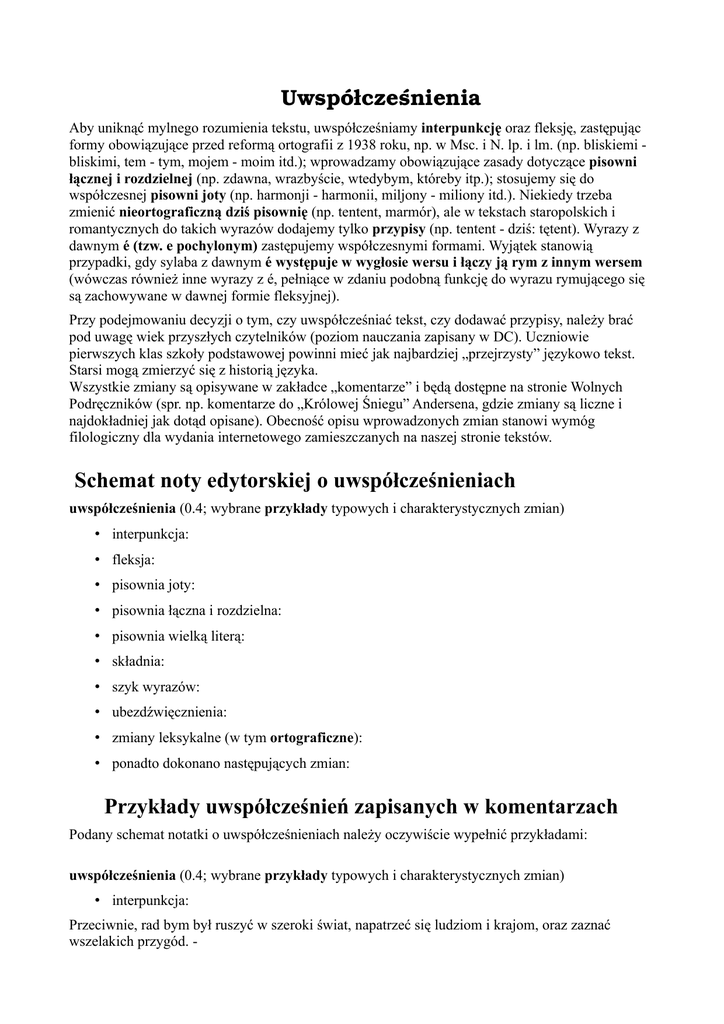 Uwspółcześnienia Aby uniknąć mylnego rozumienia tekstu, uwspółcześniamy interpunkcję oraz fleksję, zastępując formy obowiązujące przed reformą ortografii z 1938 roku, np. w Msc. i N. lp. i lm. (np. bliskiemi bliskimi, tem - tym, mojem - moim itd.); wprowadzamy obowiązujące zasady dotyczące pisowni łącznej i rozdzielnej (np. zdawna, wrazbyście, wtedybym, któreby itp.); stosujemy się do współczesnej pisowni joty (np. harmonji - harmonii, miljony - miliony itd.). Niekiedy trzeba zmienić nieortograficzną dziś pisownię (np. tentent, marmór), ale w tekstach staropolskich i romantycznych do takich wyrazów dodajemy tylko przypisy (np. tentent - dziś: tętent). Wyrazy z dawnym é (tzw. e pochylonym) zastępujemy współczesnymi formami. Wyjątek stanowią przypadki, gdy sylaba z dawnym é występuje w wygłosie wersu i łączy ją rym z innym wersem (wówczas również inne wyrazy z é, pełniące w zdaniu podobną funkcję do wyrazu rymującego się są zachowywane w dawnej formie fleksyjnej). Przy podejmowaniu decyzji o tym, czy uwspółcześniać tekst, czy dodawać przypisy, należy brać pod uwagę wiek przyszłych czytelników (poziom nauczania zapisany w DC). Uczniowie pierwszych klas szkoły podstawowej powinni mieć jak najbardziej „przejrzysty” językowo tekst. Starsi mogą zmierzyć się z historią języka. Wszystkie zmiany są opisywane w zakładce „komentarze” i będą dostępne na stronie Wolnych Podręczników (spr. np. komentarze do „Królowej Śniegu” Andersena, gdzie zmiany są liczne i najdokładniej jak dotąd opisane). Obecność opisu wprowadzonych zmian stanowi wymóg filologiczny dla wydania internetowego zamieszczanych na naszej stronie tekstów. Schemat noty edytorskiej o uwspółcześnieniach uwspółcześnienia (0.4; wybrane przykłady typowych i charakterystycznych zmian) • interpunkcja: • fleksja: • pisownia joty: • pisownia łączna i rozdzielna: • pisownia wielką literą: • składnia: • szyk wyrazów: • ubezdźwięcznienia: • zmiany leksykalne (w tym ortograficzne): • ponadto dokonano następujących zmian: Przykłady uwspółcześnień zapisanych w komentarzach Podany schemat notatki o uwspółcześnieniach należy oczywiście wypełnić przykładami: uwspółcześnienia (0.4; wybrane przykłady typowych i charakterystycznych zmian) • interpunkcja: Przeciwnie, rad bym był ruszyć w szeroki świat, napatrzeć się ludziom i krajom, oraz zaznać wszelakich przygód. - Przeciwnie, rad bym był ruszyć w szeroki świat, napatrzeć się ludziom i krajom oraz zaznać wszelakich przygód. (...) wrażenie nauk ojca pierzchło, i jąłem na nowo snuć marzenia, unoszące mnie daleko za lądy i morza (…) (...) wrażenie nauk ojca pierzchło i jąłem na nowo snuć marzenia unoszące mnie daleko za lądy i morza (...) • fleksja: Zmodernizowano końcówki fleksyjne wyrazów w narzędniku i miejscowniku l. poj. r. ż. i r. n. oraz narzędniku l. mn.: -em, -emi; np. w zaklętem - w zaklętym (o) tem (pięknie) - tym niem - nim niczem - niczym towarzyskiem - towarzyskim poczem - po czym przedewszystkiem - przede wszystkim mię - mnie swoję – swoją patrzała - patrzyła (z dwóch form dopuszczalnych wybrano tę o mniej archaicznym brzmieniu) aniołkowie głaskali - aniołki głaskały (uwspółcześniono formę archaiczną) biegnąć - biec rajskimi uśmiechy - rajskimi uśmiechami • pisownia joty: Uwspółcześniono pisownię przyswojonych wyrazów obcego pochodzenia z jotą: np. lilij - lilii miljony - miliony liberji - liberii komedya - komedia historja - historia waryacye - wariacje • pisownia łączna i rozdzielna: przytym – przy tym przedemną - przede mną z pod - spod z tąd - stąd z nad - znad strzedz - strzec poczem - po czym przedewszystkiem - przede wszystkim Konsekwentnie uwspółcześniono pisownię z -by np. wtedybym - wtedy bym któryby - który by • pisownia wielką literą: (...) przy drzwiach go dopadłszy, Boże drogi! czegośmy mu nie nagadały! jakimiśmy go miłymi, serdecznymi słowy nie osypały! (...) przy drzwiach go dopadłszy, Boże drogi, czegośmy mu nie nagadały! Jakimiśmy go miłymi, serdecznymi słowy nie osypały! • składnia: na kawałku, który wolnym został - na kawałku, który został wolny • szyk wyrazów: na kawałku, który wolnym został - na kawałku, który został wolny wydawało mu się mądrem i doskonałem - wydawało mu się mądre i doskonałe (w związku ze zmianą rządu czasownika) • ubezdźwięcznienia: z pod - spod z tąd - stąd strzedz - strzec nizkim - niskim • zmiany leksykalne (w tym 'ortograficzne): oglądnęła - obejrzała (zamieniono regionalizm małopolski na formę ogólnopolską) kędy - gdzie (zastąpiono słowo archaiczne współczesnym) Eskimka - Eskimoska (zmiana zgodnie ze współczesną formą) niema - nie ma owdzie - ówdzie strzedz - strzec módz - móc wziąść - wziąć nizkim - niskim passya - pasja rądle - rondle • ponadto dokonano następujących zmian: mówić prawdę, choćby przykrą była - mówić prawdę, choćby była przykra Dokonano zmiany w zakresie składni (przykrą - przykra) oraz szyku zdania, ponieważ tekst jest skierowany do dzieci z pierwszych lat szkoły podstawowej i należy zadbać o jego klarowność językową. Decyzję o daleko idącej modyfikacji tekstu przesądziło również to, że w tym przypadku mamy do czynienia z tłumaczeniem, a nie oryginalnym tekstem polskim Przywrócono zgodnie z oryginałem imiona głównych bohaterów - Kaj i Gerda, zamiast: Jaś i Marysia. Przyglądając się przykładowej nocie o uwspółcześnieniach warto zwrócić uwagę na następujące kwestie: - Zazwyczaj nie spotyka się wszystkich typów zmian w jednym tekście - w takim wypadku niektóre kategorie wyszczególnione w schemacie po prostu opuszczamy w opisie (przykłady dla poszczególnych kategorii uwspółcześnień w podanym tu przykładowym opisie zostały zebrane z wielu utworów). -