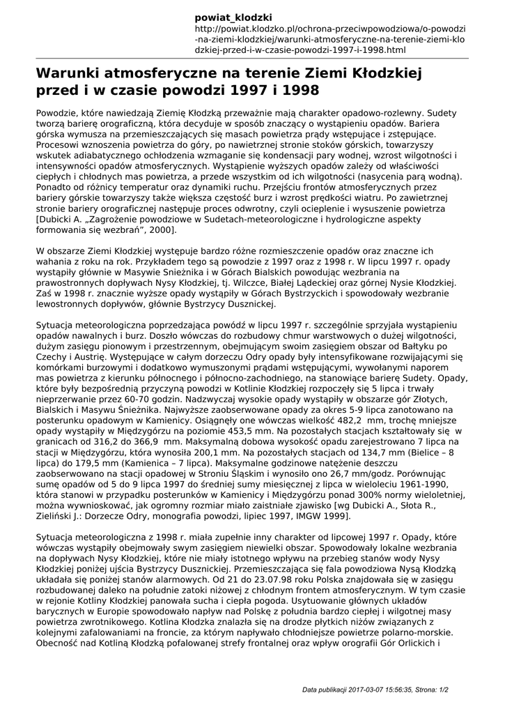 powiat_klodzki http://powiat.klodzko.pl/ochrona-przeciwpowodziowa/o-powodzi -na-ziemi-klodzkiej/warunki-atmosferyczne-na-terenie-ziemi-klo dzkiej-przed-i-w-czasie-powodzi-1997-i-1998.html Warunki atmosferyczne na terenie Ziemi Kłodzkiej przed i w czasie powodzi 1997 i 1998 Powodzie, które nawiedzają Ziemię Kłodzką przeważnie mają charakter opadowo-rozlewny. Sudety tworzą barierę orograficzną, która decyduje w sposób znaczący o wystąpieniu opadów. Bariera górska wymusza na przemieszczających się masach powietrza prądy wstępujące i zstępujące. Procesowi wznoszenia powietrza do góry, po nawietrznej stronie stoków górskich, towarzyszy wskutek adiabatycznego ochłodzenia wzmaganie się kondensacji pary wodnej, wzrost wilgotności i intensywności opadów atmosferycznych. Wystąpienie wyższych opadów zależy od właściwości ciepłych i chłodnych mas powietrza, a przede wszystkim od ich wilgotności (nasycenia parą wodną). Ponadto od różnicy temperatur oraz dynamiki ruchu. Przejściu frontów atmosferycznych przez bariery górskie towarzyszy także większa częstość burz i wzrost prędkości wiatru. Po zawietrznej stronie bariery orograficznej następuje proces odwrotny, czyli ocieplenie i wysuszenie powietrza [Dubicki A. „Zagrożenie powodziowe w Sudetach-meteorologiczne i hydrologiczne aspekty formowania się wezbrań”, 2000]. W obszarze Ziemi Kłodzkiej występuje bardzo różne rozmieszczenie opadów oraz znaczne ich wahania z roku na rok. Przykładem tego są powodzie z 1997 oraz z 1998 r. W lipcu 1997 r. opady wystąpiły głównie w Masywie Snieżnika i w Górach Bialskich powodując wezbrania na prawostronnych dopływach Nysy Kłodzkiej, tj. Wilczce, Białej Lądeckiej oraz górnej Nysie Kłodzkiej. Zaś w 1998 r. znacznie wyższe opady wystąpiły w Górach Bystrzyckich i spowodowały wezbranie lewostronnych dopływów, głównie Bystrzycy Dusznickej. Sytuacja meteorologiczna poprzedzająca powódź w lipcu 1997 r. szczególnie sprzyjała wystąpieniu opadów nawalnych i burz. Doszło wówczas do rozbudowy chmur warstwowych o dużej wilgotności, dużym zasięgu pionowym i przestrzennym, obejmującym swoim zasięgiem obszar od Bałtyku po Czechy i Austrię. Występujące w całym dorzeczu Odry opady były intensyfikowane rozwijającymi się komórkami burzowymi i dodatkowo wymuszonymi prądami wstępującymi, wywołanymi naporem mas powietrza z kierunku północnego i północno-zachodniego, na stanowiące barierę Sudety. Opady, które były bezpośrednią przyczyną powodzi w Kotlinie Kłodzkiej rozpoczęły się 5 lipca i trwały nieprzerwanie przez 60-70 godzin. Nadzwyczaj wysokie opady wystąpiły w obszarze gór Złotych, Bialskich i Masywu Śnieżnika. Najwyższe zaobserwowane opady za okres 5-9 lipca zanotowano na posterunku opadowym w Kamienicy. Osiągnęły one wówczas wielkość 482,2 mm, trochę mniejsze opady wystąpiły w Międzygórzu na poziomie 453,5 mm. Na pozostałych stacjach kształtowały się w granicach od 316,2 do 366,9 mm. Maksymalną dobowa wysokość opadu zarejestrowano 7 lipca na stacji w Międzygórzu, która wynosiła 200,1 mm. Na pozostałych stacjach od 134,7 mm (Bielice – 8 lipca) do 179,5 mm (Kamienica – 7 lipca). Maksymalne godzinowe natężenie deszczu zaobserwowano na stacji opadowej w Stroniu Śląskim i wynosiło ono 26,7 mm/godz. Porównując sumę opadów od 5 do 9 lipca 1997 do średniej sumy miesięcznej z lipca w wieloleciu 1961-1990, która stanowi w przypadku posterunków w Kamienicy i Międzygórzu ponad 300% normy wieloletniej, można wywnioskować, jak ogromny rozmiar miało zaistniałe zjawisko [wg Dubicki A., Słota R., Zieliński J.: Dorzecze Odry, monografia powodzi, lipiec 1997, IMGW 1999]. Sytuacja meteorologiczna z 1998 r. miała zupełnie inny charakter od lipcowej 1997 r. Opady, które wówczas wystąpiły obejmowały swym zasięgiem niewielki obszar. Spowodowały lokalne wezbrania na dopływach Nysy Kłodzkiej, które nie miały istotnego wpływu na przebieg stanów wody Nysy Kłodzkiej poniżej ujścia Bystrzycy Dusznickiej. Przemieszczająca się fala powodziowa Nysą Kłodzką układała się poniżej stanów alarmowych. Od 21 do 23.07.98 roku Polska znajdowała się w zasięgu rozbudowanej daleko na południe zatoki niżowej z chłodnym frontem atmosferycznym. W tym czasie w rejonie Kotliny Kłodzkiej panowała sucha i ciepła pogoda. Usytuowanie głównych układów barycznych w Europie spowodowało napływ nad Polskę z południa bardzo ciepłej i wilgotnej masy powietrza zwrotnikowego. Kotlina Kłodzka znalazła się na drodze płytkich niżów związanych z kolejnymi zafalowaniami na froncie, za którym napływało chłodniejsze powietrze polarno-morskie. Obecność nad Kotliną Kłodzką pofalowanej strefy frontalnej oraz wpływ orografii Gór Orlickich i Data publikacji 2017-03-07 15:56:35, Strona: 1/2 powiat_klodzki http://powiat.klodzko.pl/ochrona-przeciwpowodziowa/o-powodzi -na-ziemi-klodzkiej/warunki-atmosferyczne-na-terenie-ziemi-klo dzkiej-przed-i-w-czasie-powodzi-1997-i-1998.html Bystrzyckich stworzyły dogodne warunki dla silnej aktywności burzowej, której towarzyszyły opady deszczu o charakterze nawalnym. Najwyższe opady wystąpiły w Zieleńcu i Dusznikach. Sumy opadów za lipiec 1998 r. na poszczególnych stacjach przewyższały normy miesięczne lipca o 149 %. Deszcze te były krótkotrwałe i czas ich trwania wynosił od 6 do 12 godzin. Porównując średnie sumy opadów w zlewni Białej Lądeckiej i Bystrzycy Dusznickiej można stwierdzić znaczne zróżnicowanie w ich wysokości. Suma opadów w dniach 5-8 lipca 1997 w zlewni Białej Lądeckiej wyniosła 350 mm, podczas gdy w zlewni Bystrzycy Dusznickiej tylko 80 mm. Odwrotna relacja miała miejsce w dniach 22-23 lipca 1998 r. Wtedy to suma opadów w zlewni Białej Lądeckiej wyniosła 30 mm, natomiast w zlewni Bystrzycy Dusznickiej osiągnęła 145 mm. Do dnia dzisiejszego sytuacja meteorologiczna ja