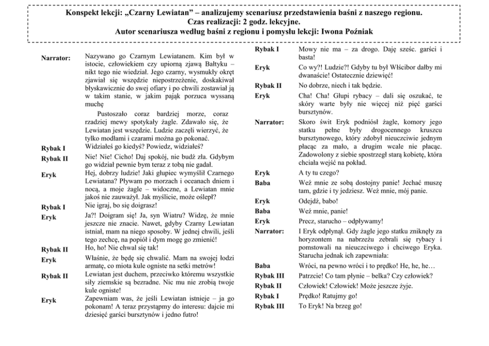 Konspekt lekcji: „Czarny Lewiatan” – analizujemy scenariusz przedstawienia baśni z naszego regionu. Czas realizacji: 2 godz. lekcyjne. Autor scenariusza według baśni z regionu i pomysłu lekcji: Iwona Poźniak Narrator: Rybak I Rybak II Eryk Rybak I Eryk Rybak II Eryk Rybak II Eryk Nazywano go Czarnym Lewiatanem. Kim był w istocie, człowiekiem czy upiorną zjawą Bałtyku – nikt tego nie wiedział. Jego czarny, wysmukły okręt zjawiał się wszędzie niepostrzeżenie, doskakiwał błyskawicznie do swej ofiary i po chwili zostawiał ją w takim stanie, w jakim pająk porzuca wyssaną muchę Pustoszało coraz bardziej morze, coraz rzadziej mewy spotykały żagle. Zdawało się, że Lewiatan jest wszędzie. Ludzie zaczęli wierzyć, że tylko modłami i czarami można go pokonać. Widziałeś go kiedyś? Powiedz, widziałeś? Nie! Nie! Cicho! Daj spokój, nie budź zła. Gdybym go widział pewnie bym teraz z tobą nie gadał. Hej, dobrzy ludzie! Jaki głupiec wymyślił Czarnego Lewiatana? Pływam po morzach i oceanach dniem i nocą, a moje żagle – widoczne, a Lewiatan mnie jakoś nie zauważył. Jak myślicie, może oślepł? Nie igraj, bo się doigrasz! Ja?! Doigram się! Ja, syn Wiatru? Widzę, że mnie jeszcze nie znacie. Nawet, gdyby Czarny Lewiatan istniał, mam na niego sposoby. W jednej chwili, jeśli tego zechcę, na popiół i dym mogę go zmienić! Ho, ho! Nie chwal się tak! Właśnie, że będę się chwalić. Mam na swojej łodzi armatę, co miota kule ogniste na setki metrów! Lewiatan jest duchem, przeciwko któremu wszystkie siły ziemskie są bezradne. Nic mu nie zrobią twoje kule ogniste! Zapewniam was, że jeśli Lewiatan istnieje – ja go pokonam! A teraz przystąpmy do interesu: dajcie mi dziesięć garści bursztynów i jedno futro! Rybak I Eryk Rybak II Eryk Narrator: Eryk Baba Eryk Baba Eryk Narrator: Baba Rybak III Rybak II Rybak I Rybak III Mowy nie ma – za drogo. Daję sześc. garści i basta! Co wy?! Ludzie?! Gdyby tu był Włścibor dałby mi dwanaście! Ostatecznie dziewięć! No dobrze, niech i tak będzie. Cha! Cha! Głupi rybacy – dali się oszukać, te skóry warte były nie więcej niż pięć garści bursztynów. Skoro świt Eryk podniósł żagle, komory jego statku pełne były drogocennego kruszcu bursztynowego, który zdobył nieuczciwie jednym płacąc za mało, a drugim wcale nie płacąc. Zadowolony z siebie spostrzegł starą kobietę, która chciała wejść na pokład. A ty tu czego? Weź mnie ze sobą dostojny panie! Jechać muszę tam, gdzie i ty jedziesz. Weź mnie, mój panie. Odejdź, babo! Weź mnie, panie! Precz, starucho – odpływamy! I Eryk odpłynął. Gdy żagle jego statku zniknęły za horyzontem na nabrzeżu zebrali się rybacy i pomstowali na nieuczciwego i chciwego Eryka. Starucha jednak ich zapewniała: Wróci, na pewno wróci i to prędko! He, he, he… Patrzcie! Co tam płynie – belka? Czy człowiek? Człowiek! Człowiek! Może jeszcze żyje. Prędko! Ratujmy go! To Eryk! Na brzeg go! Eryk Godzisław Rybak I Starucha Godzisław Godzisław Narrator: Lewiatan: Starucha; Lewiatan: Starucha: Czarny Lewiatan! I nie duch... Korsarz! Straszliwy, chciwy korsarz! Skoro Czarny Lewiatan jest korsarzem, zwołajmy radę wojenną. Należy go zniszczyć! Słusznie! Ruszajmy. (wszyscy razem ): Ruszajmy. Weź mnie ze sobą, dostojny. Tam chcę jechać, gdzie ty. Tylko tobołek mam z sobą. Weź mnie a zobaczysz, że się przydam, nie pożałujesz... Na bój płyniemy kobieto. Chcesz, to płyń, ale pamiętaj – zginąć możesz! Ruszyli. Nie upłynęli daleko, tuż przed zachodem słońca jak czarna chmura zwaliła się na nich Czarny Lewiatan i rozgromił statek dzielnych rybaków. Zabierając resztki łupu ze zrabowanego statku Lewiatan zauważył wtuloną w kąt kobiecinę. A ty, co? Dawaj tobołek! Nie zabieraj mi go panie! Mam w nim tylko kilka czarnych sucharów. Dawaj! Nie gadaj i precz mi z oczu, starucho! (Lewiatan zagląda do worka, zaczyna się potwornie dusić, szamocze się i miota, worek oplata mu się wokół szyi – dusi się i pada na ziemię. (śmiejąc się szyderczo): Cha! Cha! Cha! Cha! Zadusił się i skonał. Własna pycha i chciwość go zadusiła. Cha! Cha! Cha! (do publiczności) A wiecie co było w moim tobołku? Były w nim wszystkie żale i krzywdy, jakich dopuścił się Lewiatan! Udławił się własną chciwością i zachłannością! A Cha! Cha! Cha! (znika) Wypełnij test i wykonaj polecenia. 1. Powyższy tekst jest: a) wierszem b) monologiem c) dialogiem d) inny 2. Dialog to: a) wypowiedź jednego bohatera b) rozmowa c) wypowiedź narratora d) wypowiedź głównego bohatera 3. Monolog to: a) wypowiedź jednej postaci b) rozmowa dwóch osób c) rozmowa trzech osób d) wskazówki reżysera 4. Tekst jest podzielony na role aby: a) można go było łatwiej przeczytać b) można go było wystawić na scenie c) łatwiej było wyodrębnić w nim bohaterów d) aby łatwiej można było nauczyć się go na pamięć 5. Tekst poboczny, czyli wskazówki reżysera zapisane w nawiasach to: a) metafory b) narracja c) didaskalia d) dialog 6. Okręt Czarnego Lewiatana był: a) czarny i wysmukły b) czarny i groźny c) wysmukły i przerażający d) nieuchwytny i wysmukły 7. Ludzie wierzyli, że Lewiatana można pokonać: a) modłami i łzami b) czarami i zaklęciami c) modłami i czarami d) zaklęciami i zbrojnie 8. W istnienie Lewiatana wątpił: a) Rybak I b) Rybak II c) Eryk d) Narrator 9. Armaty statku Eryka nie mogły zaszkodzić Lewiatanowi ponieważ: a) Lewiatan miał lepsze działa na swoim statku b) Lewiatan był duchem c) Lewiatan nie zbliżał się do obcych okrętów d) Lewiatan miał mały okręt i trudno było go trafić 10. Za jedno futro Eryk zażądał: a) sakiewki złota i garści bursztynów b) dziesięciu dukatów i trzy garści bursztynów c) dziesięć garści bursztynów i złota d) dziesięć garści bursztynów 11. Ile naprawdę warte były skóry sprzedawane przez Eryka?
