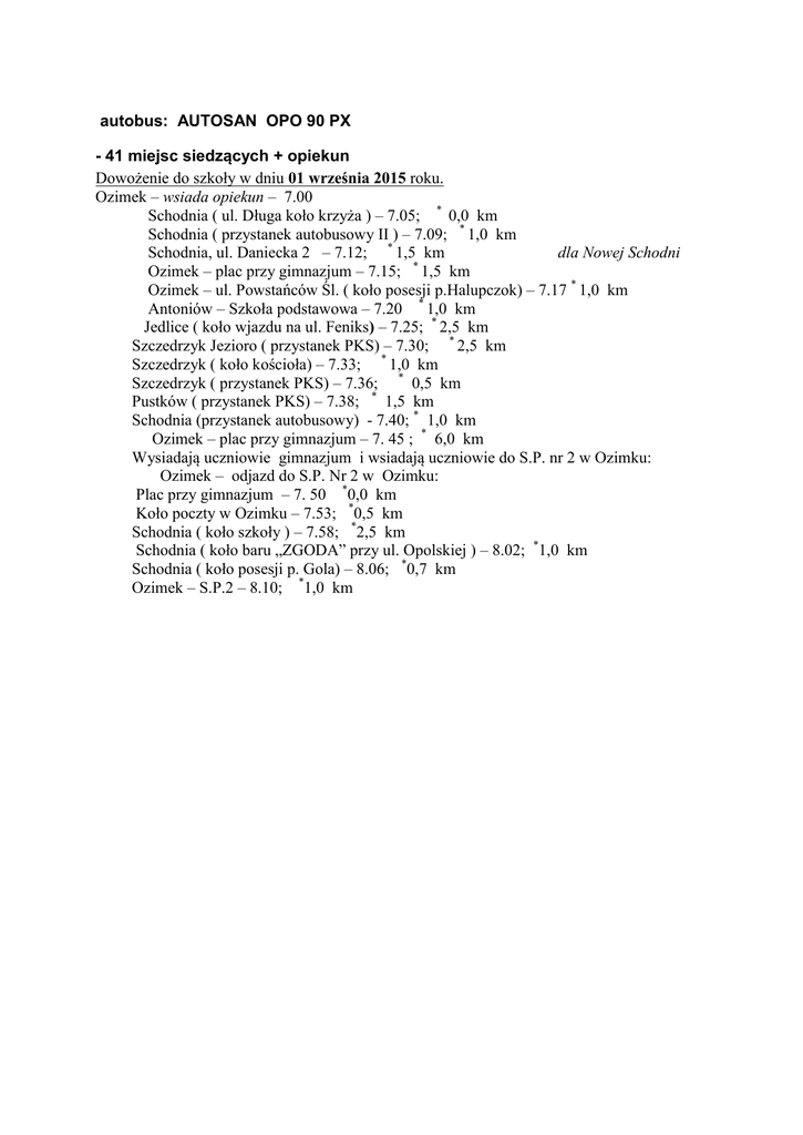 autobus: AUTOSAN OPO 90 PX - 41 miejsc siedzących + opiekun Dowożenie do szkoły w dniu 01 września 2015 roku. Ozimek – wsiada opiekun – 7.00 Schodnia ( ul. Długa koło krzyża ) – 7.05; * 0,0 km Schodnia ( przystanek autobusowy II ) – 7.09; * 1,0 km Schodnia, ul. Daniecka 2 – 7.12; * 1,5 km dla Nowej Schodni * Ozimek – plac przy gimnazjum – 7.15; 1,5 km Ozimek – ul. Powstańców Śl. ( koło posesji p.Halupczok) – 7.17 * 1,0 km Antoniów – Szkoła podstawowa – 7.20 * 1,0 km Jedlice ( koło wjazdu na ul. Feniks) – 7.25; * 2,5 km Szczedrzyk Jezioro ( przystanek PKS) – 7.30; * 2,5 km Szczedrzyk ( koło kościoła) – 7.33; * 1,0 km Szczedrzyk ( przystanek PKS) – 7.36; * 0,5 km Pustków ( przystanek PKS) – 7.38; * 1,5 km Schodnia (przystanek autobusowy) - 7.40; * 1,0 km Ozimek – plac przy gimnazjum – 7. 45 ; * 6,0 km Wysiadają uczniowie gimnazjum i wsiadają uczniowie do S.P. nr 2 w Ozimku: Ozimek – odjazd do S.P. Nr 2 w Ozimku: Plac przy gimnazjum – 7. 50 *0,0 km Koło poczty w Ozimku – 7.53; *0,5 km Schodnia ( koło szkoły ) – 7.58; *2,5 km Schodnia ( koło baru „ZGODA” przy ul. Opolskiej ) – 8.02; *1,0 km Schodnia ( koło posesji p. Gola) – 8.06; *0,7 km Ozimek – S.P.2 – 8.10; *1,0 km autobus: AUTOSAN OPO 90 PX - 41 miejsc siedzących + opiekun Powrót do domu w dniu 01 września 2015 r.- odwozi dzieci z S.P. Nr 2 w Ozimku oraz uczniów ze Schodni, Pustkowa, Jedlic i Szczedrzyka Ozimek S.P. Nr 2 w Ozimku – 10.40; *0,0 km opiekun I Schodnia ( koło posesji p.Gola) – 10.43; *1,0 km Schodnia ( koło baru „Zgoda” przy ul. Opolskiej ) – 10.49; *0,8 km Ozimek ( koło poczty) – 10.57; * 2,50 km Ozimek, plac przy gimnazjum – 11.00; *0,7 km – plac przy gimnazjum; odjazd o godz. 11.00; *0,0 km, opiekun II Szczedrzyk Jezioro ( przystanek PKS) - 11.15; *7,0 km Szczedrzyk ( koło kościoła) – 11.18; * 1,0 km Szczedrzyk ( przystanek autobusowy) – 11.21; *0,5 km Pustków ( przystanek autobusowy) – 11.25; * 2,0 km Schodnia Stara ( przystanek autobusowy ) – 11.29; *1,0 km Schodnia ( koło szkoły ) – 11.31; *1,0 km Ozimek, ul. Daniecka 2 – 11.35; *1,5 km Ozimek – przystanek PKS przy szpitalu – 11.40; * 2,0 km Jedlice ( przystanek autobusowy) – 11.45; * 4,0 km Szczedrzyk Jezioro ( przystanek PKS) - 11.52; *3,5 km Szczedrzyk ( koło kościoła) – 11.57; *1,0 km Szkoła Podstawowa w Szczedrzyku (wjazd od ulicy Nowej ) – 12.00; *1,0 km Wsiadają uczniowie Szkoły Podstawowej w Szczedrzyku Pustków ( przystanek autobusowy) – 12.02; *1,5 km Pustków ( koło kapliczki) – 12.04; *0,5 km Schodnia ( przystanek autobusowy) – 12.06; *0,5 km Schodnia (koło baru :Zgoda” przy ul. Opolskiej) – 12.10; *3,0 km Schodnia ( koło sołtysa ) – 12.12; *1,0 km Schodnia (ul. Długa koło krzyża ) – 12.16; *2,0 km Schodnia ( przystanek przy szkole) – 12.20; * 2,0 km autobus : AUTOSAN OPO 68 AC - liczba miejsc siedzących 38 miejsc + opiekun Dowożenie do szkoły w dniu 01 września 2015 roku. Ozimek – wsiada opiekun I – 7.10 Biestrzynnik ( koło posesji Pani Basaj) – 7.20 * 0,0 km Biestrzynnik (koło sklepu przy ul. Dobrodzieńskiej) – 7.22 * 0,5 km Biestrzynnik ( przystanek autobusowy) – 7.25, * 0,5 km Dylaki ( koło sklepu przy szkole ) – 7.28 * 2,0 km Dylaki ( koło zakładu ) – 7.30 * 0,15 km Dylaki (przystanek autobusowy koło poczty ) – 7.33 * 1,0 km Antoniów ( przystanek autobusowy od strony Dylak) – 7.42 * 4,0 km Ozimek - plac przy gimnazjum – 7.45; *3,8 km opiekun II Odjazd z Ozimka do Schodni – 7.47; *0,0 km Schodnia ( koło szkoły ) – 7.50; *2,5 km Schodnia ( przystanek PKS) – 7.53; *1,0 km Schodnia ( ul. Długa koło krzyża) – 7.58; *1,0 km Schodnia ( koło sołtysa ) – 8.02; * 2.0 km Schodnia ( koło baru „ZGODA „ przy ul. Opolskiej ) – 8.05; *0,5 km Pustków ( naprzeciwko starej szkoły ) – 8.08; *2,0 km Pustków ( przystanek autobusowy) – 8.10; *0,5 km Szczedrzyk – przedszkole – 8.12; *2,5 km Uczniowie ze S.P. w Szczedrzyku wysiadają przy kościele Powrót do domu w dniu 01 września 2015 r. – odwozi dzieci ze S.P. w Antoniowie oraz uczniów z Antoniowa, Dylak i Biestrzynnika S.P. Antoniów – 10.50; *0,0 km – opiekun I Ozimek: ul. Powstańców Śl.- przystanek. autobusowy - 10. 54; *1,0 km ( wysiadają uczniowie S.P. Antoniów) Ozimek – plac przy gimnazjum – opiekun II ; odjazd o godz. 11.00; *1,0 km Antoniów ( przystanek autobusowy) – 11.05; *3,8 km Dylaki ( koło poczty ) – 11.15; * 4,0 km Dylaki (koło zakładu) – 11.18; * 1,0 km Szkoła Podstawowa w Dylakch – 11.20; * 0,4 km Wsiadają uczniowie S.P. w Dylakach z Biestrzynnika Biestrzynnik ( przystanek autobusowy) - 11.35; *2,0 km Biestrzynnik ( ul. Dobrodzieńska ) – 11.38; *0,5 km Biestrzynnik ( koło posesji Pani Basaj) – 11.40; *0,5 km Ozimek – przystanek PKS przy szpitalu ; odjazd o godz. 12.00; * 10,0 km Antoniów ( przystanek autobusowy) – 12.05; * 3,0 km Dylaki ( koło poczty ) – 12.15; * 4,0 km Dylaki (koło zakładu) – 12.18; *1,0 km Biestrzynnik ( przystanek autobusowy) - 12.25; *2,0 km