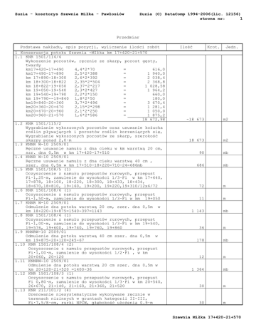 Zuzia - kosztorys Szewnia Miłka - Pawłosiów Zuzia (C) DataComp 1994-2006(lic. 12156) strona nr: 1 Przedmiar Podstawa nakładu, opis pozycji, wyliczenie ilości robót 1 Konserwacja potoku Szewnia -MIłka km 17+420-21+570 1.1 KNR 1501/114/4 Wykoszenie porostów, ręcznie ze skarp, porost gęsty, twardy km17+420-17+490 4,4*2*70 = 616,0 km17+490-17+890 2,5*2*388 = 1 940,0 km 17+890-18+300 2,6*2*392 = 2 038,4 km 18+300-18+822 2,35*2*504 = 2 368,8 km 18+822-19+050 2,37*2*217 = 1 028,58 km 19+050-19+540 2,3*2*427 = 1 964,2 km 19+540-19+790 2,2*2*150 = 660,0 km 19+790--19+840 1,8*2*50 = 180,0 km19+840-20+360 3,7*2*496 = 3 670,4 km20+360-20+670 2,15*2*298 = 1 281,4 km20+670-20+960 2,1*2*250 = 1 050,0 km20+960-21+570 1,6*2*586 = 1 875,2 18 672,98 1.2 KNR 1501/115/2 Wygrabianie wykoszonych porostów oraz usuwanie kożucha roślin pływających i porostów roślin korzeniących się, Wygrabianie wykoszonych porostów ze skarp, szerokość skarpy ponad 2,0·m 1.3 KNNR W-10 2509/01 Ręczne usuwanie namułu z dna cieku w km warstwą 20 cm, szr. dna 0,5m w km 17+420-17+510 1.4 KNNR W-10 2509/01 Ręczne usuwanie namułu z dna cieku warstwą 40 cm , szer. dna 0,5m w km 17+510-18+220=710-24=686mb 1.5 KNR 1501/108/5 (1) Oczyszczenie z namułu przepustów rurowych, przepust Fi·1,25·m, zamulenie do wysokości 1/3·Fi w km 17+640, 17+878, 18+100, 18+220, 18+300, 18+433, 18+434, 18+670,18+810, 19+160, 19+200, 19+220,19+310/12x6/72 1.6 KNR 1501/108/6 (1) Oczyszczenie z namułu przepustów rurowych, przepust Fi·1,50·m, zamulenie do wysokości 1/3·Fi w km 19+050 1.7 KNNR W-10 2509/01 Odmulenie dna potoku warstwą 20 cm, szer. dna 0,5m w km 18+220-19+875=1540-397=1143 1.8 KNR 1501/108/4 (1) Oczyszczenie z namułu przepustów rurowych, przepust Fi·1,00·m, zamulenie do wysokości 1/3·Fi w km 19+540, 19+576, 19+600, 19+740, 19+760, 19+860 1.9 KNNRW-10 2509/01 Odmulenie dna potoku warstwą 40 cm szer. dna 0,5m w km 19+875-20+120=245-67 1.10 KNR 1501/108/4 (2) Oczyszczenie z namułu przepustów rurowych, przepust Fi·1,00·m, zamulenie do wysokości 1/2·Fi , w km 20+060, 20+120 1.11 KNNRW-10 2509/01 Odmulenie dna potoku warstwą 20 cm szer. dna 0,5m w km 20+120-21+520 =1400-36 1.12 KNR 1501/108/3 (1) Oczyszczenie z namułu przepustów rurowych, przepust Fi 0,80·m, zamulenie do wysokości 1/3·Fi w km 20+540, 26+670, 21+140, 21+160, 21+360, 21+520 1.13 KNR 211/101/2 (4) Drenowanie niesystematyczne wykonywane ręcznie w terenach nizinnych w gruntach kategorii II-III, Fi·7,5/8·cm, rurki NPCW, głębokość ułożenia 0.9·m Ilość Krot. Jedn. ~18 673 m2 18 673 m2 90 mb 686 mb 72 m 11 m 1 143 mb 36 m 178 mb 12 m 1 364 mb 30 m 30 m Szewnia Miłka 17+420-21+570 Zuzia - kosztorys Szewnia Miłka - Pawłosiów Zuzia (C) DataComp 1994-2006(lic. 12156) strona nr: 2 Podstawa nakładu, opis pozycji, wyliczenie ilości robót 1.14 KNR 201/109/4 Ręczne ścinanie i karczowanie, krzaki i podszycia gęste przyjęto 10 % pow. skarp 1.15 Analiza własna Spalenie krzaków pow. jak wyżej 1.16 KNR 201/205/4 Roboty ziemne koparkami podsiębiernymi z transportem urobku samochodami samowyładowczymi do 1·km, koparka 0,25·m3, grunt kategorii III w km 15+820-16+545/wywóz namułu wraz z gruzem i nieczystościami pozostałość po wcześniejszym odmule 1.17 KNR 201/214/4 (1) Nakłady uzupełniające do tablic 0201-0213 za każde dalsze rozpoczęte 0,5·km odległości transportu, ponad 1·km samochodami samowyładowczymi, po drogach utwardzonych, grunt kategorii III-IV, samochód do 5·t Ilość Krot. Jedn. 0,19 ha 0,19 ha 64 m3 64 m3 Szewnia Miłka 17+420-21+570