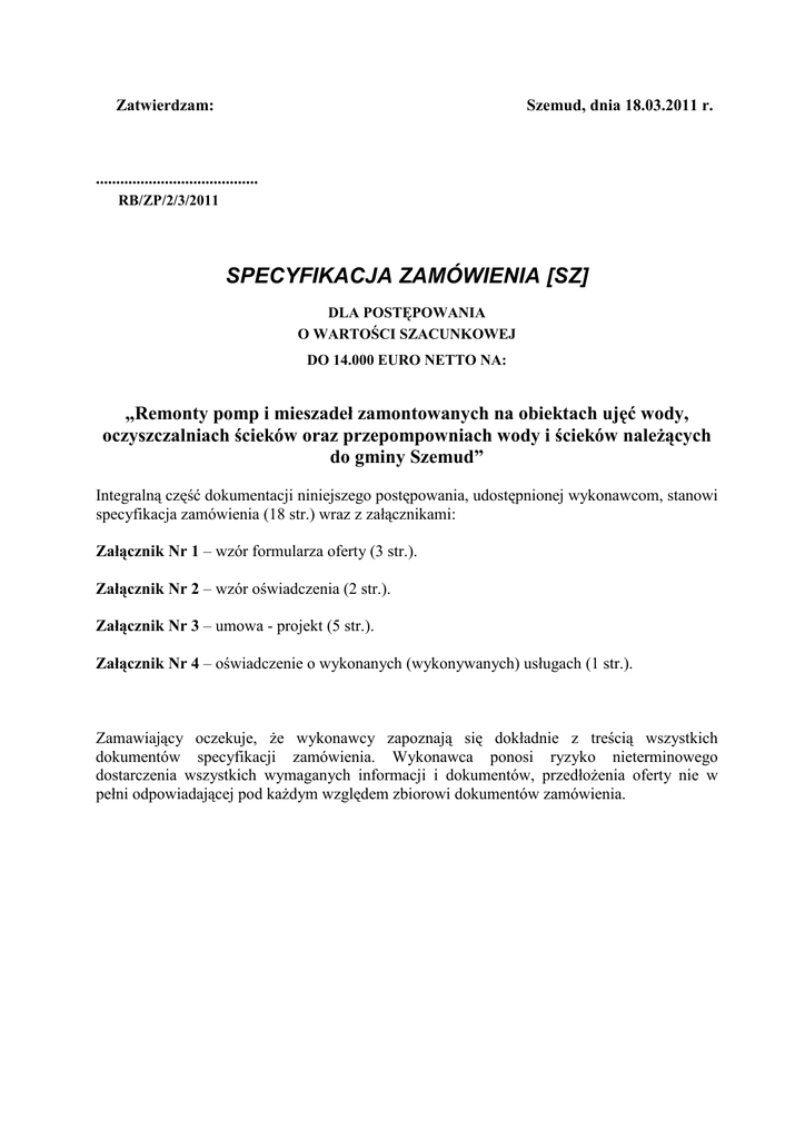 Zatwierdzam: Szemud, dnia 18.03.2011 r. ........................................ RB/ZP/2/3/2011 SPECYFIKACJA ZAMÓWIENIA [SZ] DLA POSTĘPOWANIA O WARTOŚCI SZACUNKOWEJ DO 14.000 EURO NETTO NA: „Remonty pomp i mieszadeł zamontowanych na obiektach ujęć wody, oczyszczalniach ścieków oraz przepompowniach wody i ścieków naleŜących do gminy Szemud” Integralną część dokumentacji niniejszego postępowania, udostępnionej wykonawcom, stanowi specyfikacja zamówienia (18 str.) wraz z załącznikami: Załącznik Nr 1 – wzór formularza oferty (3 str.). Załącznik Nr 2 – wzór oświadczenia (2 str.). Załącznik Nr 3 – umowa - projekt (5 str.). Załącznik Nr 4 – oświadczenie o wykonanych (wykonywanych) usługach (1 str.). Zamawiający oczekuje, Ŝe wykonawcy zapoznają się dokładnie z treścią wszystkich dokumentów specyfikacji zamówienia. Wykonawca ponosi ryzyko nieterminowego dostarczenia wszystkich wymaganych informacji i dokumentów, przedłoŜenia oferty nie w pełni odpowiadającej pod kaŜdym względem zbiorowi dokumentów zamówienia. 1. Informacje o Zamawiającym: Gmina Szemud reprezentowaną przez: Wójta Gminy Szemud – Zbigniewa Engelbrecht działającą przy pomocy Urzędu Gminy w Szemudzie przy ul. Kartuskiej 13, 84-217 Szemud przy kontrasygnacie: Skarbnika Gminy – Teresy Pustelnik tel./fax 58 676-44-28 e- mail: [email protected] www.szemud.pl 2. Tryb udzielenia zamówienia; Niniejsze postępowanie o udzielenie zamówienia publicznego prowadzone jest zgodnie z regulaminem udzielania zamówień publicznych o wartości szacunkowej do 14.000 EURO netto będący załącznikiem Nr 1 do zarządzenia Nr 71/II/2007 Wójta Gminy Szemud z dnia 11.06.2007 r. na podstawie art. 4 ust. 8 ustawy z 29 stycznia 2004 r. Prawo zamówień publicznych ( tj. Dz. U. Nr 113 z dnia 25 czerwca 2010 r., poz. 759 z późn. zm.). 3. Opis przedmiotu zamówienia „Remonty pomp i mieszadeł zamontowanych na obiektach ujęć wody, oczyszczalniach ścieków oraz przepompowniach wody i ścieków naleŜących do gminy Szemud” 3.1 Opis przedmiotu zamówienia za pomocą kodów CPV: 50.51.10.00 - 0 Usługi w zakresie napraw i konserwacji pomp 50.53.21.00 - 4 Usługi w zakresie napraw i konserwacji silników elektrycznych 3.2 Opis przedmiotu zamówienia: a) Zamówienie dotyczy remontu pomp głębinowych, pomp podnoszące ciśnienie, pomp zatapialne ściekowe i mieszadeł w przypadku wystąpienia ich awarii. - Remont dotyczy następujących urządzeń: L.p. Rodzaj urządzenia Szt. Miejsce uŜytkowania 1 Pompy głębinowe a G 60 - 4,5 kW 1 1 szt. Ujęcie wody w Będargowie b GBA 2.12 – 7,5 kW 2 1 szt. Ujęcie wody w Przetoczynie 1 szt. Ujęcie wody w Będargowie c GBA 2.18 – 7,5 kW 1 1 szt. Ujęcie wody w Częstkowie d GC 3.06 – 15,0 kW 5 1 szt. Ujęcie wody w Łebnie 2 szt. Ujęcie wody w Warznie 2 szt. Ujęcie wody w Bojanie 5 1 szt. Ujęcie wody w Łebnie 1 szt. Ujęcie wody w Leśnie 1 szt. Ujęcie wody w Szemudzkiej Hucie 2 szt. Ujęcie wody w Szemudzie e GC 3.07 – 18,0 kW f GC 3.08 – 18,0 kW 2 1 szt. Ujęcie wody w Leśnie 1 szt. Ujęcie wody w Szemudzkiej Hucie g GC 5.04 – 15,0 kW 1 1 szt. Ujęcie wody w Bojanie 2 Pompy podnoszące ciśnienie a SV 1604 F40 T - 4 kW 5 1 szt. przepompownia Warzno 4 szt. Ujęcie wody w Szemudzie 8 1 szt. przepompownia Warzno 3 szt. przepompownia Koleczkowo 3 szt. hydrofornia Bojano 1 szt. Ujęcie wody w Szemudzie b ICLV 18.40 – 4 kW 3 Pompy ściekowe a Sarlin SV 072 7,4kW 4 2 szt. przepompownia P I Kielno centrum, 2 szt. przepompownia P II Warzno centrum b Sarlin SV 032 2,7 kW 1 oczyszczalnia ścieków Kielno c Sarlin SV 032 3,2 kW 1 przepompownia P III Warzno jezioro d Amarex KSB NF65-170/042-152 - 4,0 kW 2 1 szt. przepompownia P III Warzno jezioro, 1 szt. zapasowa – oczyszczalnia ś. Kielno e Sarlin SV 024 - 1,65 kW 2 oczyszczalnia ścieków Kielno f Sarlin SV 014 1,65 kW 2 1 szt. oczyszczalnia ścieków Kielno, 1 szt. zapasowa – oczyszczalnia ś. Kielno g Amarex N S 50-172/002ULG-140 - 1,3 kW 2 przepompownia P 16 Szemud ul. Myśliwska h KRT F 80-250/54UG – 5,5 kW 3 2 szt. przepompownia PG, 1 szt. punkt zlewny – oczyszczalnia Szemud i Amarex N F 80-220/034ULG-165 – 2,6 kW 2 Przepompownia P15 Szemud ul. Wejherowska j Amarex N S 50-172/002ULG-140 - 1,65 kW 3 1 szt. przepompownia PS I 1 szt. przepompownia PSII, 1 szt. przepompownia PSIII 4 Mieszadła a Flygt ITT 1,2 kW 2 1 szt. oczyszczalnia ścieków Kielno 1 szt. zapasowe – oczyszczalnia Kielno b MZ 15 BIOX 1,5 kW 1 oczyszczalnia ścieków Kielno c AMAMIX C 335/26 UMG 3,5 kW 1 oczyszczalnia ścieków Szemud d AMAMIX V 222/24 UMG 2,5 kW 1 oczyszczalnia ścieków Szemud b) Wykonawca wykona remont pompy w czasie 7 dni od załadunku i odbioru urządzenia od Zamawiającego. c) remont urządzeń wykonywane będą w zakładzie Wykonawcy. d) Wykonawca zobowiązany jest na swoje ryzyko odebrać od Zamawiającego urządzenie do remontu i dostarczyć je Zamawiającemu po wykonanym remoncie. Koszty transportu winne być wliczone w cenę remontu, e) demontaŜ urządzeń do naprawy i montaŜ po naprawie wykonywany będzie przez Zamawiającego, f) przygotowanie do transportu urządzeń, ich odbiór i dostawę po remoncie na miejsce wskazane przez Zamawiającego naleŜeć będzie do Wykonawcy, g) cena jednostkowa remontu powinna zawierać równieŜ koszty transportu urządzeń, h) remont urządzeń musi być wykonany zgodnie z DTR lub instrukcją obsługi, która stanowiła podstawę wprowadzenia do eksploatacji, i) kaŜda pompa po przeprowadzonym remoncie musi być kompletna, j) okres gwarancji 12 miesięcy od daty przekazania urządzenia po remoncie Zamawiającemu, k) po wykonanym remoncie pompy muszą posiadać kartę gwarancyjną oraz protokół z badań końcowych. Szczegółowy zakres praw i obowiązków związanych z realizacją zamówienia określa projekt umowy stanowiący załącznik Nr 3 do SZ. 4. Termin wykonania zamówienia: - od podpisania umowy do 31.12.2011 r. 5. Opis warunk