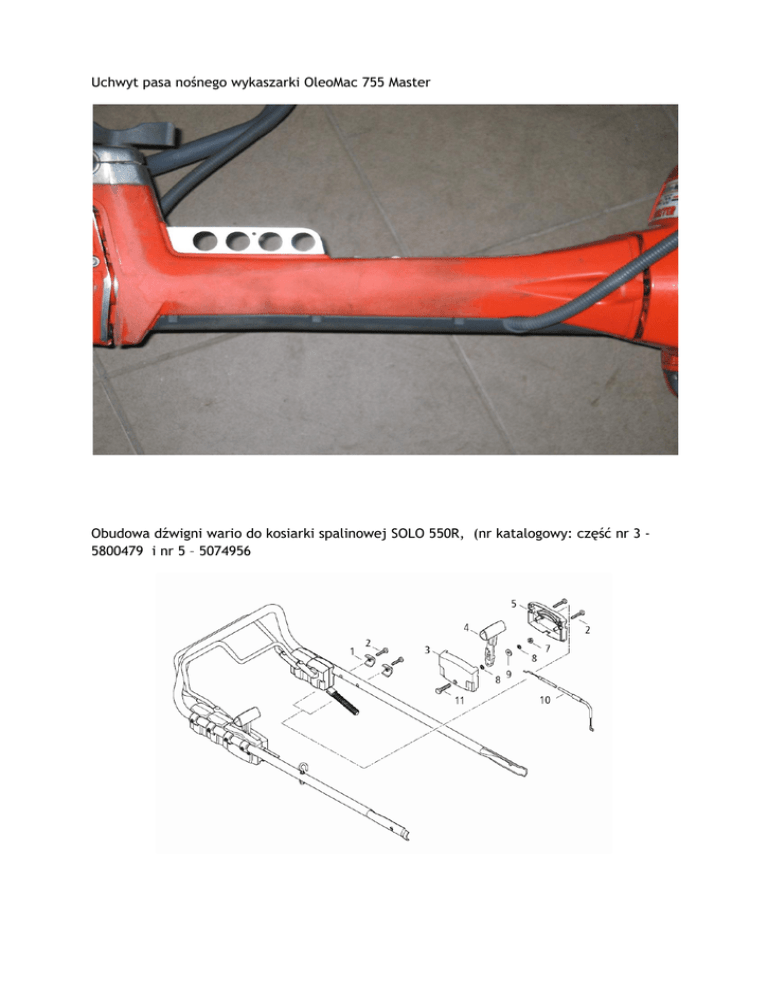 Uchwyt pasa nośnego wykaszarki OleoMac 755 Master Obudowa dźwigni wario do kosiarki spalinowej SOLO 550R, (nr katalogowy: część nr 3 5800479 i nr 5 – 5074956 Podkładka zabezpieczająca noż kosiarka SOLO 550R (nr katalogowy 0031293)