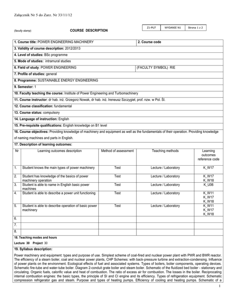 Załącznik Nr 5 do Zarz. Nr 33/11/12 Z1-PU7 COURSE DESCRIPTION (faculty stamp) 1. Course title: POWER ENGINEERING MACHINERY WYDANIE N1 Strona 1 z 2 2. Course code 3. Validity of course description: 2012/2013 4. Level of studies: BSc programme 5. Mode of studies: intramural studies 6. Field of study: POWER ENGINEERING (FACULTY SYMBOL) RIE 7. Profile of studies: general 8. Programme: SUSTAINABLE ENERGY ENGINEERING 9. Semester: 1 10. Faculty teaching the course: Institute of Power Engineering and Turbomachinery 11. Course instructor: dr hab. inż. Grzegorz Nowak, dr hab. inż. Ireneusz Szczygieł, prof. nzw. w Pol. Śl. 12. Course classification: fundamental 13. Course status: compulsory 14. Language of instruction: English 15. Pre-requisite qualifications: English knowledge on B1 level 16. Course objectives: Providing knowledge of machinery and equipment as well as the fundamentals of their operation. Providing knowledge of naming machines and parts in English. 17. Description of learning outcomes: Nr Learning outcomes description Method of assessment Teaching methods Learning outcomes reference code 1. Student knows the main types of power machinery Test Lecture / Laboratory K_W17 2. Student has knowledge of the basics of power machinery operation Student is able to name in English basic power machines Student is able to describe a power unit functioning Test Lecture / Laboratory Test Lecture / Laboratory K_W17 K_W18 K_U06 Test Lecture / Laboratory Student is able to describe operation of basic power machinery Test Lecture / Laboratory 3. 4. 5. K_W11 K_W17 K_W18 K_W11 K_W17 K_W18 6. 7. 8. 18. Teaching modes and hours Lecture 30 Project 30 19. Syllabus description: Power machinery and equipment: types and purpose of use. Simplest scheme of coal-fired and nuclear power plant with PWR and BWR reactor. The efficiency of a steam boiler, coal and nuclear power plants, CHP Schemes: with back-pressure turbine and extraction-condensing. Influence of power plants on the environment. Ecological effects of fuel and associated systems. Types of boilers, boiler components, operating devices. Schematic fire-tube and water-tube boiler. Diagram 2-conduit grate boiler and steam boiler. Schematic of the fluidized bed boiler - stationary and circulating. Organic fuels, calorific value and heat of combustion. The ratio of excess air for combustion. The losses in the boiler. Reciprocating internal combustion engines: the basic types, the principle of SI and CI engine and its efficiency. Types of refrigeration equipment. Schematic compression refrigerator gas and steam. Purpose and types of heating pumps. Efficiency of cooling and heating pumps. Schematic of a 1 complete air conditioning system. General information about thermal turbines, turbine stage, impulse and reaction turbines, the basic parameters and characteristics of the turbine constructions of steam and gas turbines, elementary and security control systems for turbines. Turbine condensers. Condenser cooling systems. Basic knowledge of compressors and fans, compressors division, examples of positive displacement compressors, blowers, and special characteristics of compressors, used compressors of different types. General information about the pumps, their distribution and construction, operating parameters of pumps, centrifugal pumps, capacity control, the use of pumps. Types of renewable energy sources. Types of hydroelectric power. Principle of operation and construction of the turbines. Wind power. The construction of wind turbines. Basic information on pipelines, valves and control apparatus - measuring the thermal power stations. Laboratory: Getting familiar with the construction and operation of machinery and equipment in the institute laboratories, the real objects of power plants and CHP plants, manufacturing plants of machinery and energy equipment. 20. Examination: no 21. Primary sources: 1. Miller Andrzej: Maszyny i urządzenia cieplne i energetyczne. Wydawnictwa Szkolne i Pedagogiczne, Warszawa, Wyd. 4, 1996 2. Biały Witold „Podstawy maszynoznawstwa”, Wyd. Pol. Śl., 2002 3. Wang, Shan K. „Handbook of Air Conditioning and Refrigeration”, McGraw-Hill, 2001 4. Matthews, Clifford, Engineers' Guide to Rotating Equipment - The Pocket Reference, John Wiley & Sons, 2001 5. Mechanical Engineer's Reference Book, edited by: Smith, Edward H., 1998 Elsevier 22. Secondary sources: 1. Chmielniak T.: Turbiny cieplne. Podstawy teoretyczne. Wyd. II. Wyd. Pol. Śl. ,Gliwice, 1998. 2. Perycz S.: Turbiny parowe i gazowe. Ossolineum 1992. 3. Stępniewski M.: Pompy. WNT, Warszawa, 1978. 4. Witkowski A.: Sprężarki wirnikowe. Teoria, konstrukcja, eksploatacja. Wydawnictwo Pol, Śl., Wyd. I, Gliwice 2004 23. Total workload required to achieve learning outcomes Lp. Teaching mode : Contact hours / Student workload hours 1 Lecture 30 / 30 2 Classes / 3 Laboratory 4 Project / 5 BA/ MA Seminar / 6 Other / 15 / 15 Total number of hours 45 / 45 24. Total hours: 90 25. Number of ECTS credits: 3 26. Number of ECTS credits allocated for contact hours: 2 27. Number of ECTS credits allocated for in-practice hours (laboratory classes, projects): 1 26. Comments: Approved: ……………………………. (date, Instructor’s signature) ………………………………………………… (date , the Director of the Faculty Unit signature) 2
